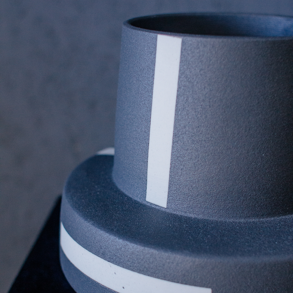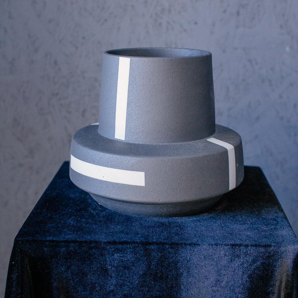 Глубокий тёмно-серый оттенок с белыми полосами создаёт стильный и выразительный образ. Широкая форма идеально подходит для объёмных букетов и композиций. Отлично впишется в гостиную или офис; подходит для букетов размеров L и XL.