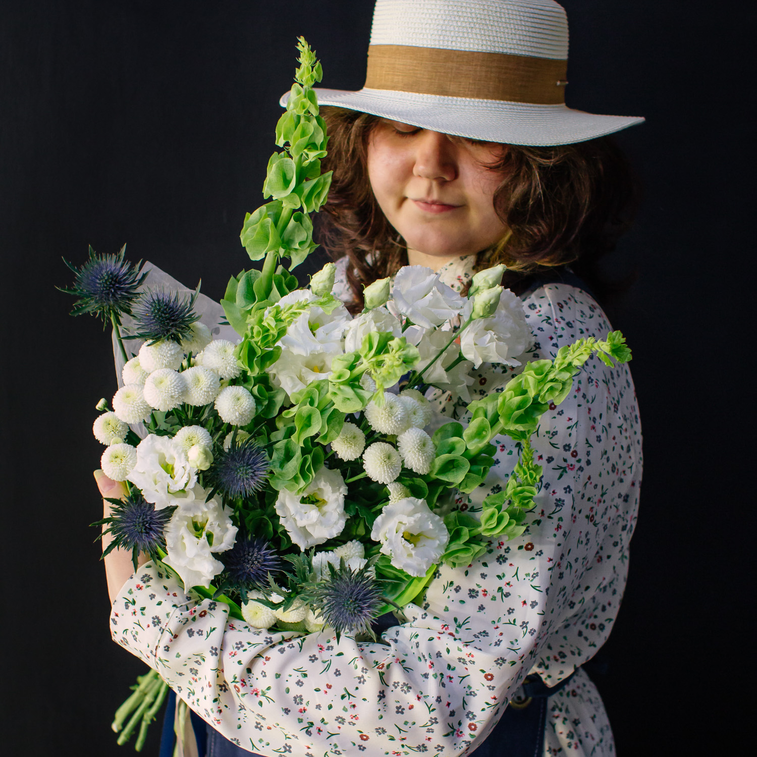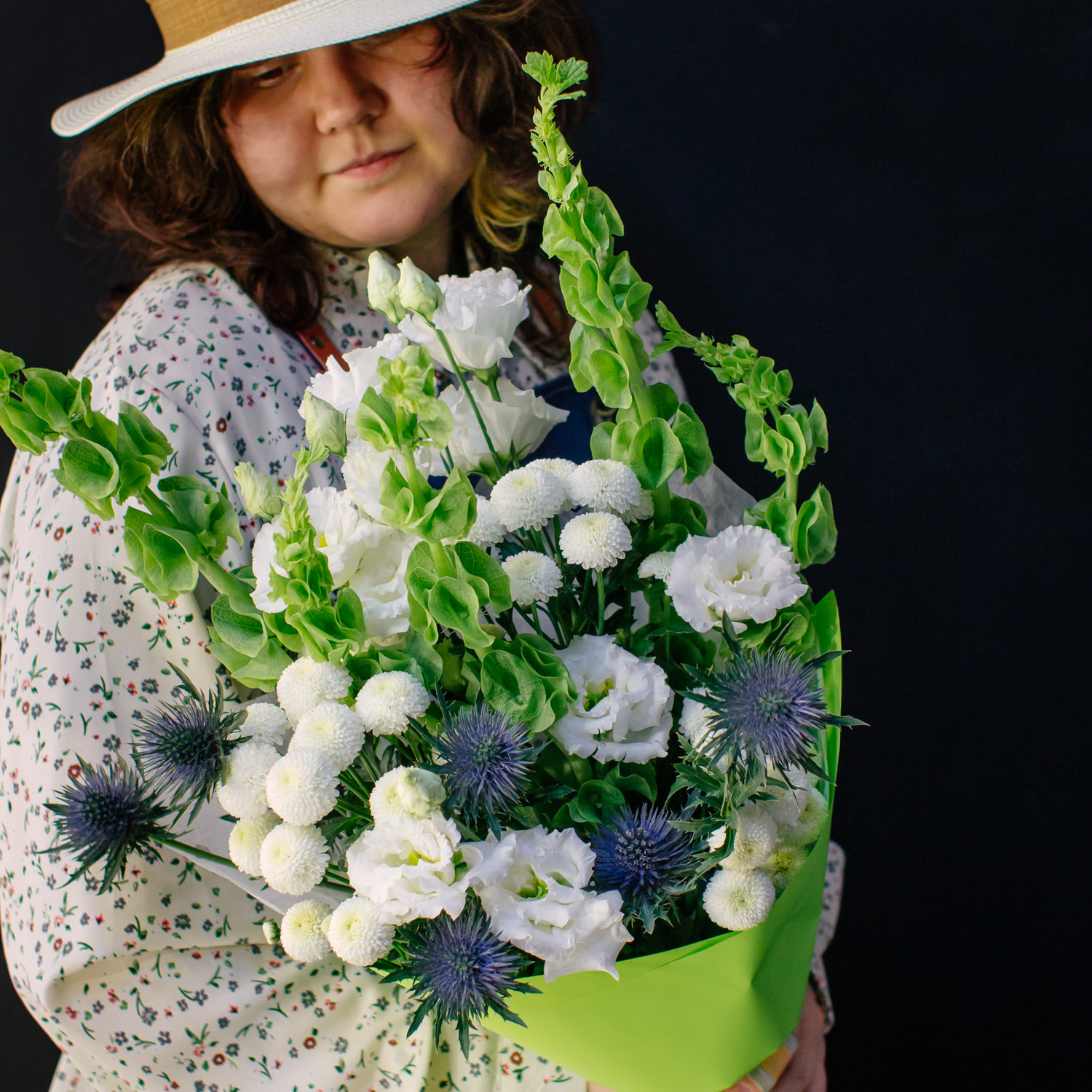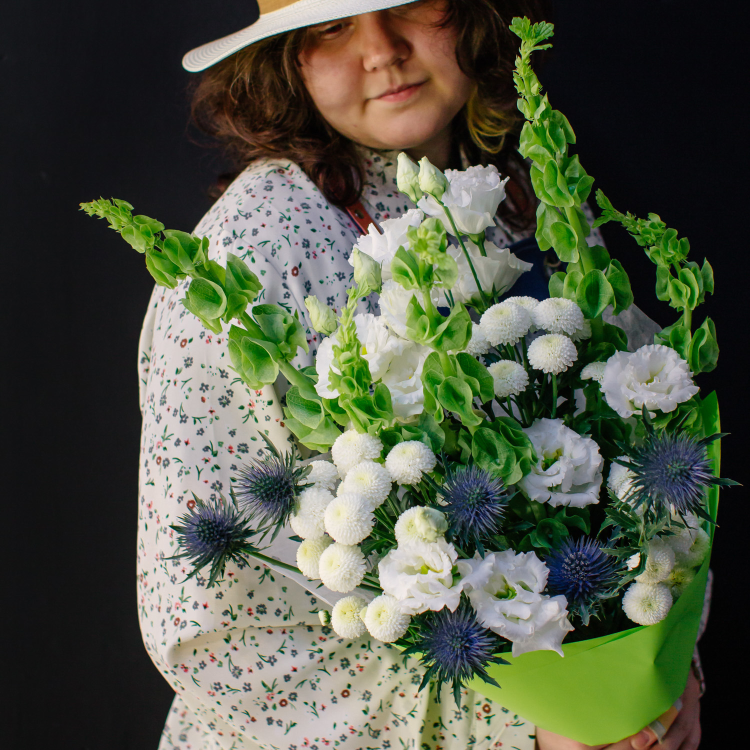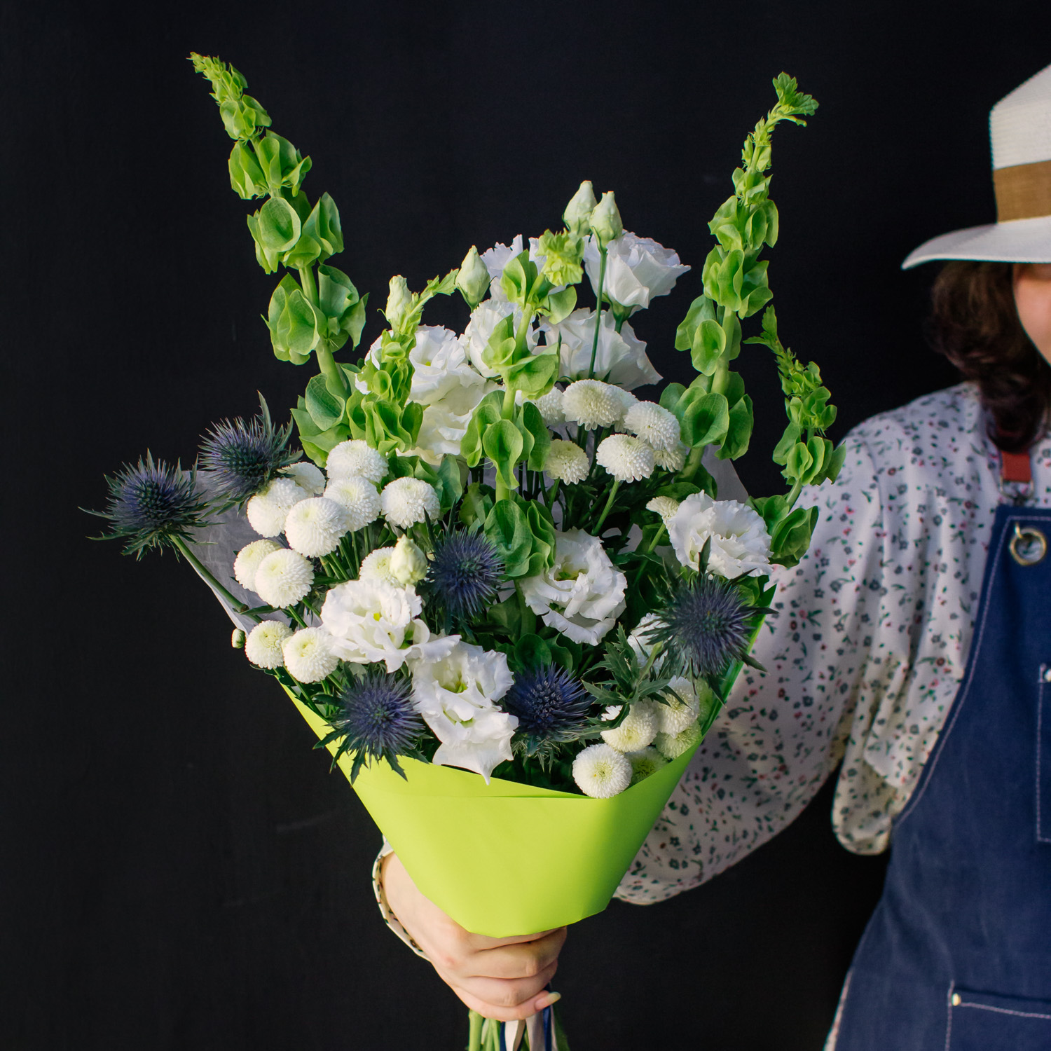 Современный букет с молюцеллой, эрингиумом, кустовой хризантемой Ньютон и эустомой сорта Алиса.