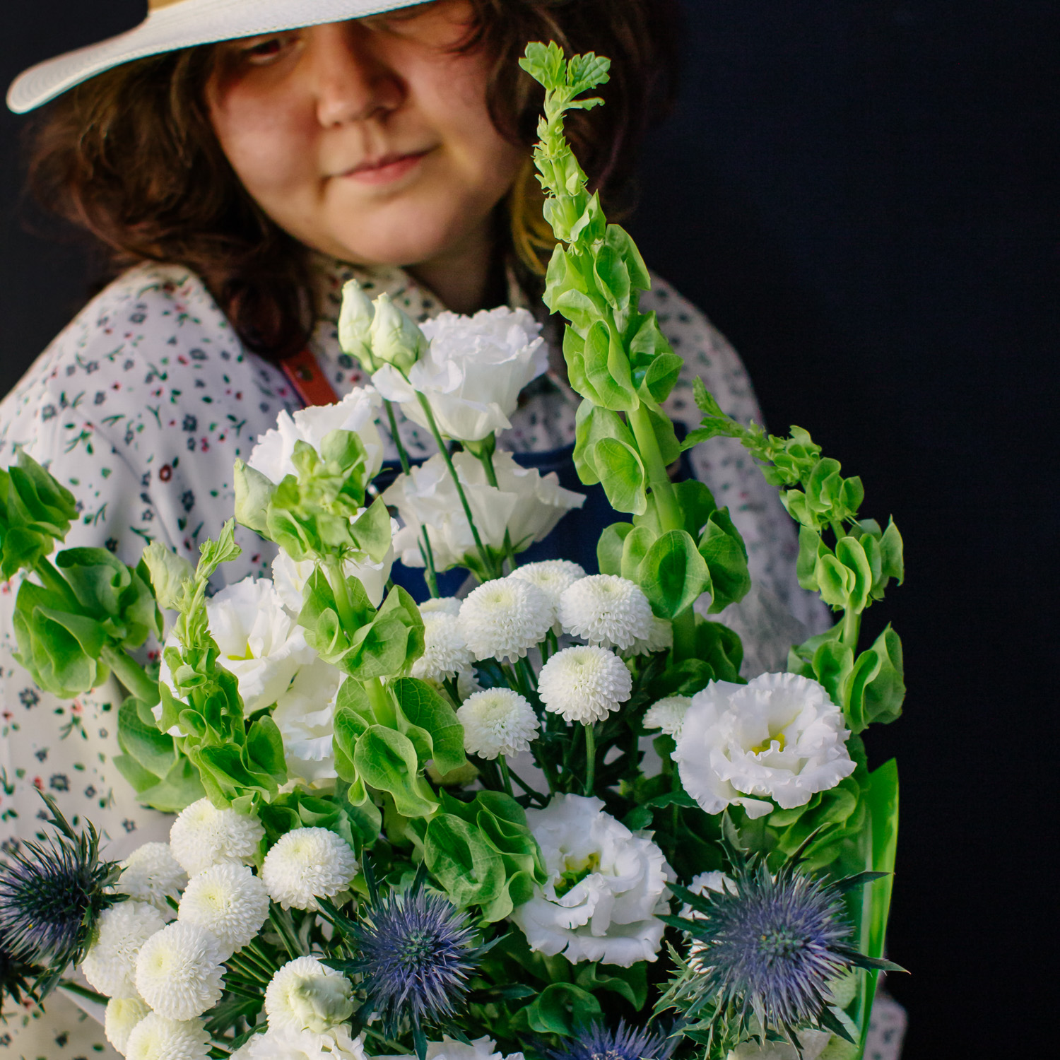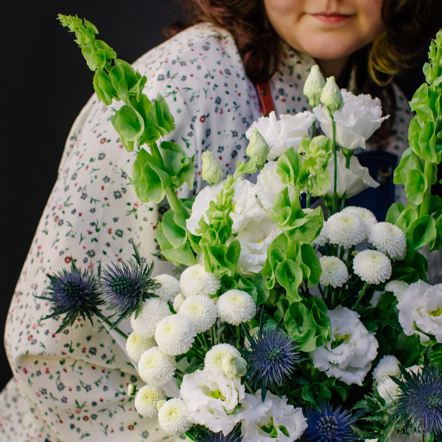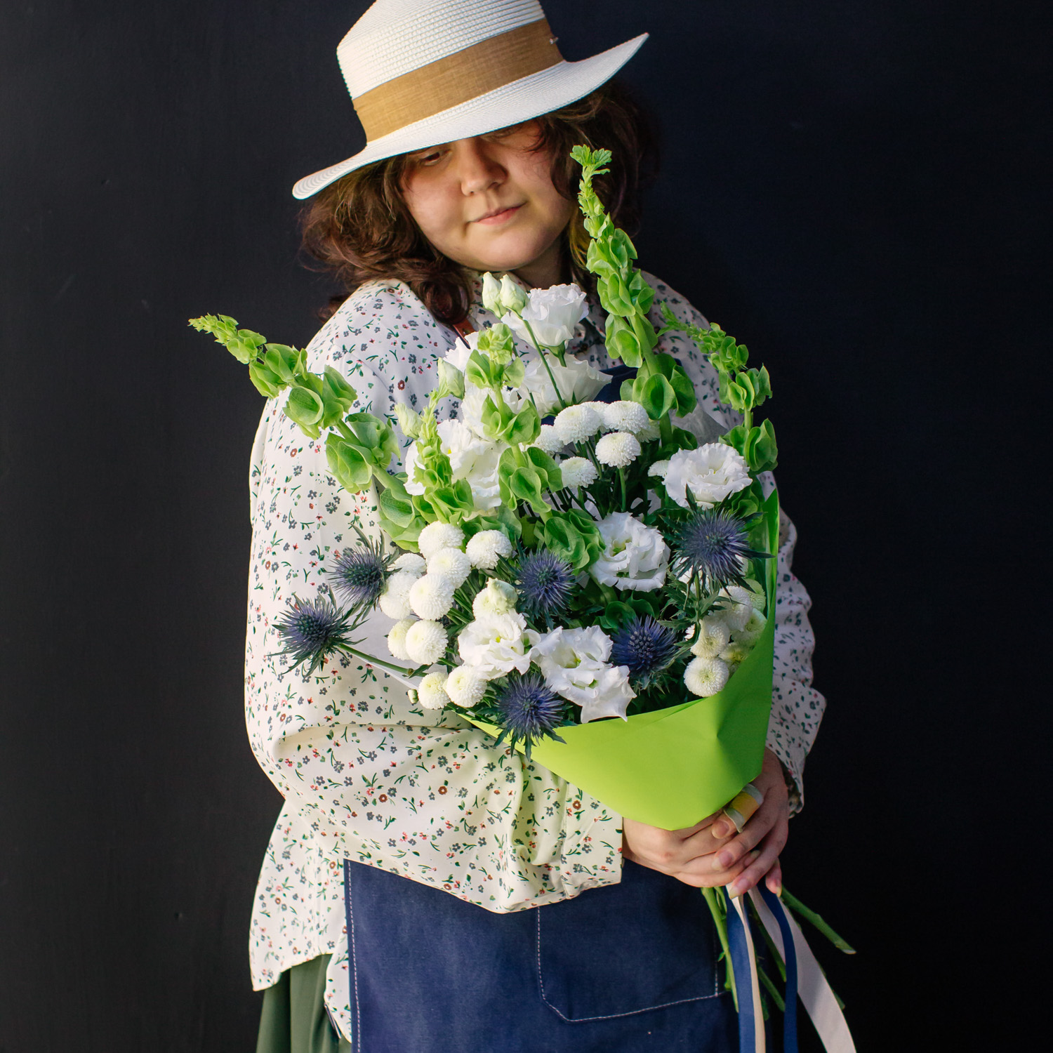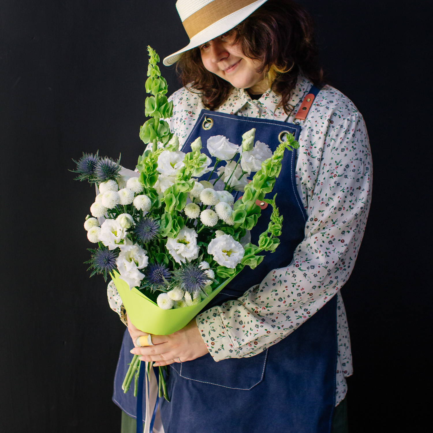 Современный букет с молюцеллой, эрингиумом, кустовой хризантемой Ньютон и эустомой сорта Алиса.