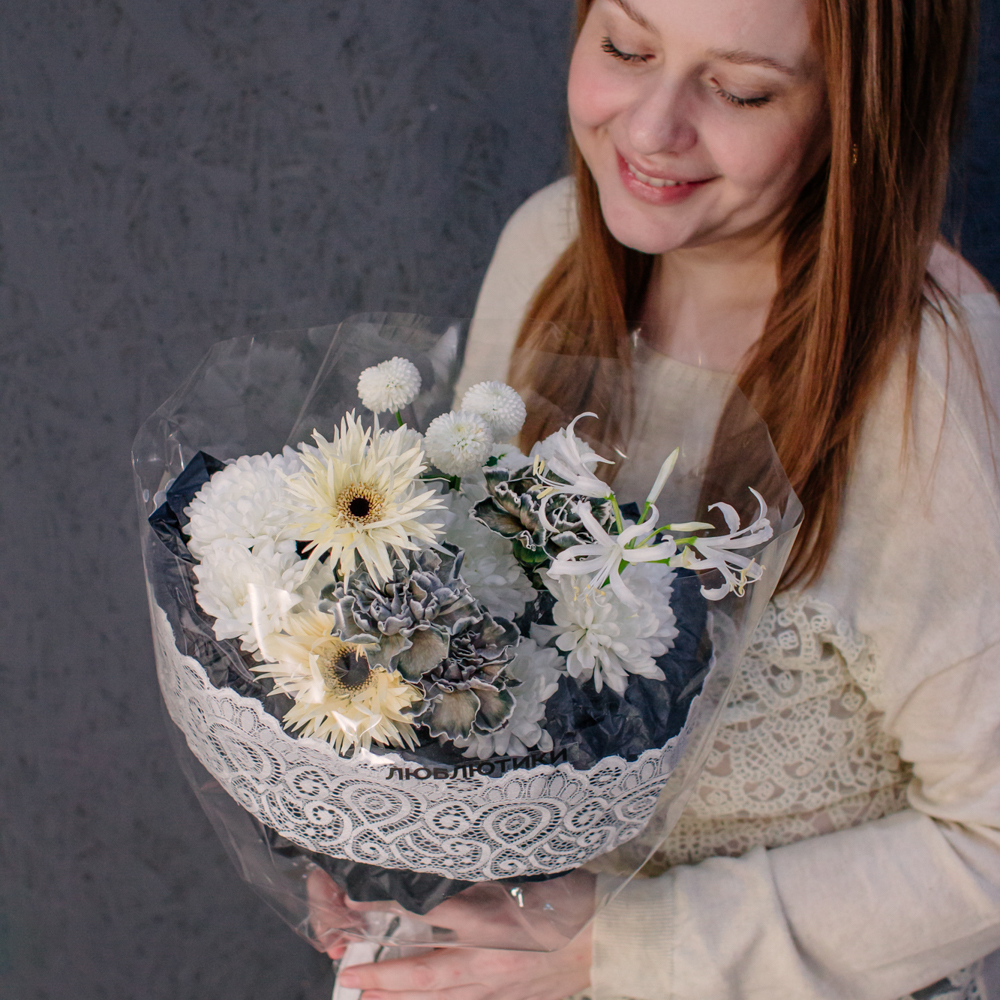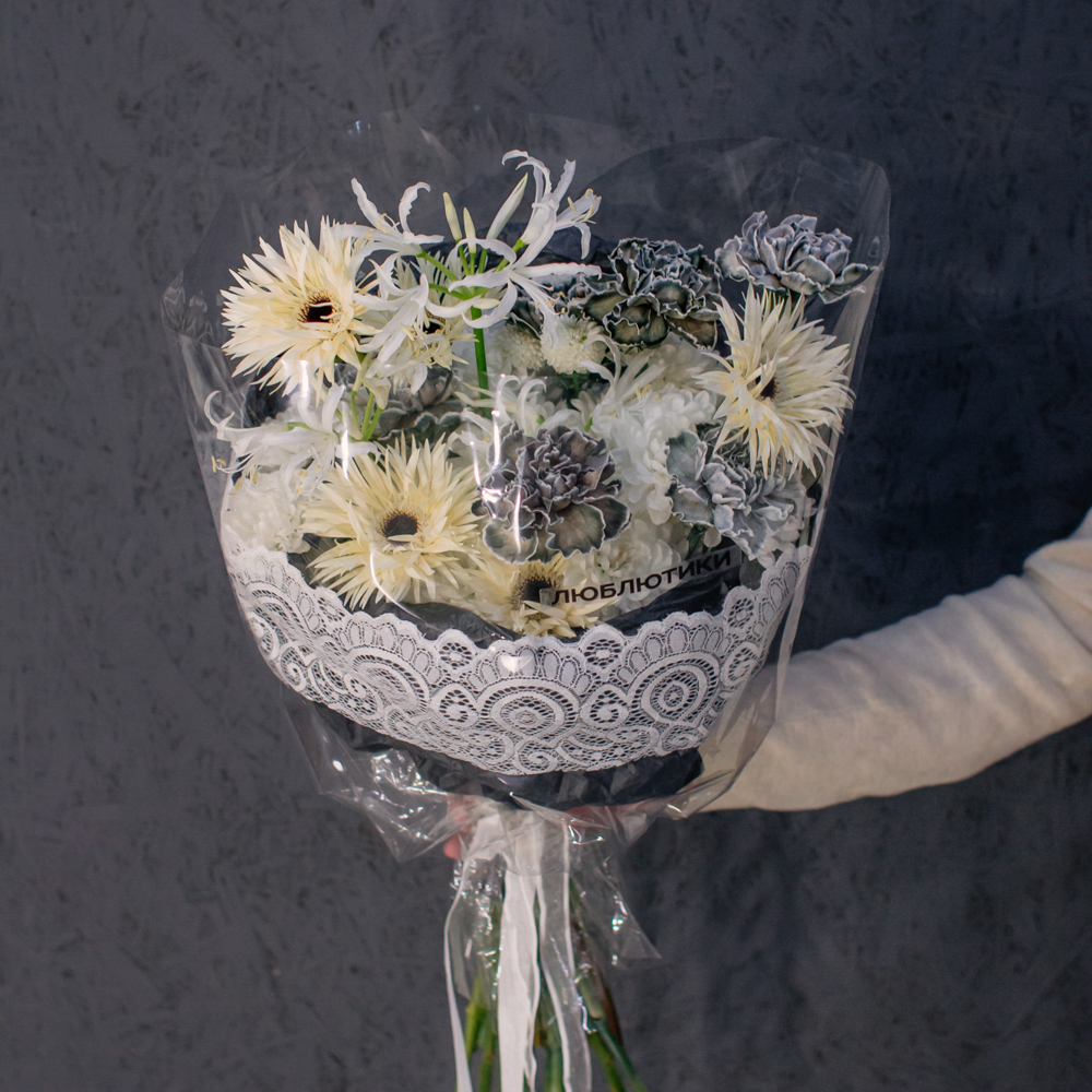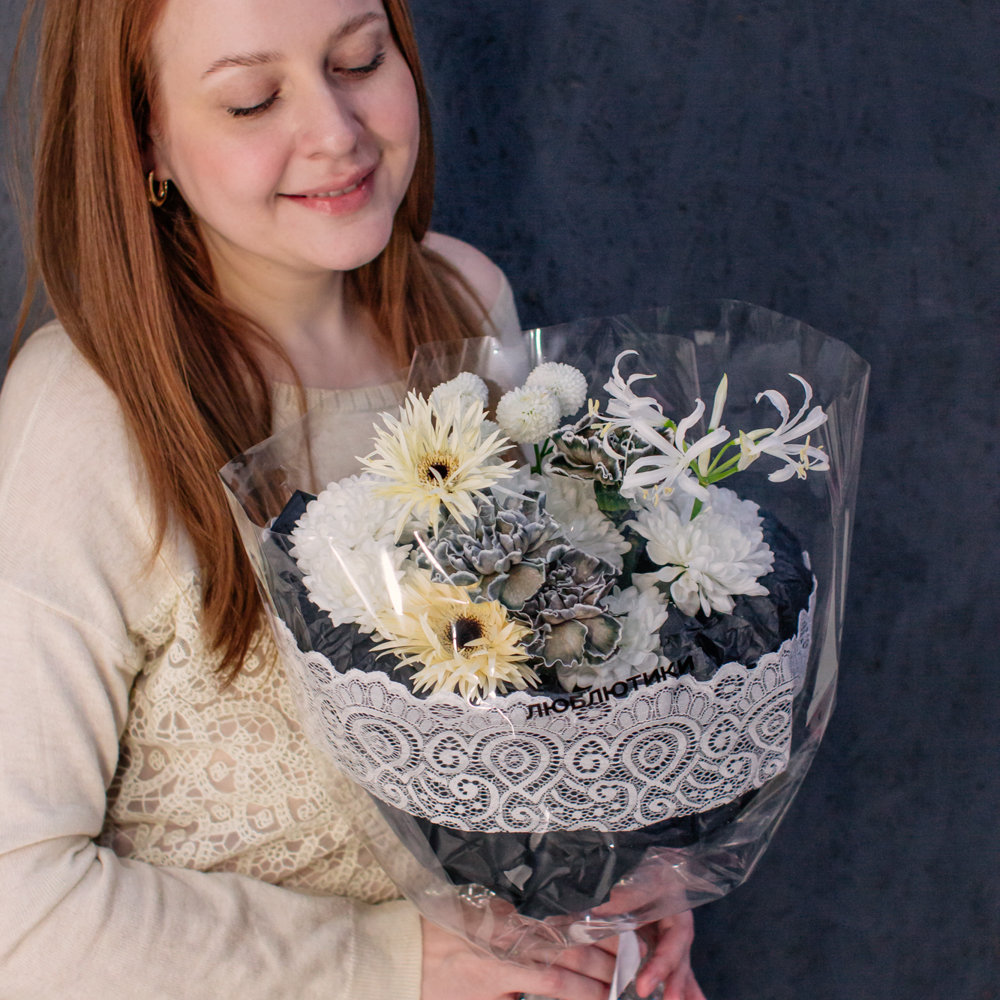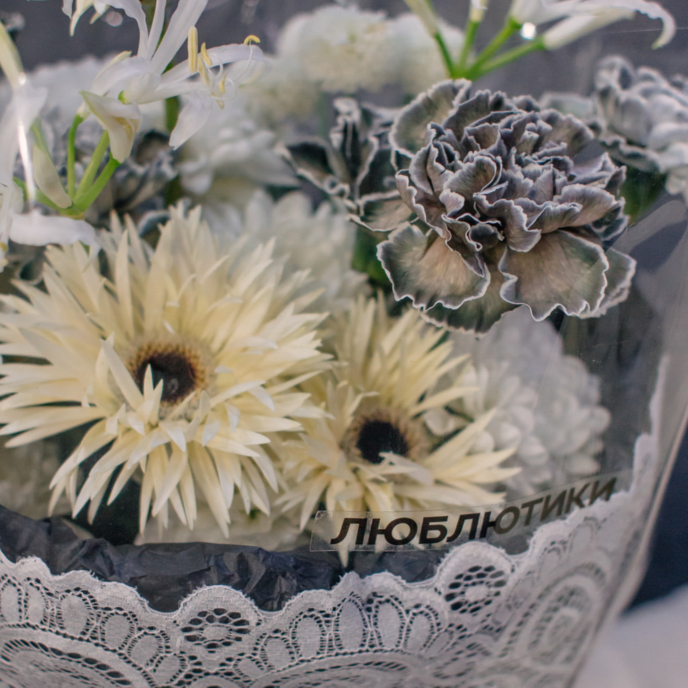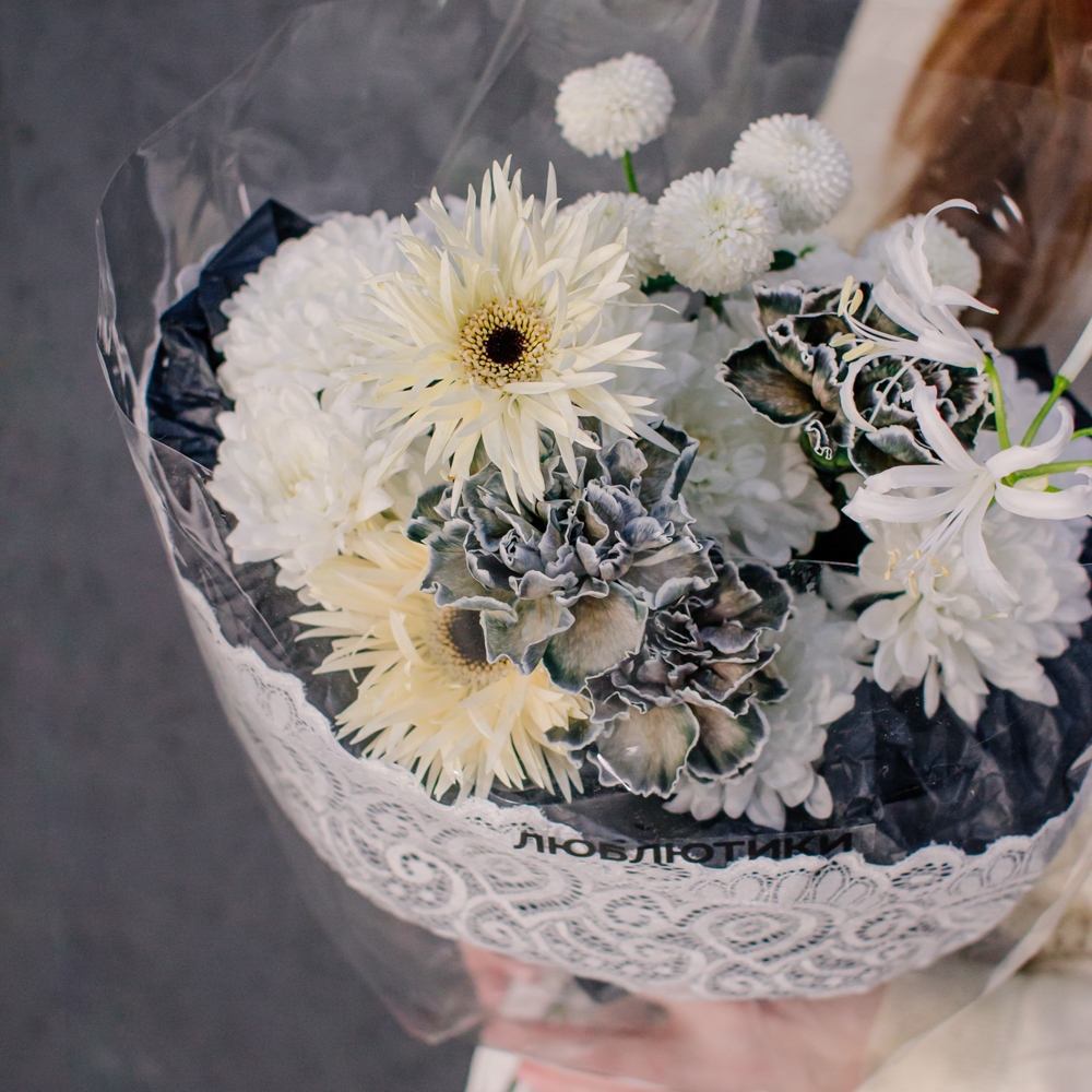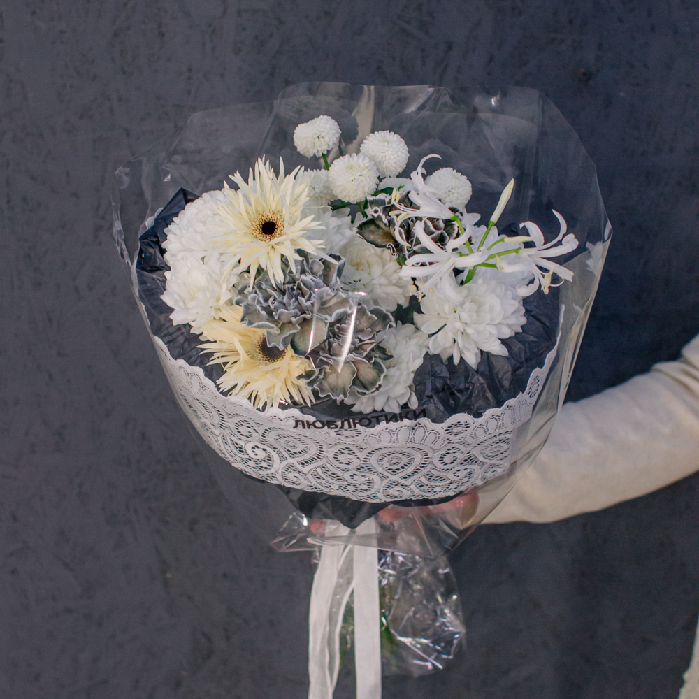 Кремовые гермини задают ритм и динамику композиции, чёрные диантусы добавляют глубину и выразительный контраст, а кустовая хризантема смягчает образ. Нерине в чистом белом оттенке становится изящным акцентом, придавая букету утончённость и баланс.