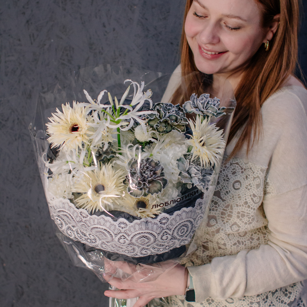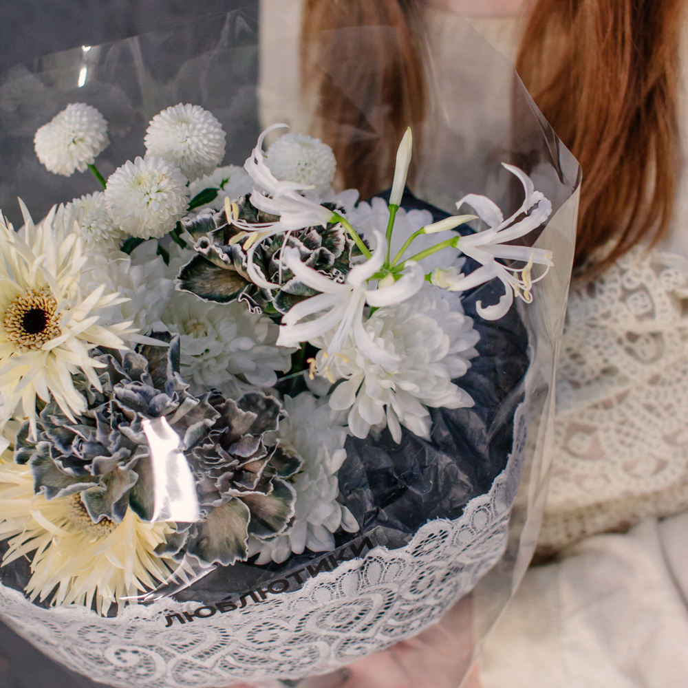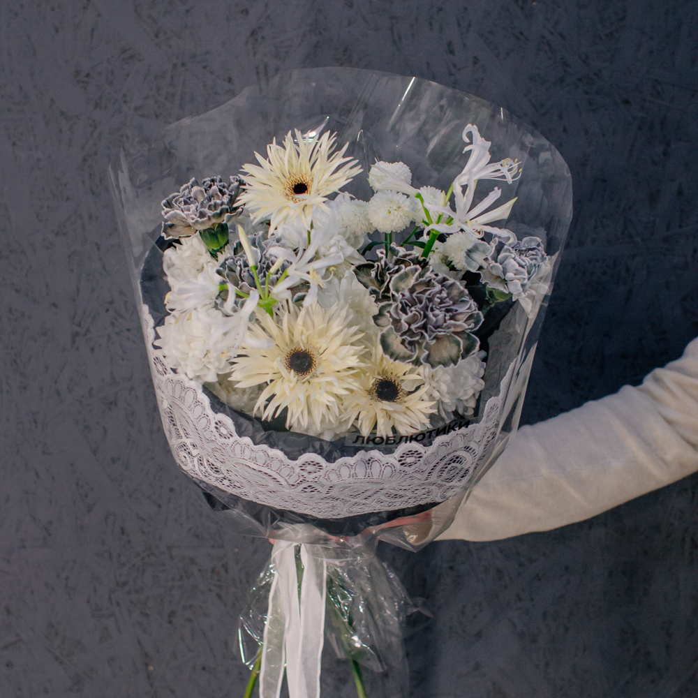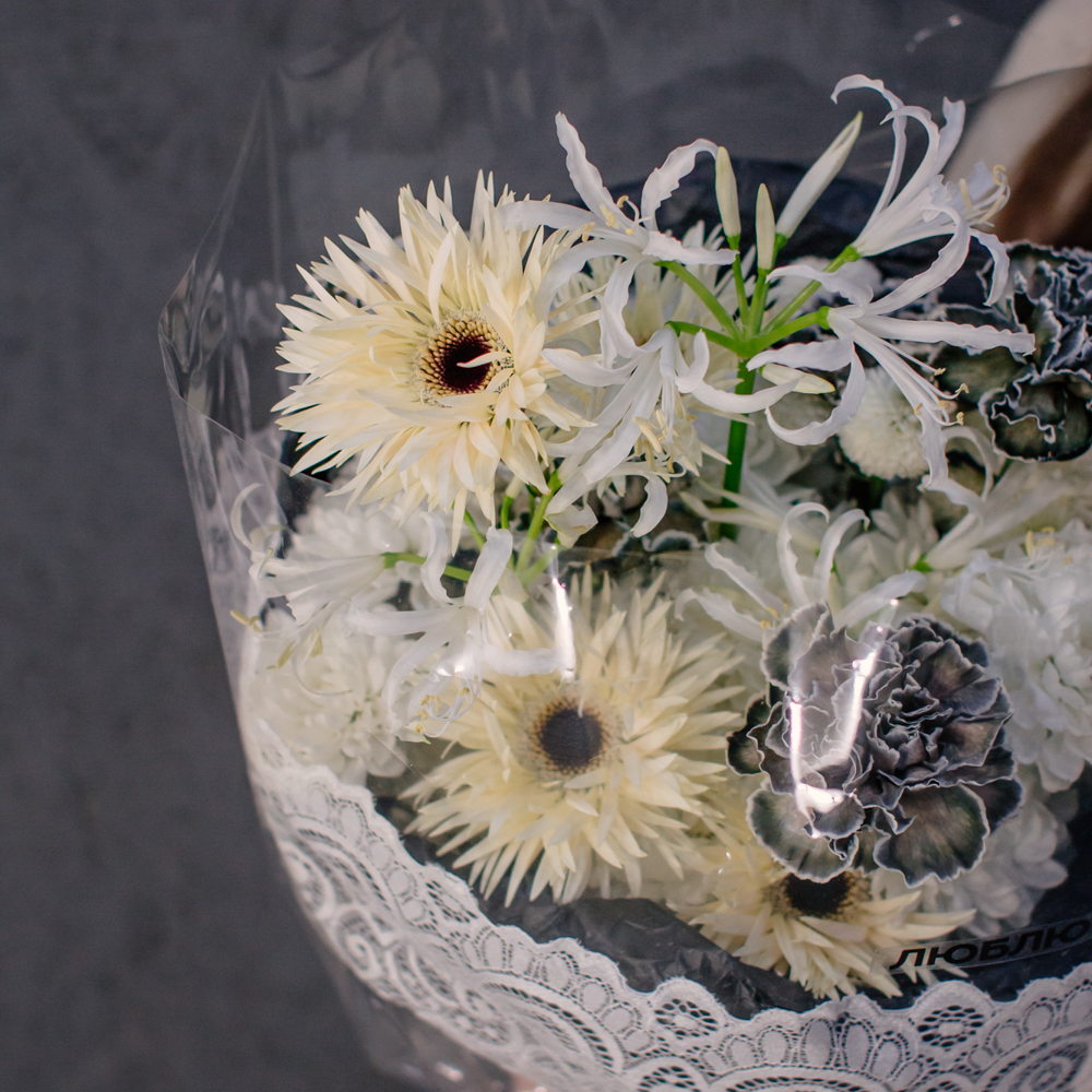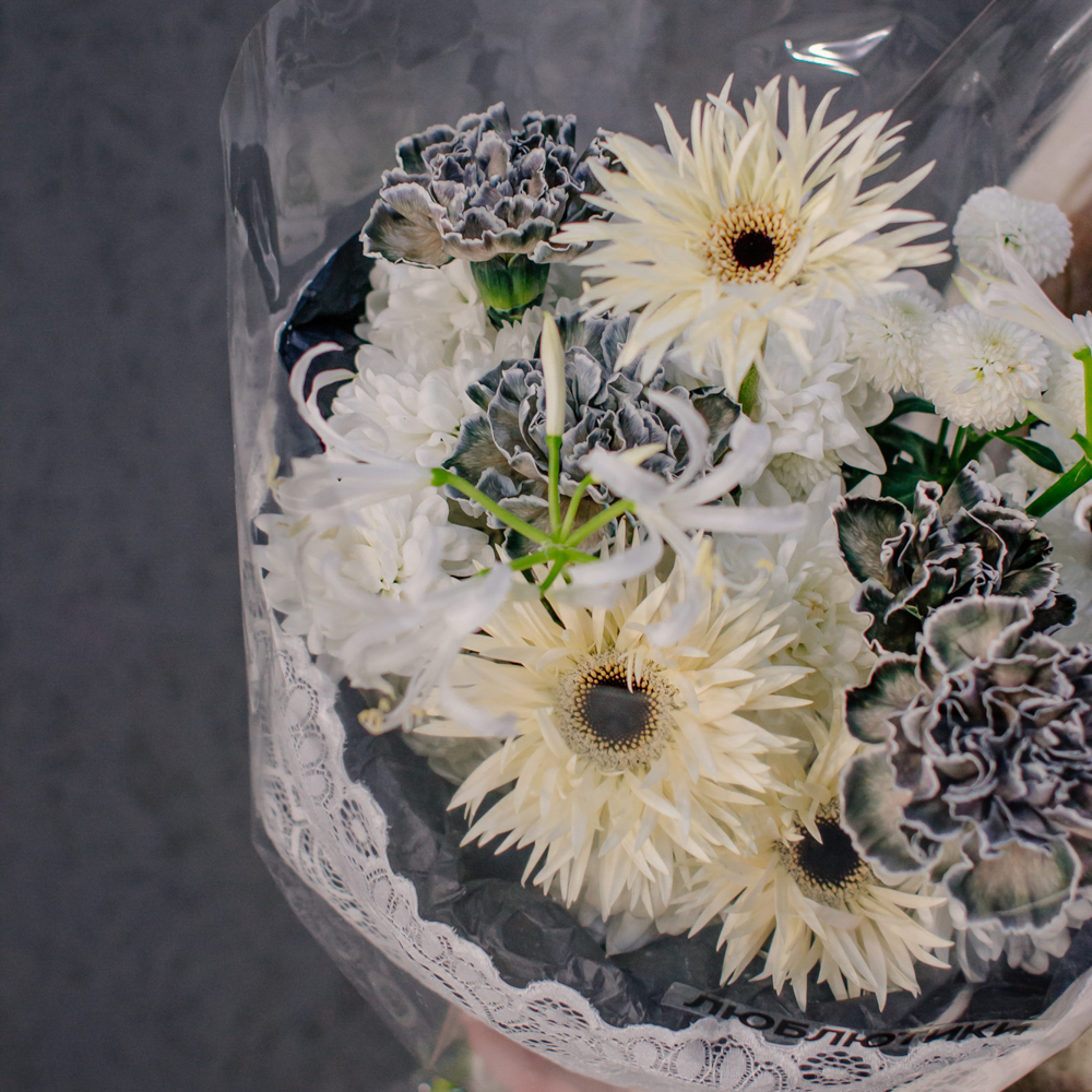 Кремовые гермини задают ритм и динамику композиции, чёрные диантусы добавляют глубину и выразительный контраст, а кустовая хризантема смягчает образ. Нерине в чистом белом оттенке становится изящным акцентом, придавая букету утончённость и баланс.