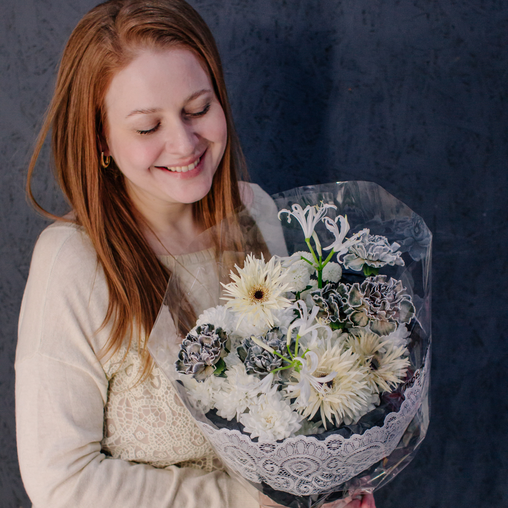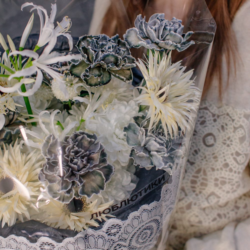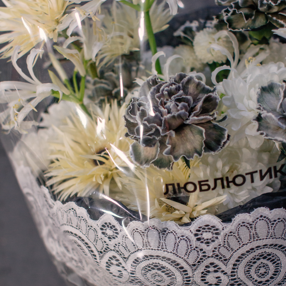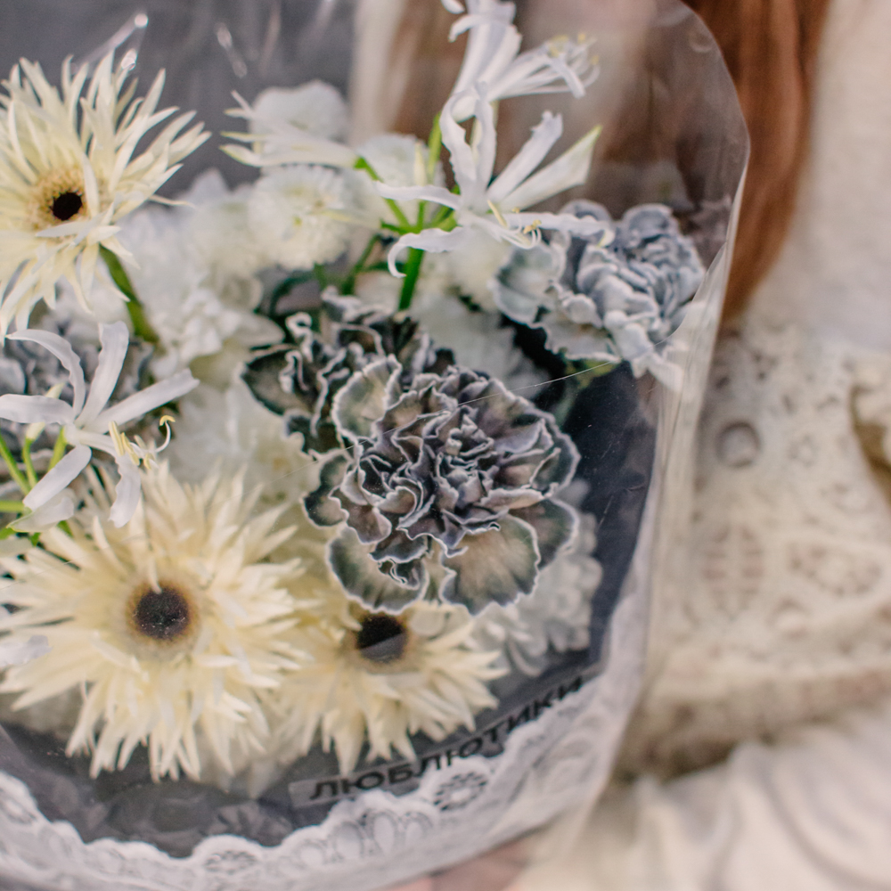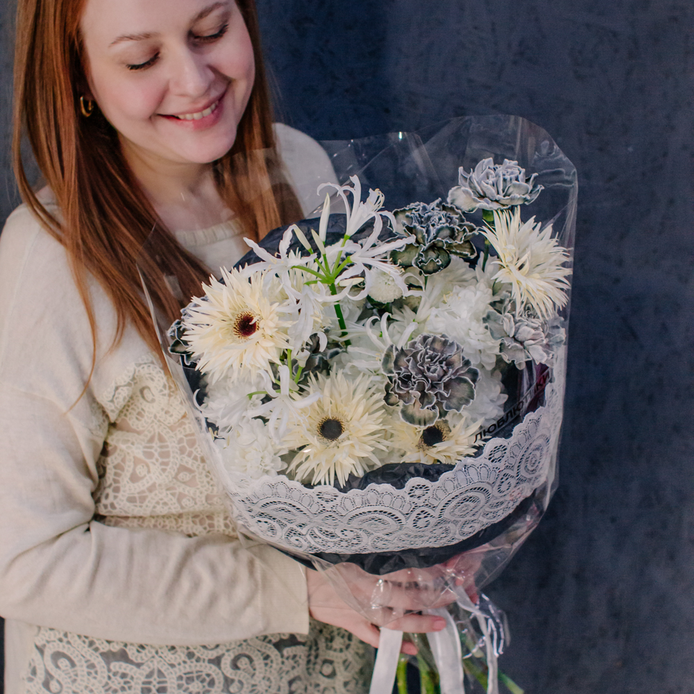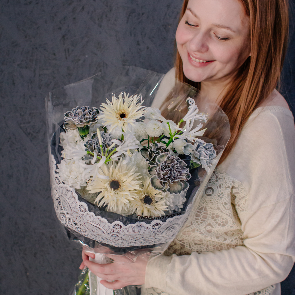 Кремовые гермини задают ритм и динамику композиции, чёрные диантусы добавляют глубину и выразительный контраст, а кустовая хризантема смягчает образ. Нерине в чистом белом оттенке становится изящным акцентом, придавая букету утончённость и баланс.