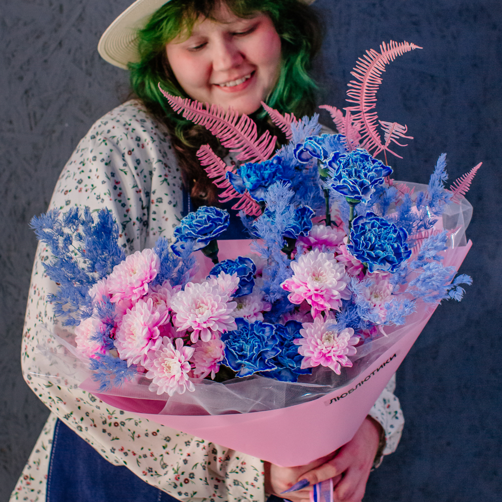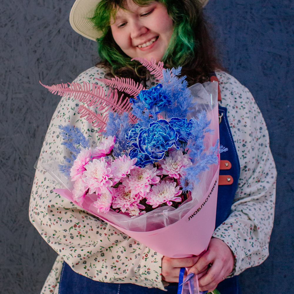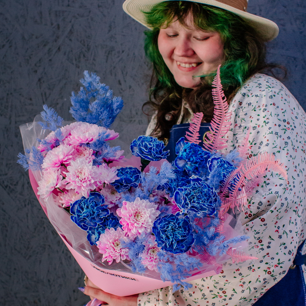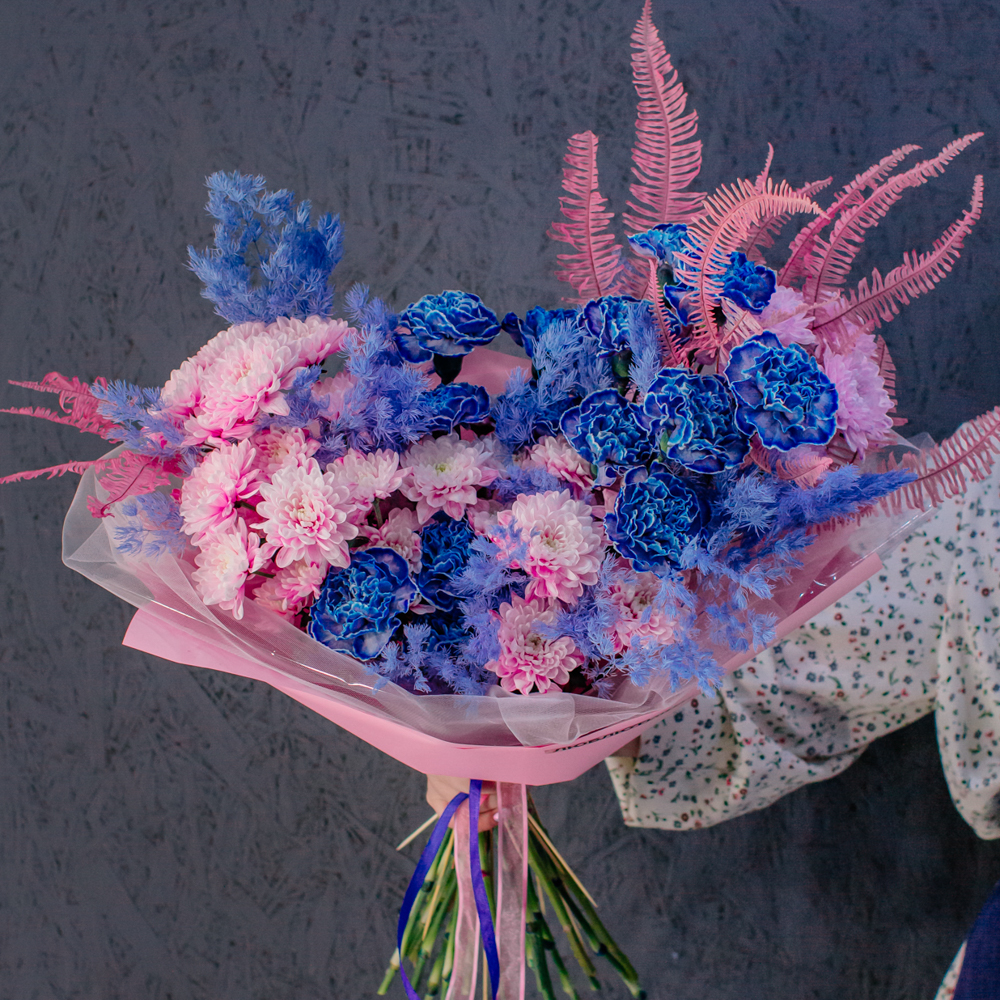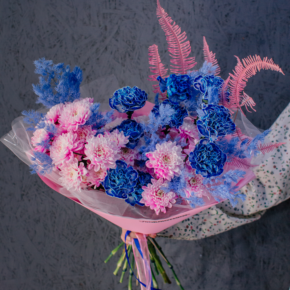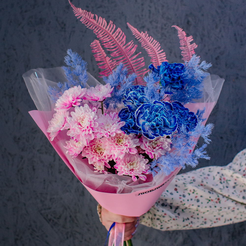 Нежный и одновременно выразительный букет с розовыми хризантемами, синими гвоздиками и пушистыми стабилизированными акцентами. Голубой аспарагус и розовая амбрелла добавляют композиции лёгкость, фактуру и воздушность, создавая ощущение мягкого облака из оттенков и настроений.