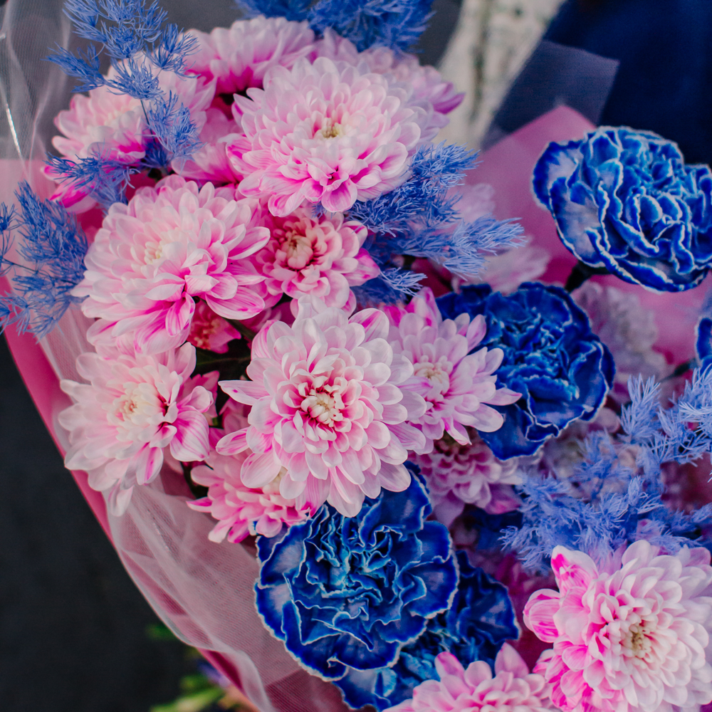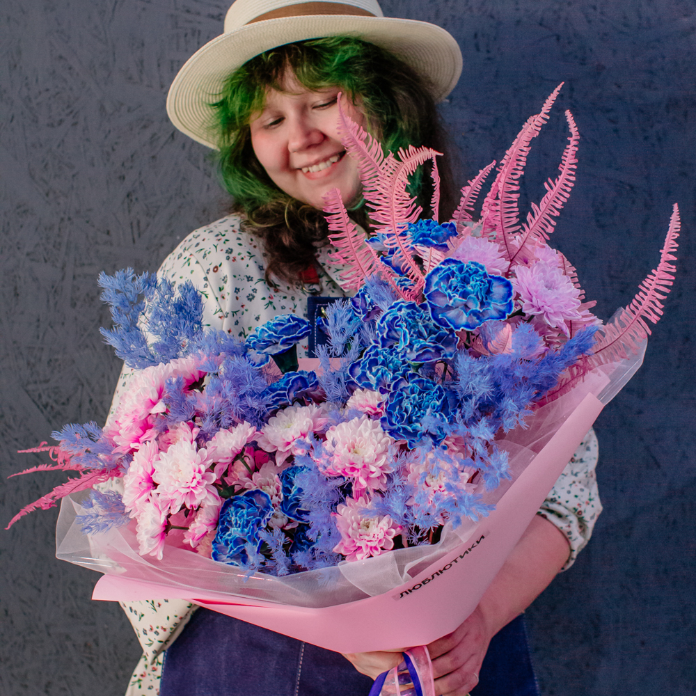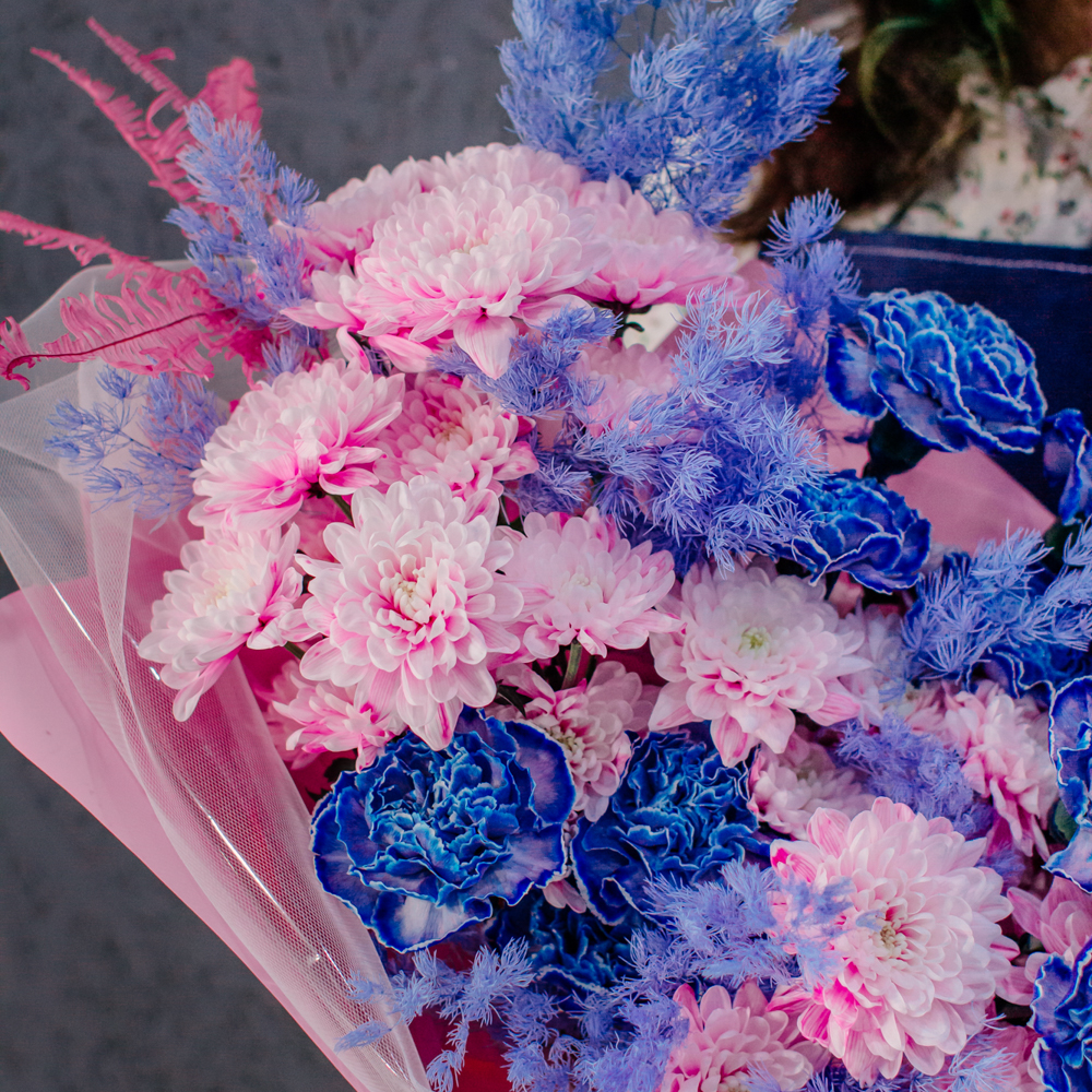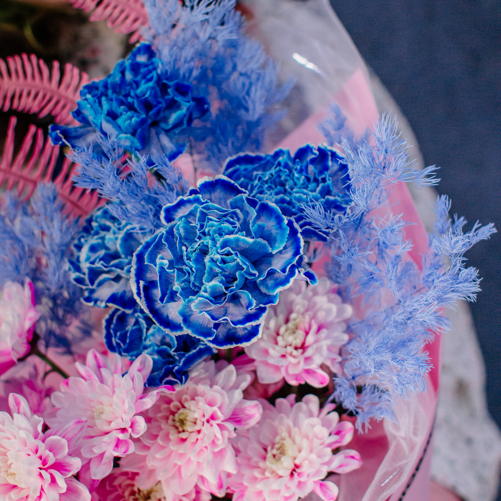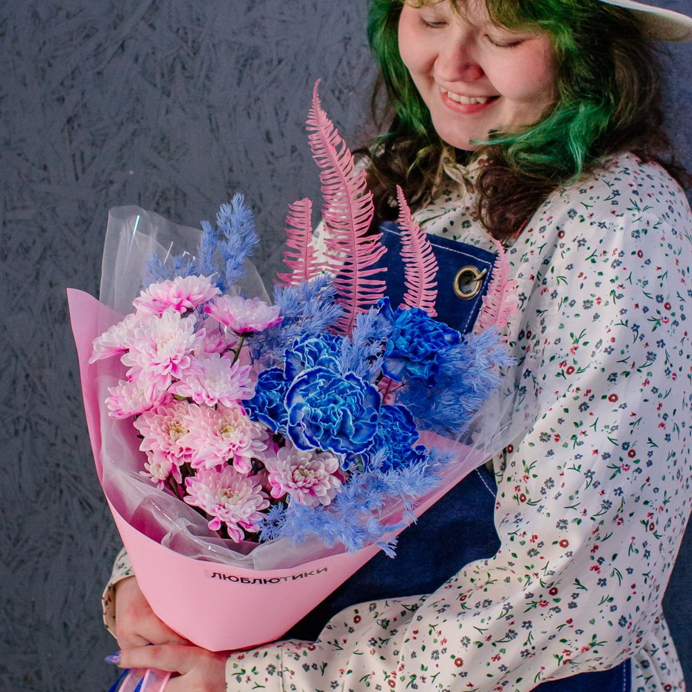 Нежный и одновременно выразительный букет с розовыми хризантемами, синими гвоздиками и пушистыми стабилизированными акцентами. Голубой аспарагус и розовая амбрелла добавляют композиции лёгкость, фактуру и воздушность, создавая ощущение мягкого облака из оттенков и настроений.
