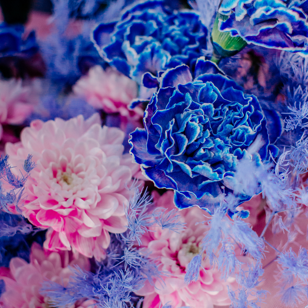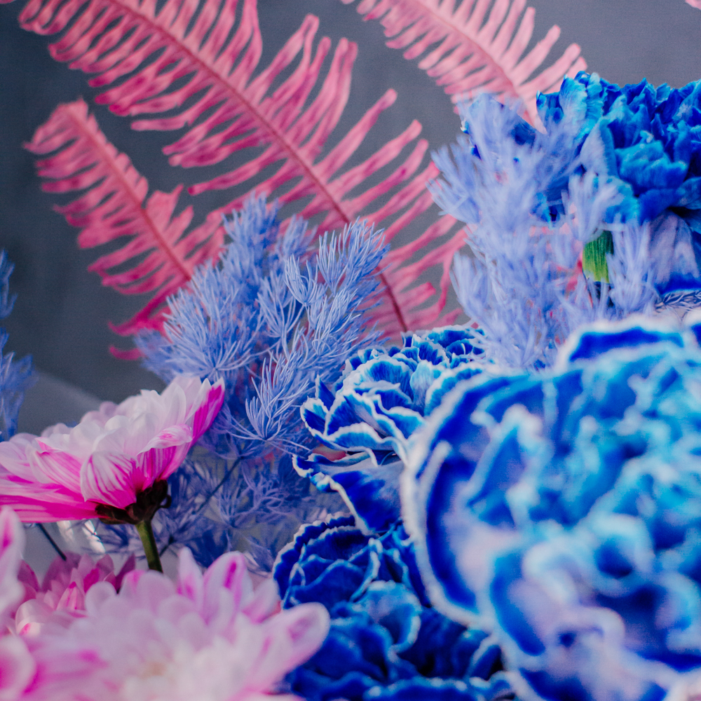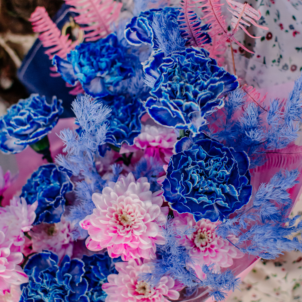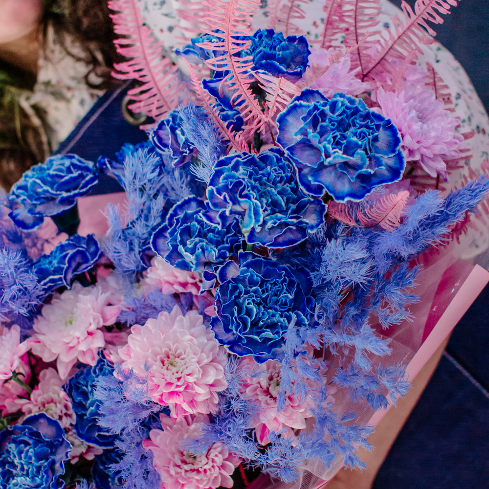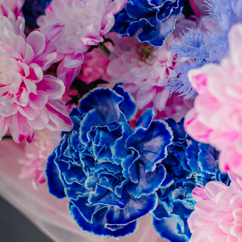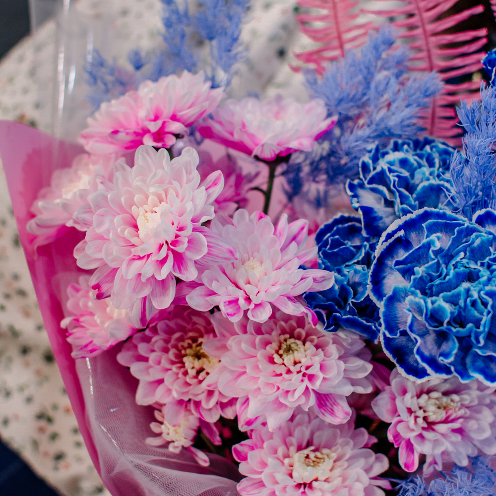 Нежный и одновременно выразительный букет с розовыми хризантемами, синими гвоздиками и пушистыми стабилизированными акцентами. Голубой аспарагус и розовая амбрелла добавляют композиции лёгкость, фактуру и воздушность, создавая ощущение мягкого облака из оттенков и настроений.