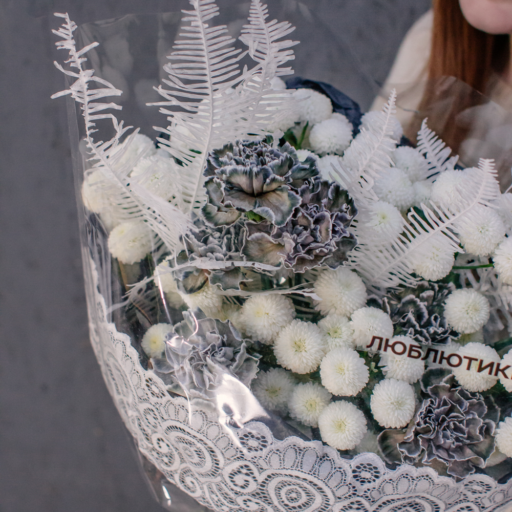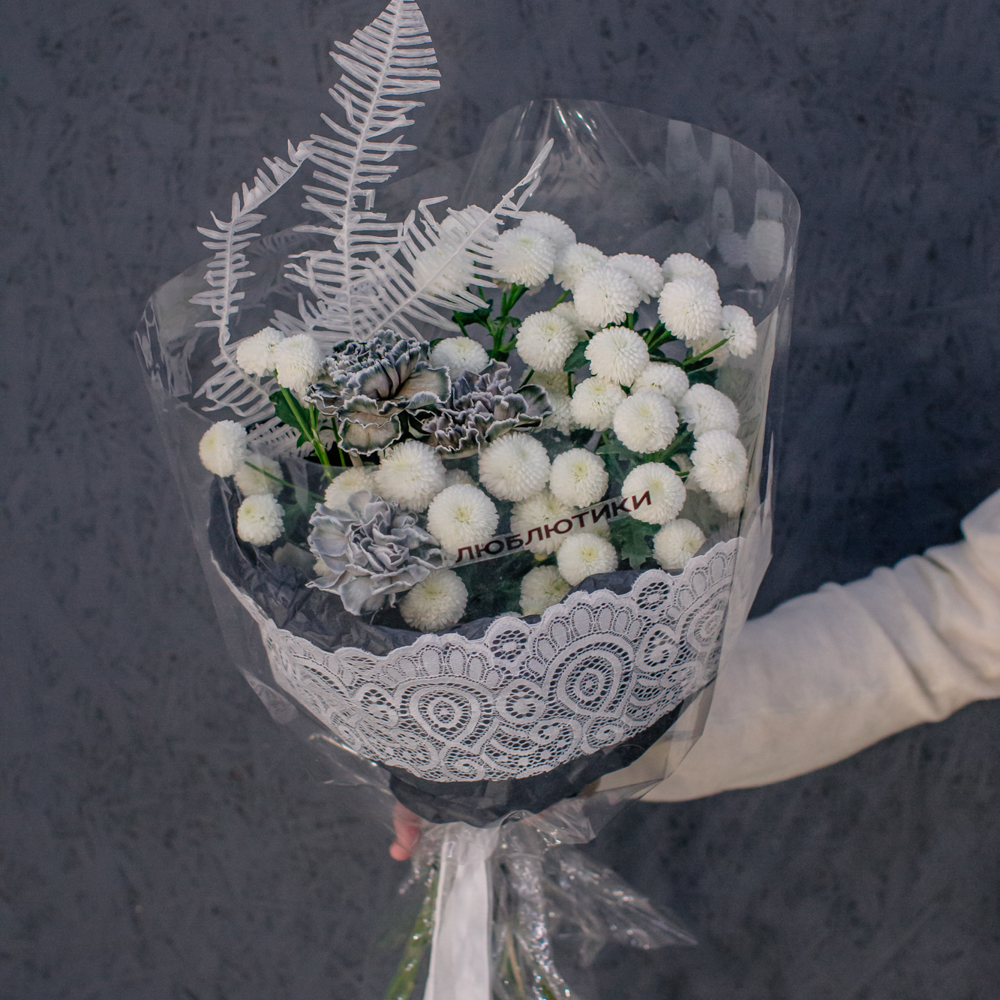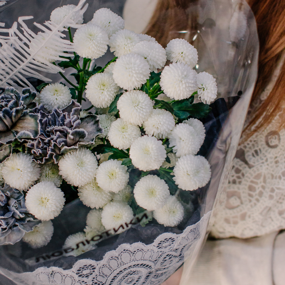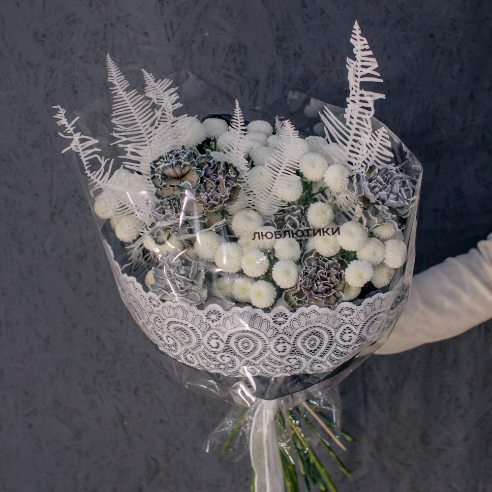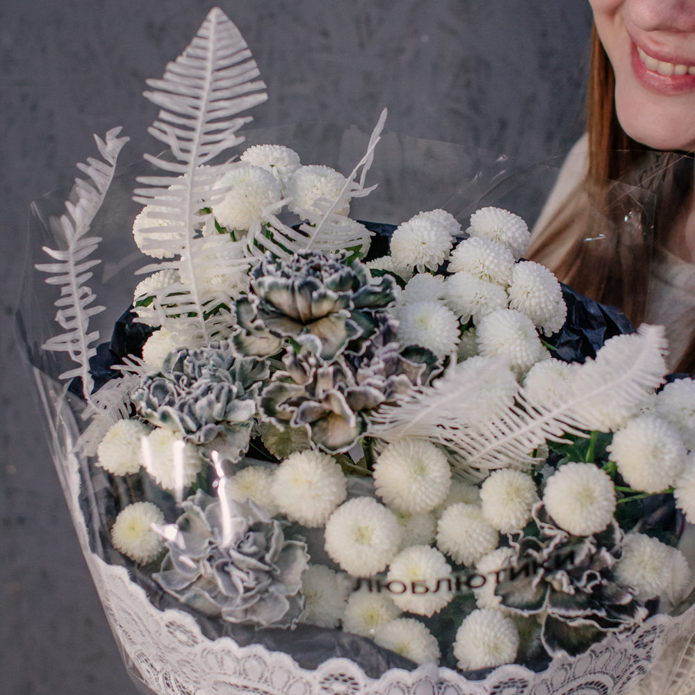 Чистый белый цвет хризантемы создаёт светлую основу композиции, воздушный папоротник амбрелла добавляет объём и фактуру, а чёрные крашеные диантусы расставляют смелые графичные акценты. Чёрная упаковка с белым кружевом подчёркивает игру контрастов и делает образ особенно стильным.
