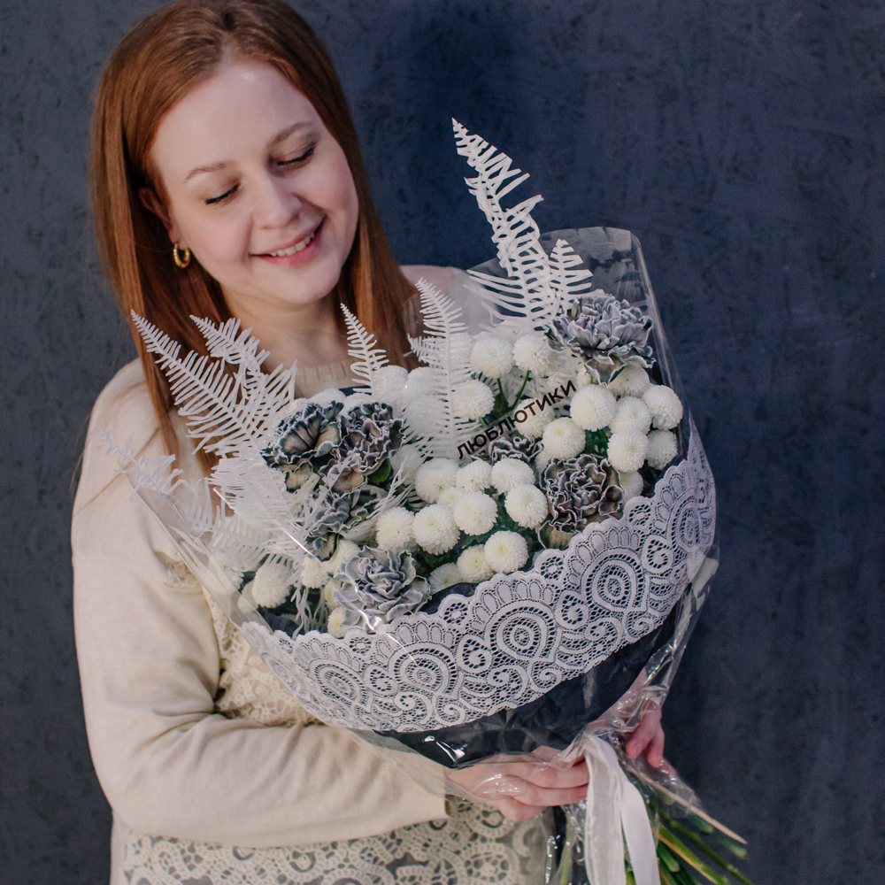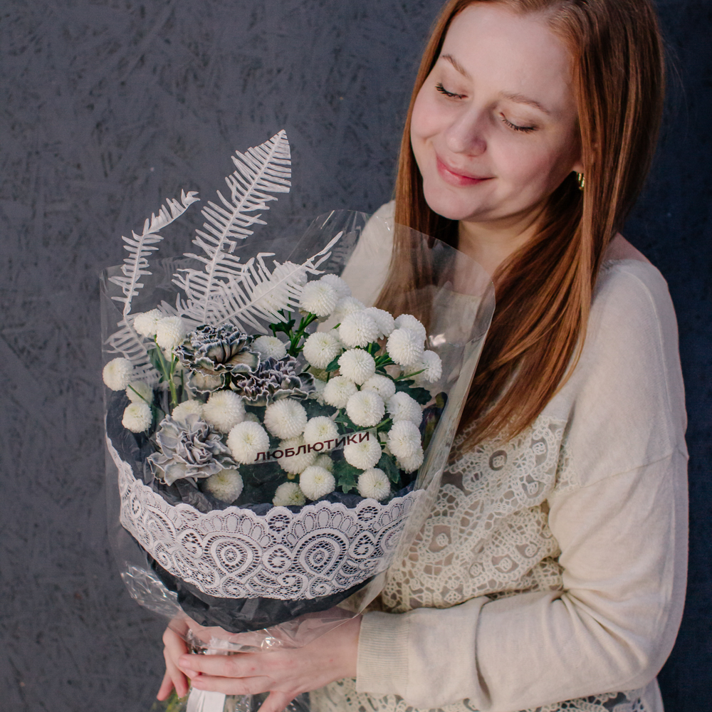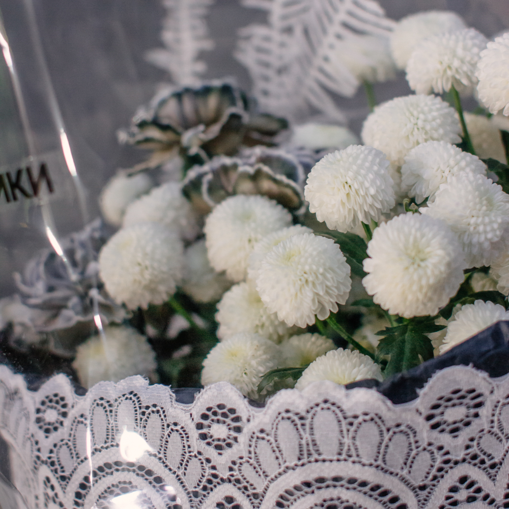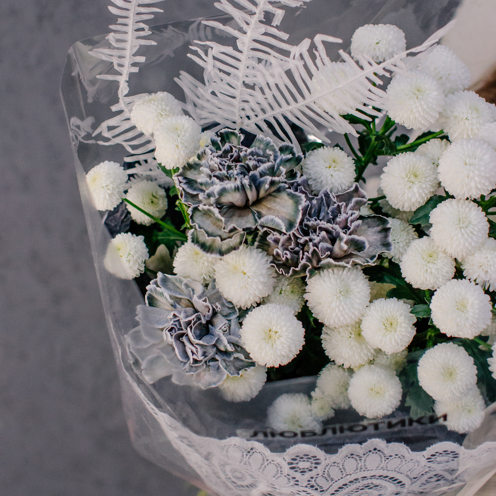Чистый белый цвет хризантемы создаёт светлую основу композиции, воздушный папоротник амбрелла добавляет объём и фактуру, а чёрные крашеные диантусы расставляют смелые графичные акценты. Чёрная упаковка с белым кружевом подчёркивает игру контрастов и делает образ особенно стильным.