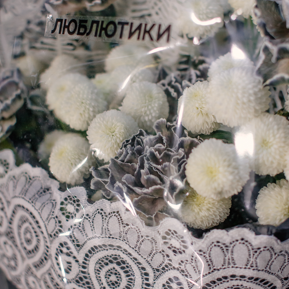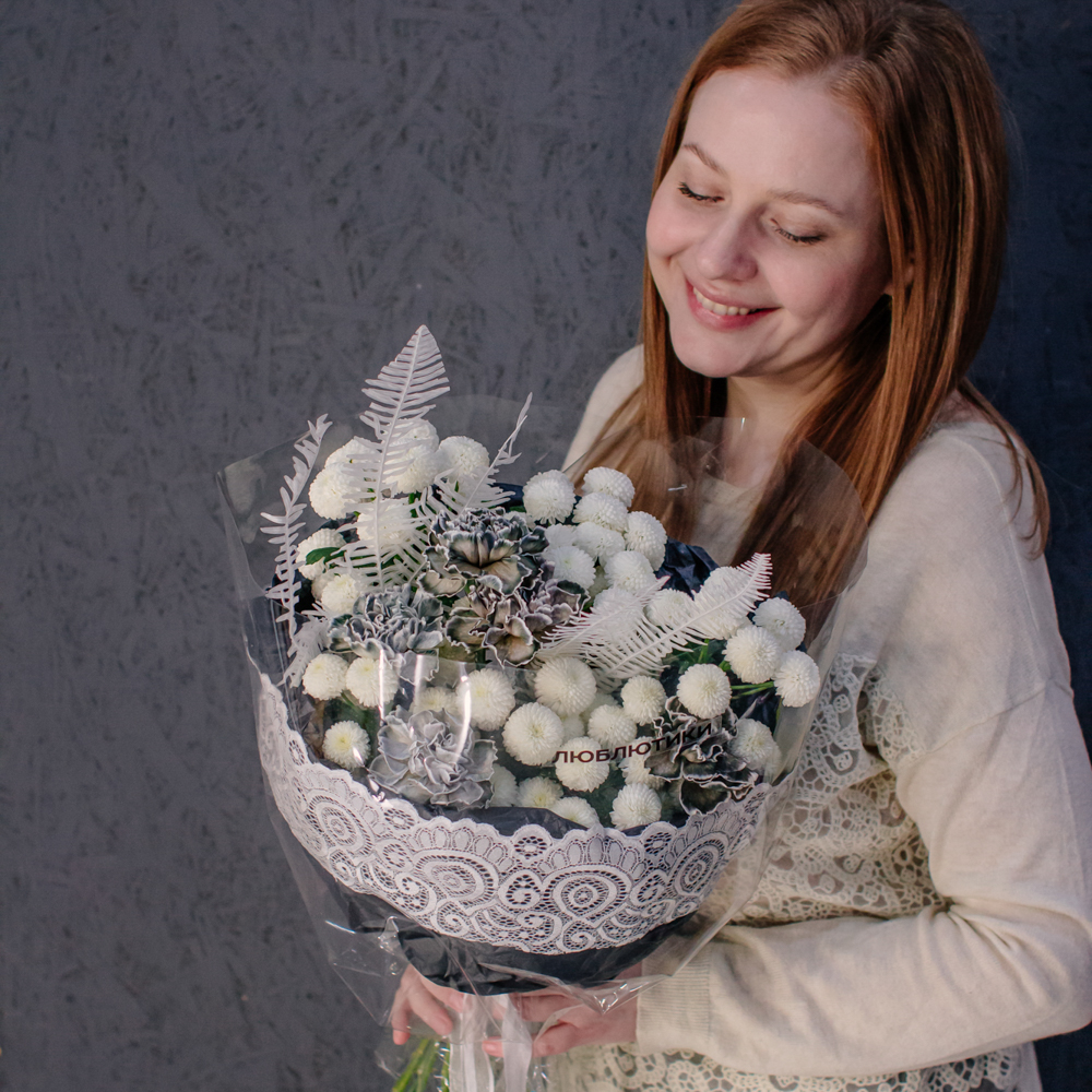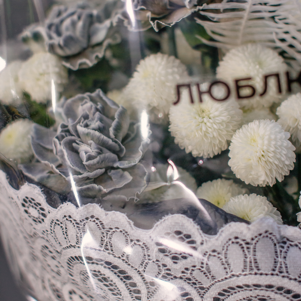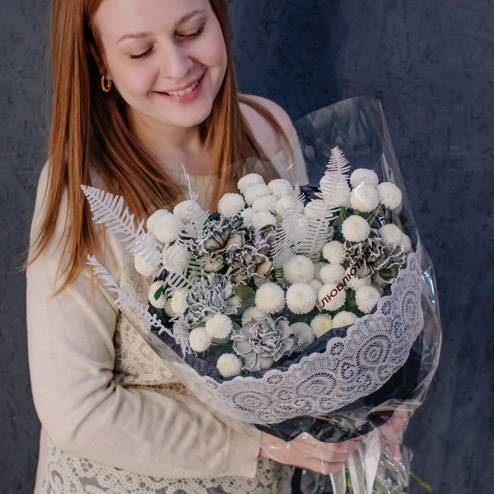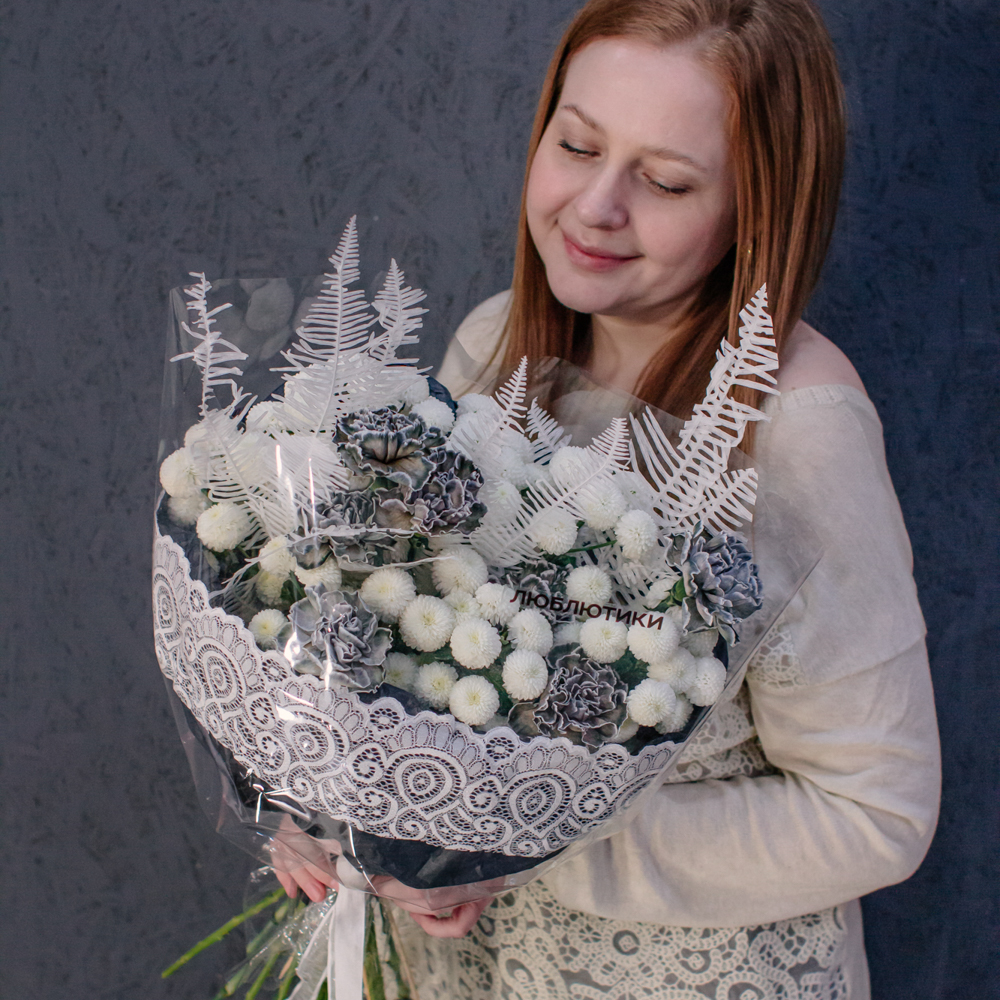 Чистый белый цвет хризантемы создаёт светлую основу композиции, воздушный папоротник амбрелла добавляет объём и фактуру, а чёрные крашеные диантусы расставляют смелые графичные акценты. Чёрная упаковка с белым кружевом подчёркивает игру контрастов и делает образ особенно стильным.