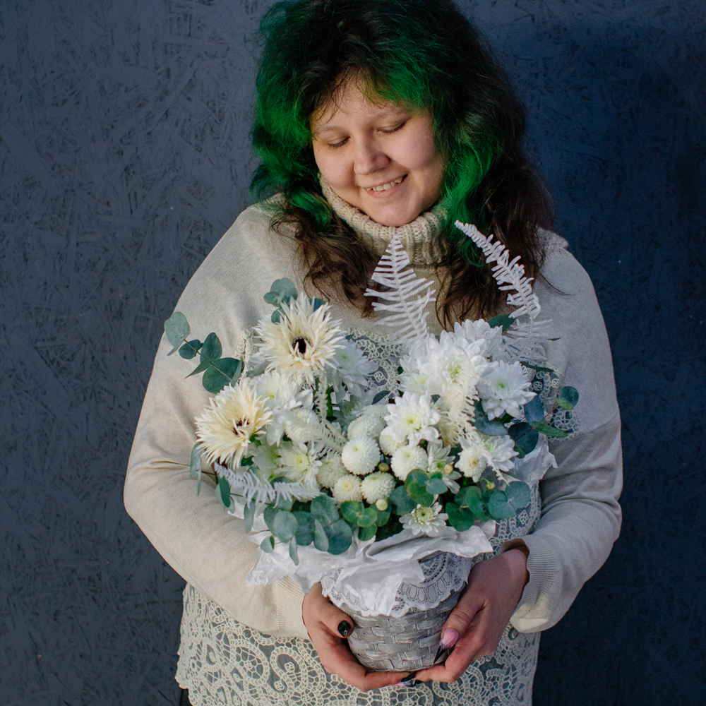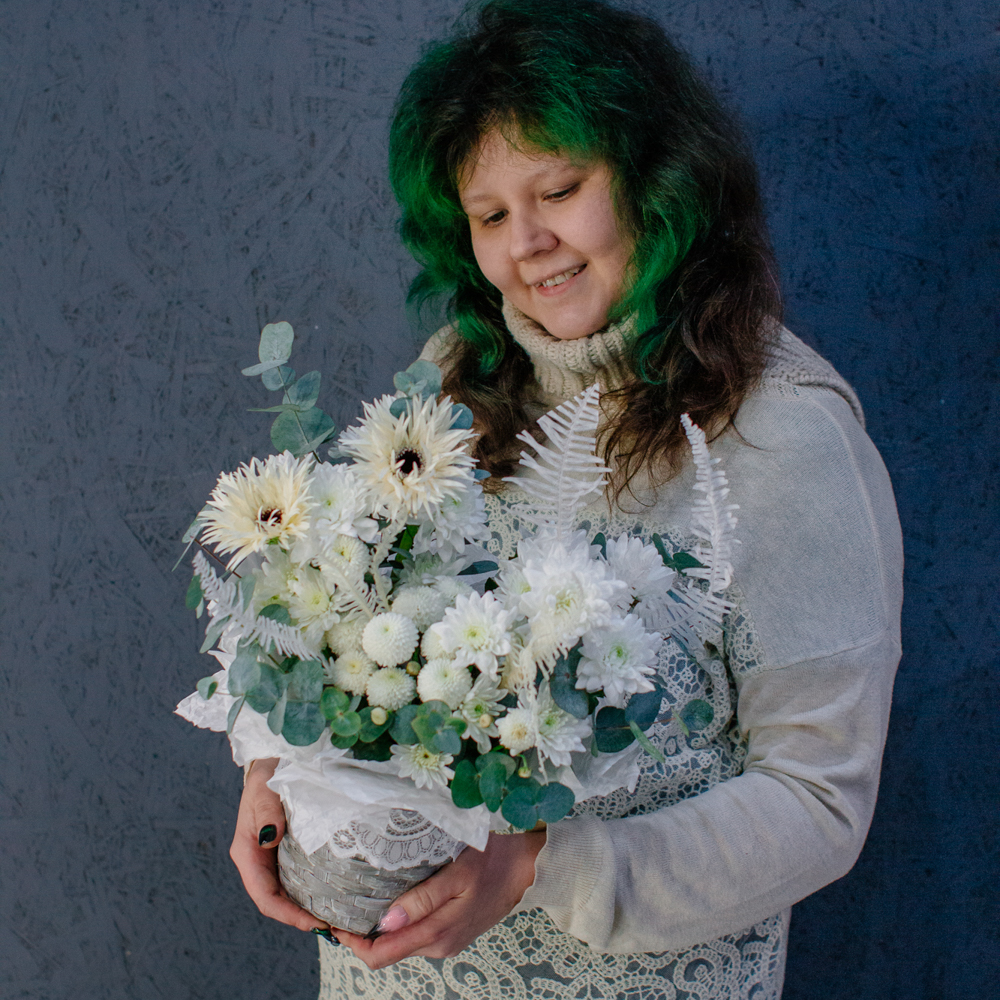 Белоснежная композиция в плетёной корзине с эвкалиптом и белым кружевом — нежная и утончённая.