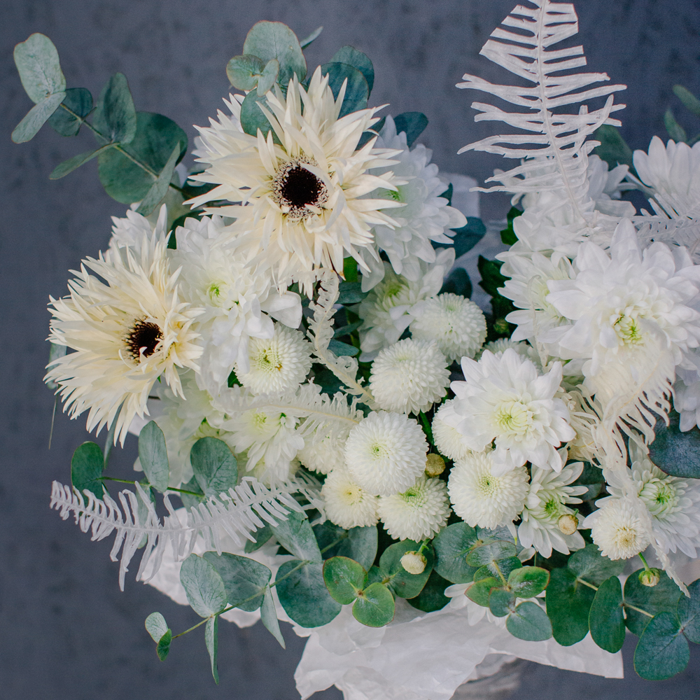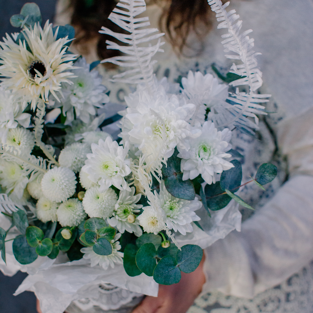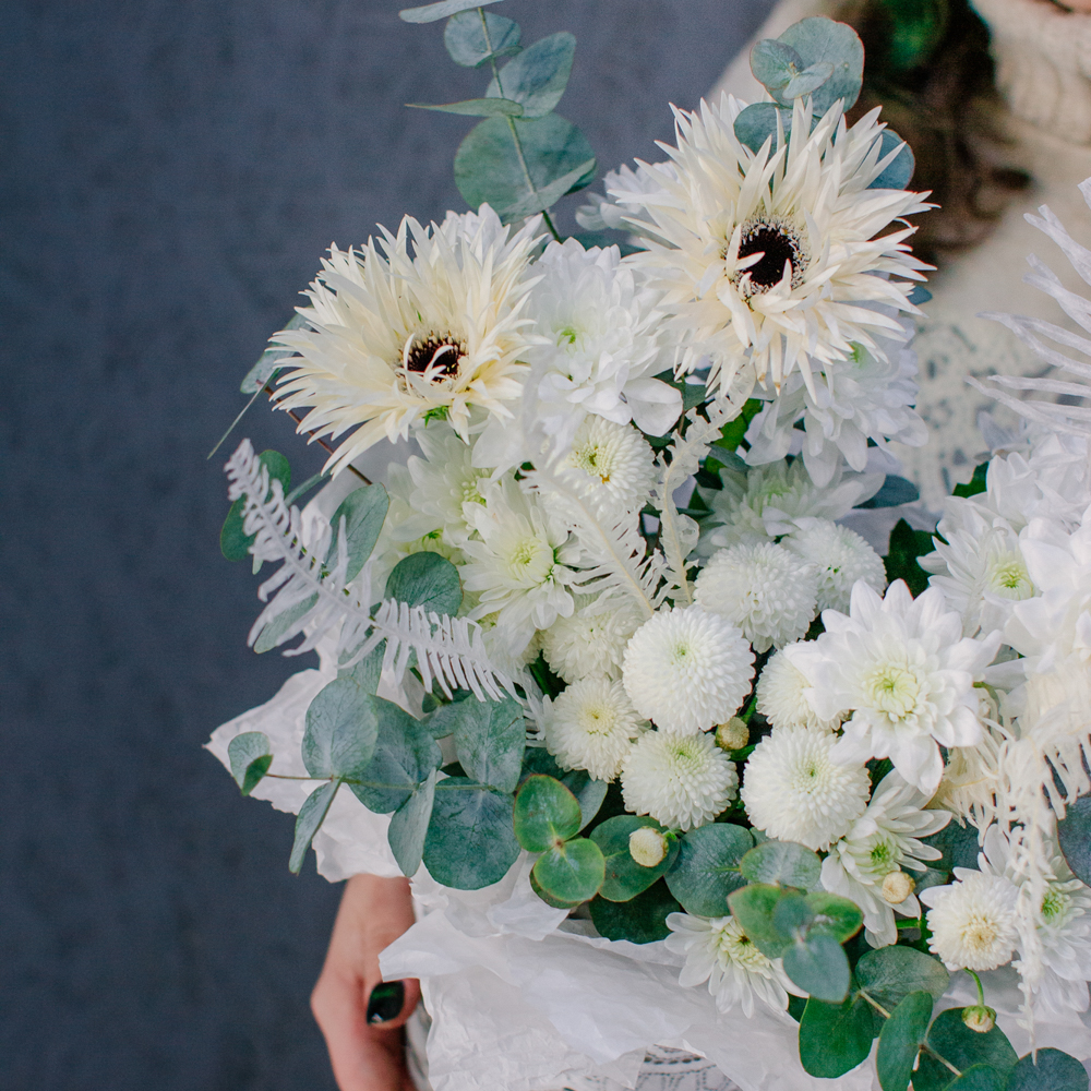 Чистые светлые оттенки создают ощущение свежести и спокойствия, эвкалипт добавляет лёгкую природную фактуру, а белое кружево подчёркивает воздушность и изящество композиции.