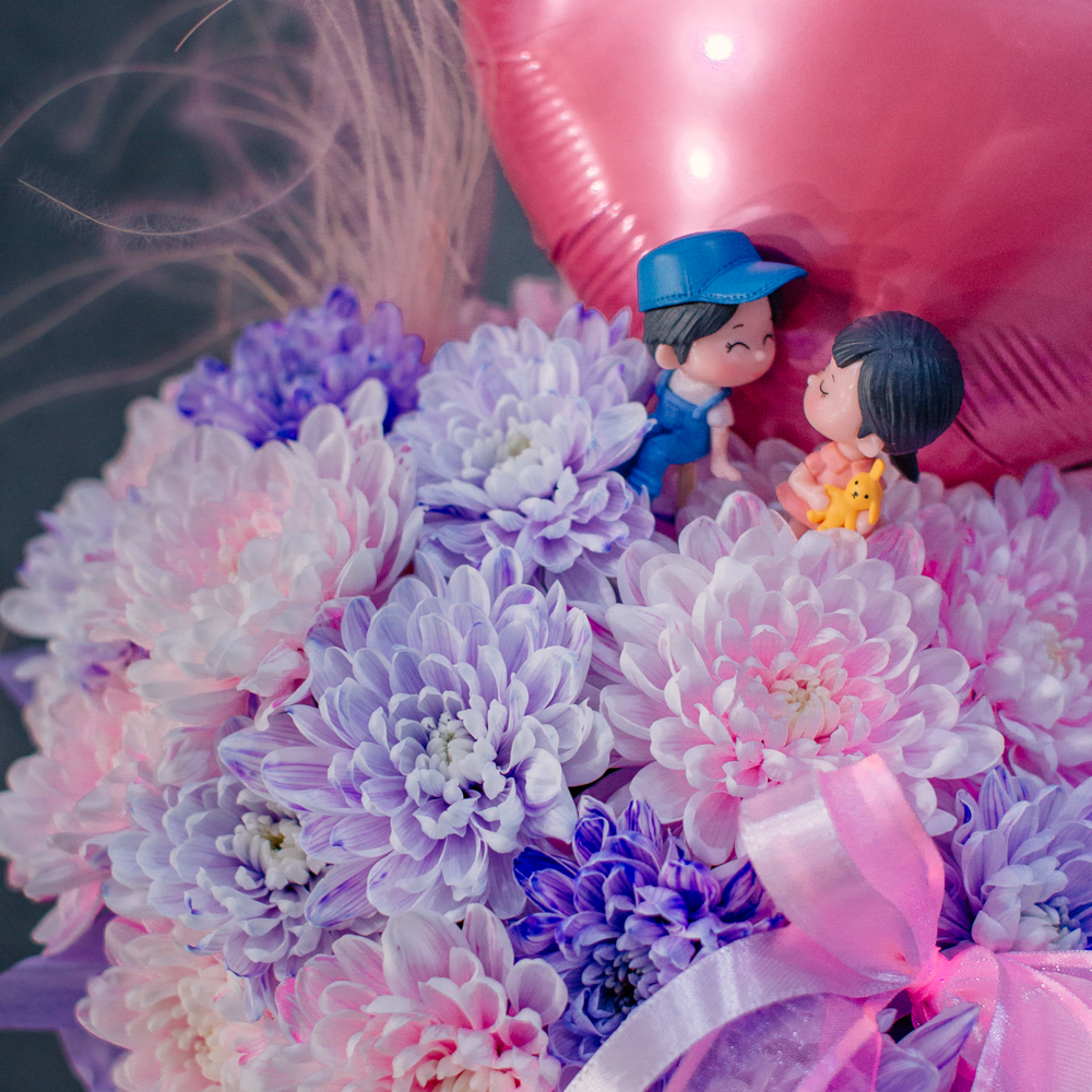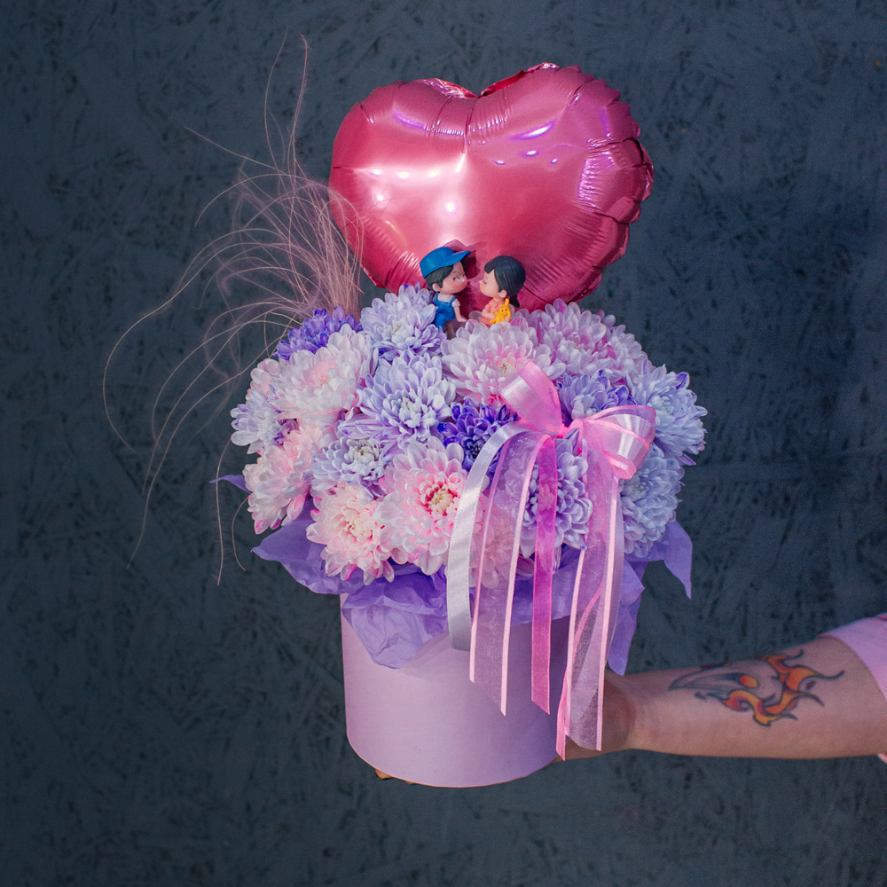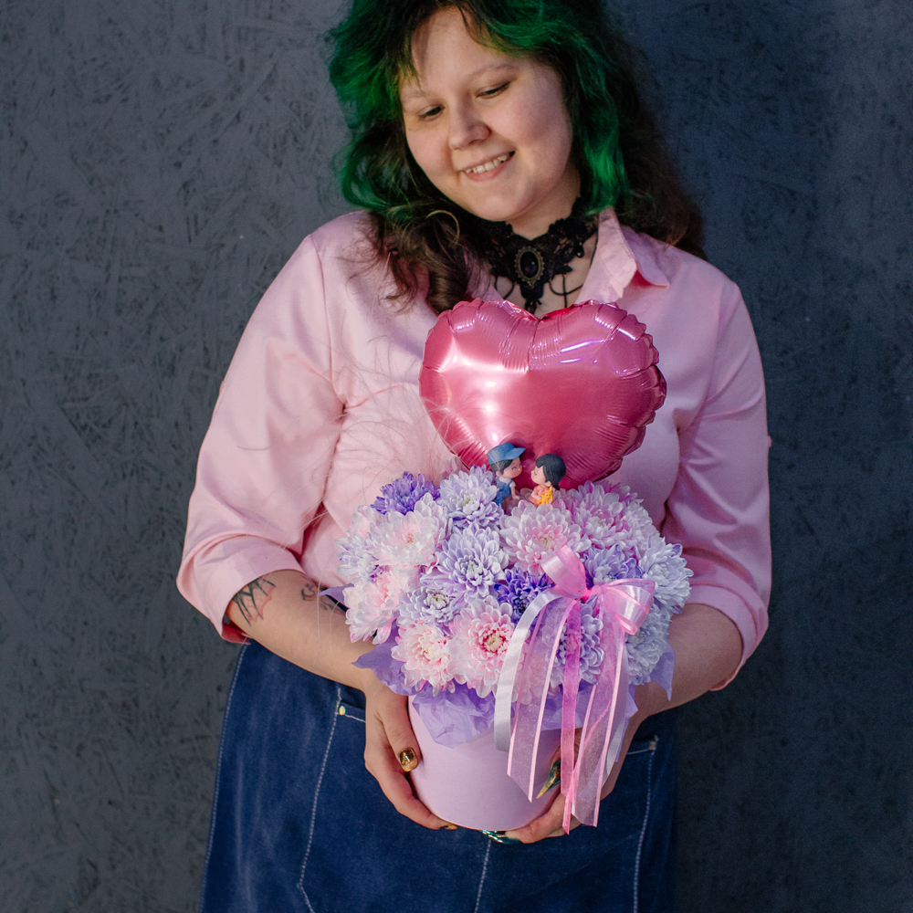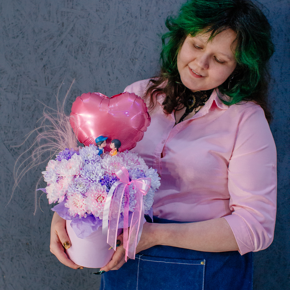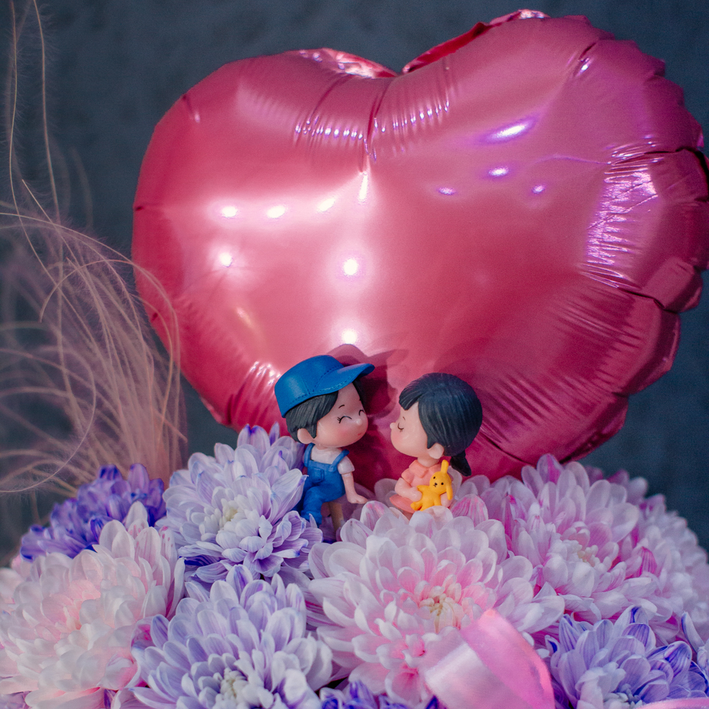 Композиция в розово-сиреневых оттенках с воздушным шариком-сердечком и милыми фигурками — нежная и очень трогательная.