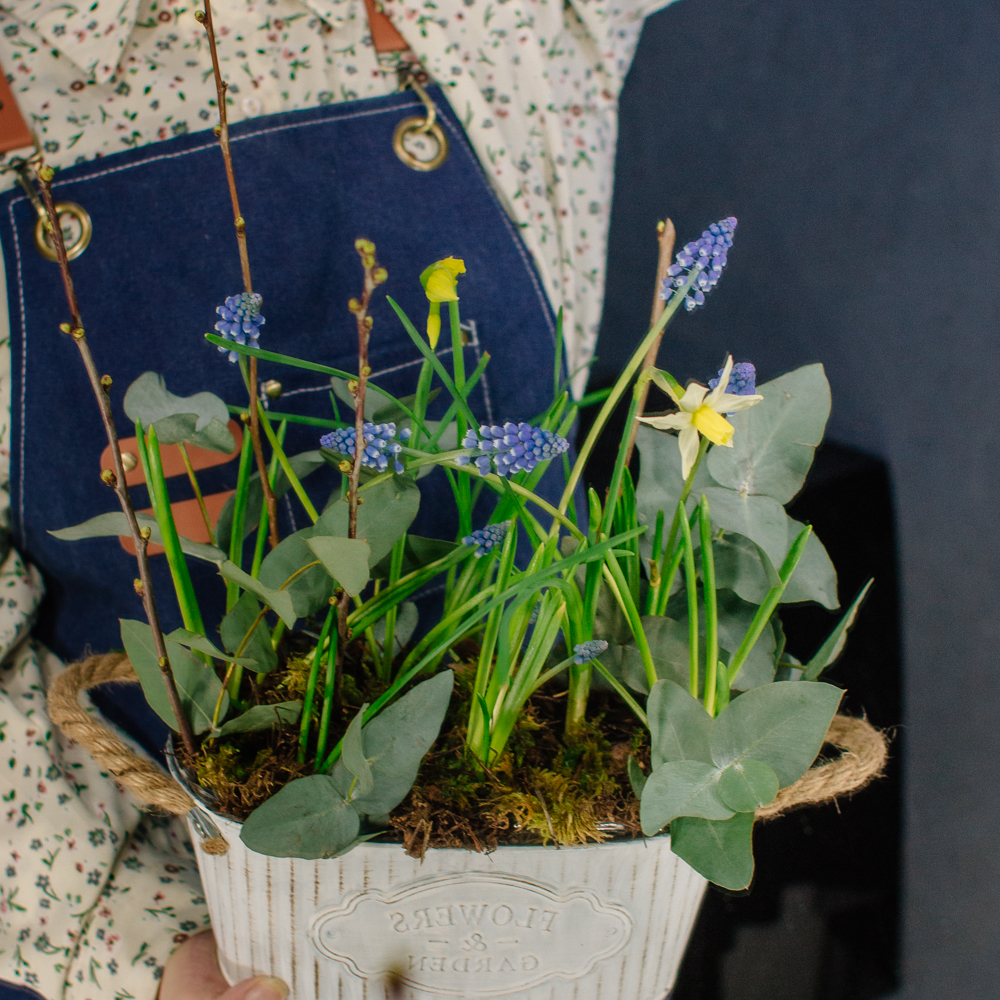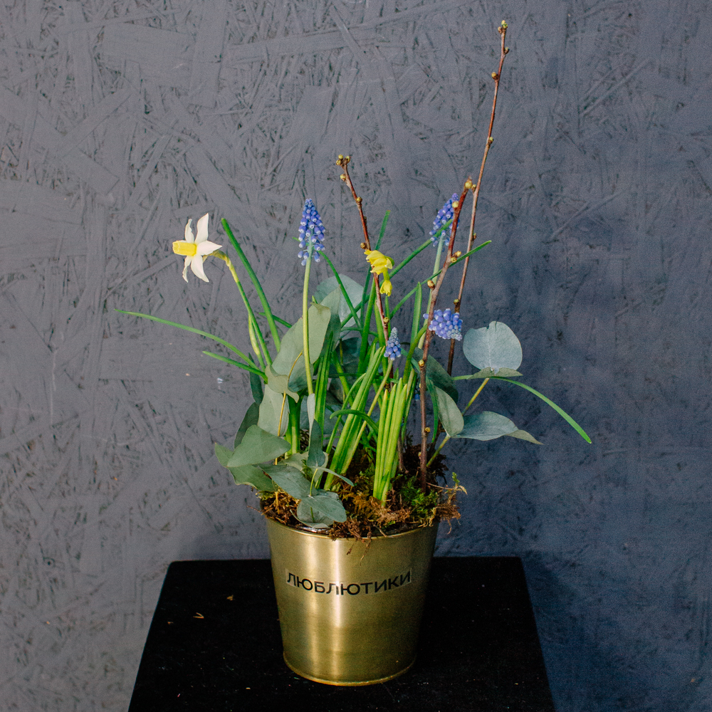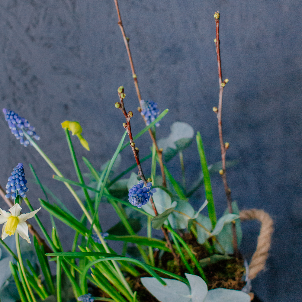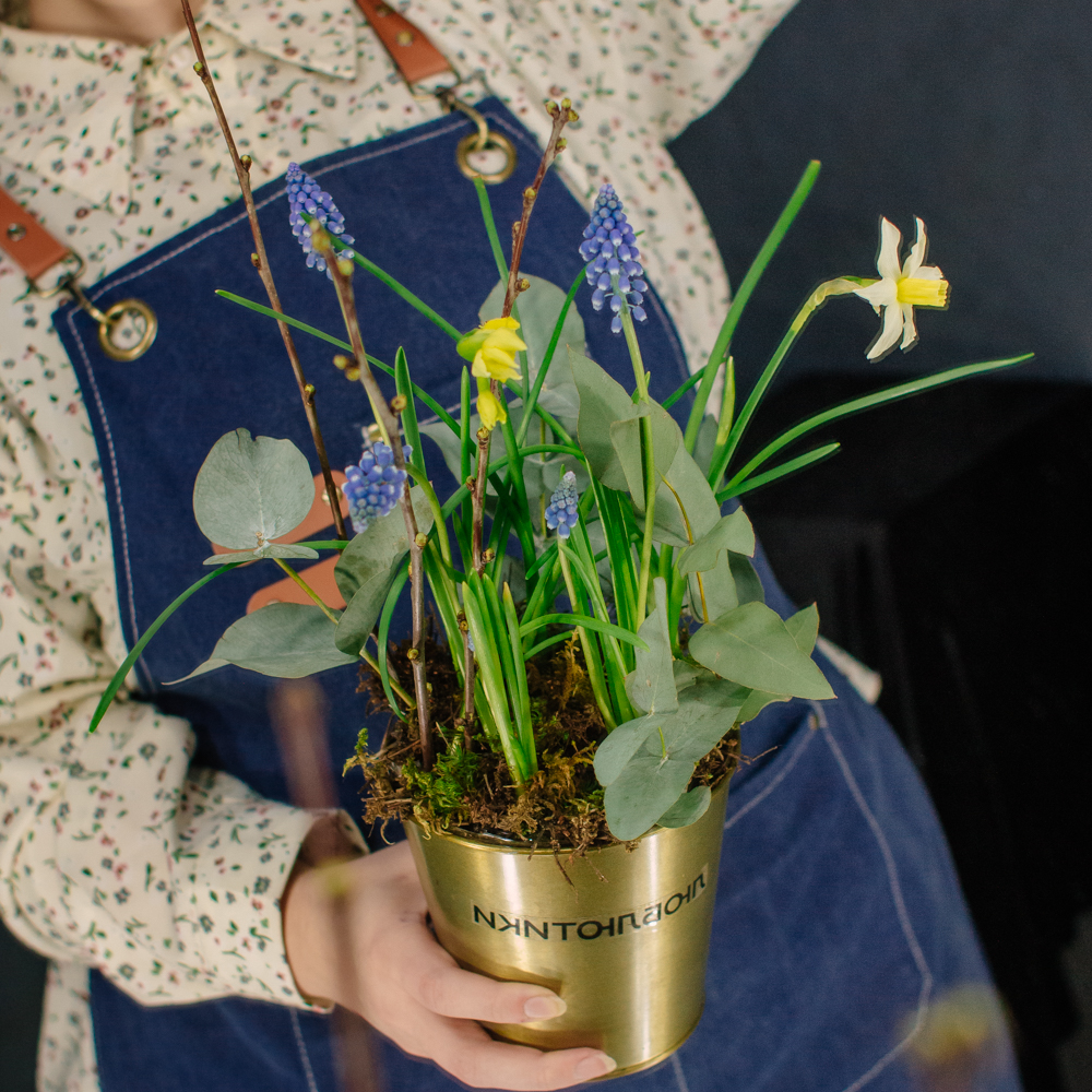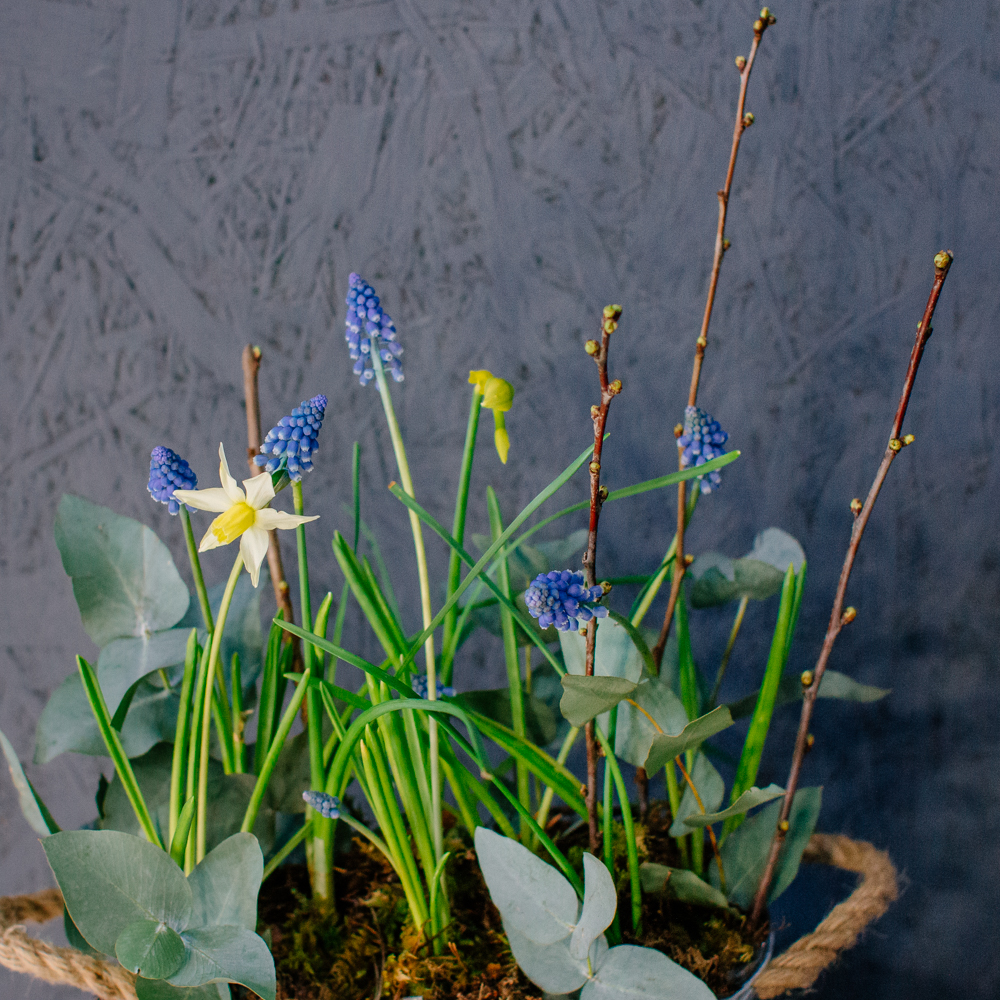 Весенняя романтичная композиция с луковичными нарциссами и мускари — лёгкая, свежая и по-настоящему живая. Нежные нарциссы и яркие мускари создают ощущение пробуждающейся природы, изящные веточки добавляют графичности, мох — естественности, а эвкалипт придаёт композиции лёгкий аромат и воздушность.