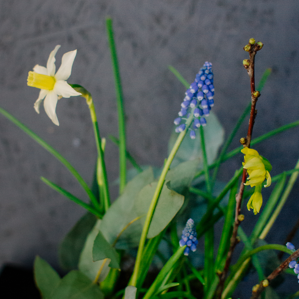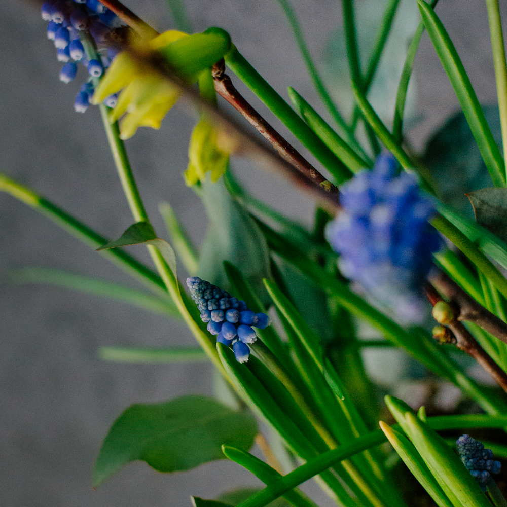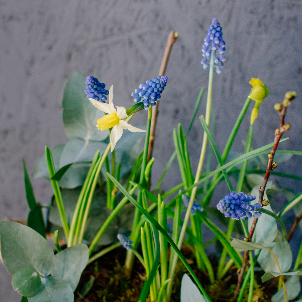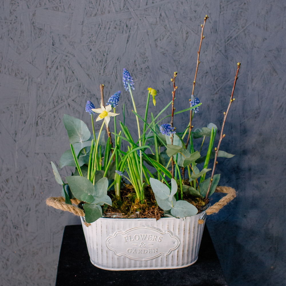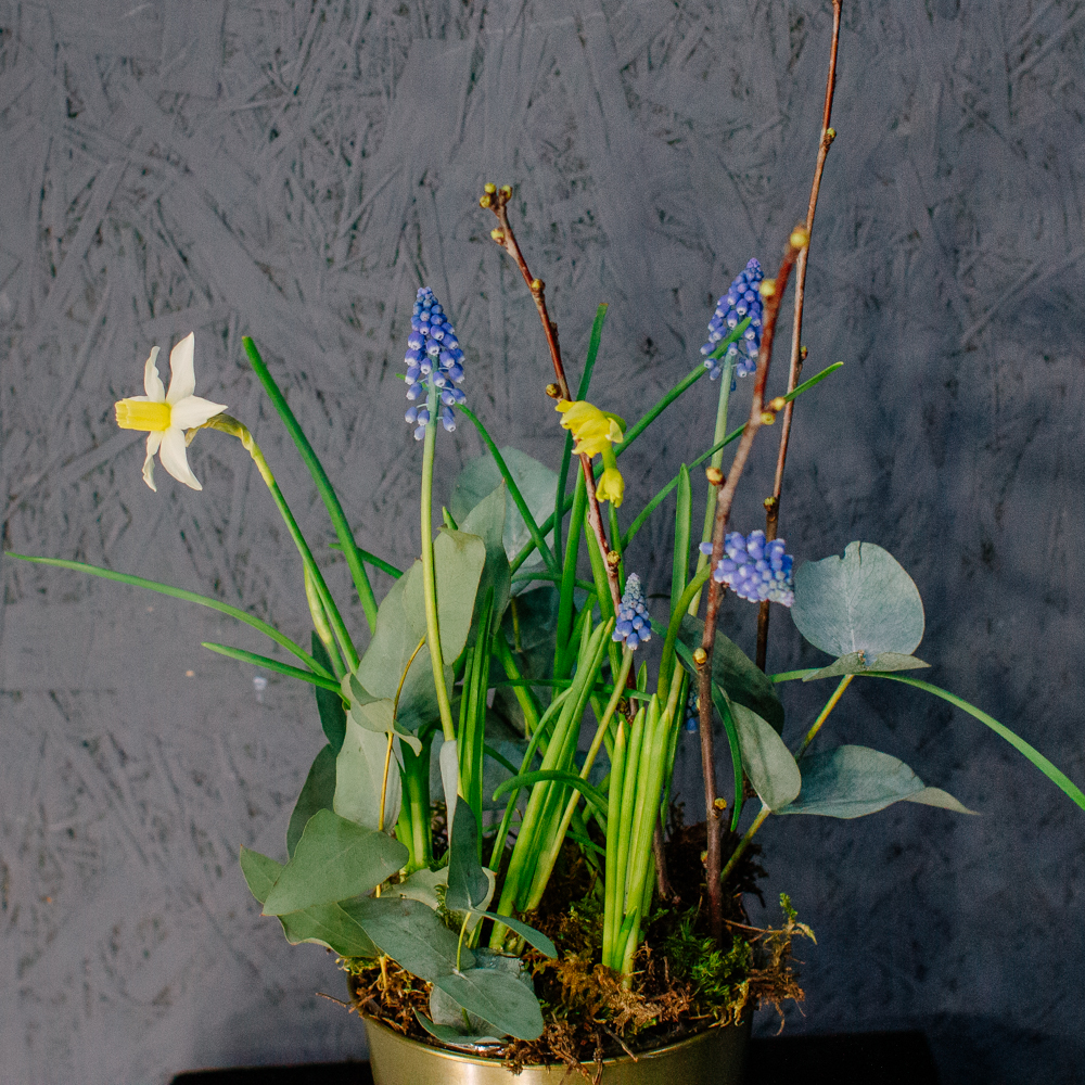 Весенняя романтичная композиция с луковичными нарциссами и мускари — лёгкая, свежая и по-настоящему живая. Нежные нарциссы и яркие мускари создают ощущение пробуждающейся природы, изящные веточки добавляют графичности, мох — естественности, а эвкалипт придаёт композиции лёгкий аромат и воздушность.