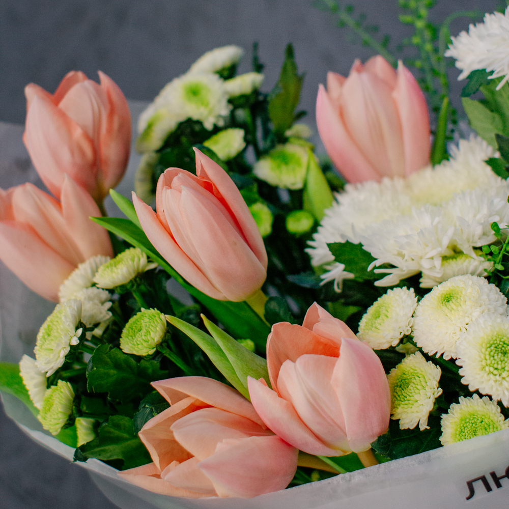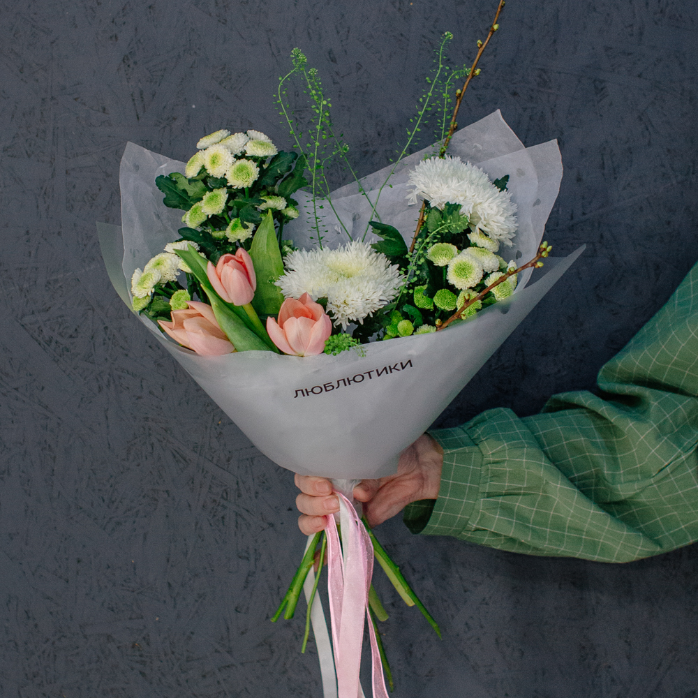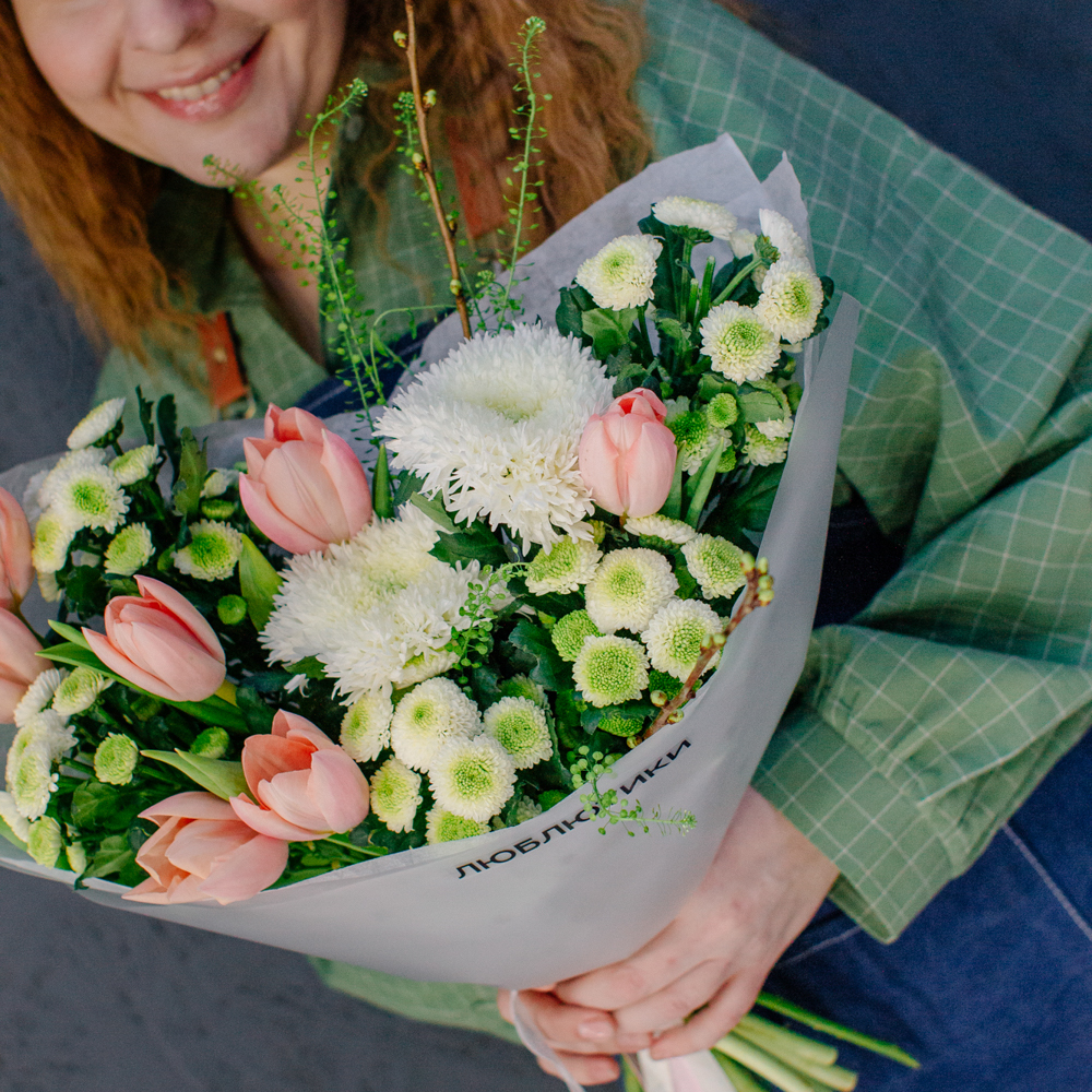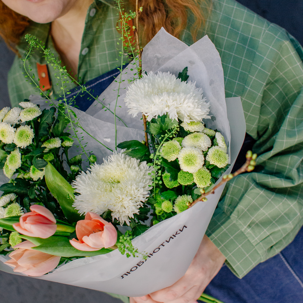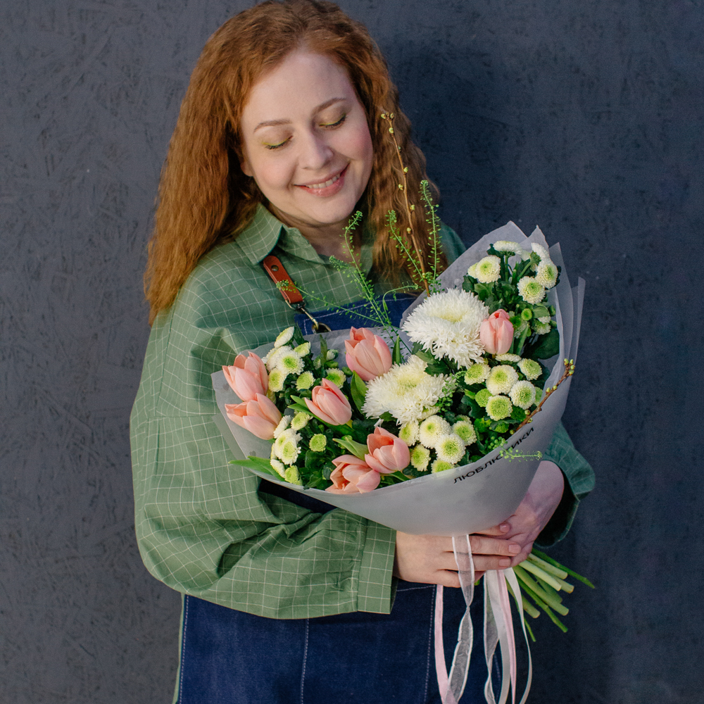 Такой букет уместен в качестве подарка маме или бабушке, девушке или коллеге - он выглядит элегантно, но без лишней торжественности, скорее как искренний комплимент без повода.