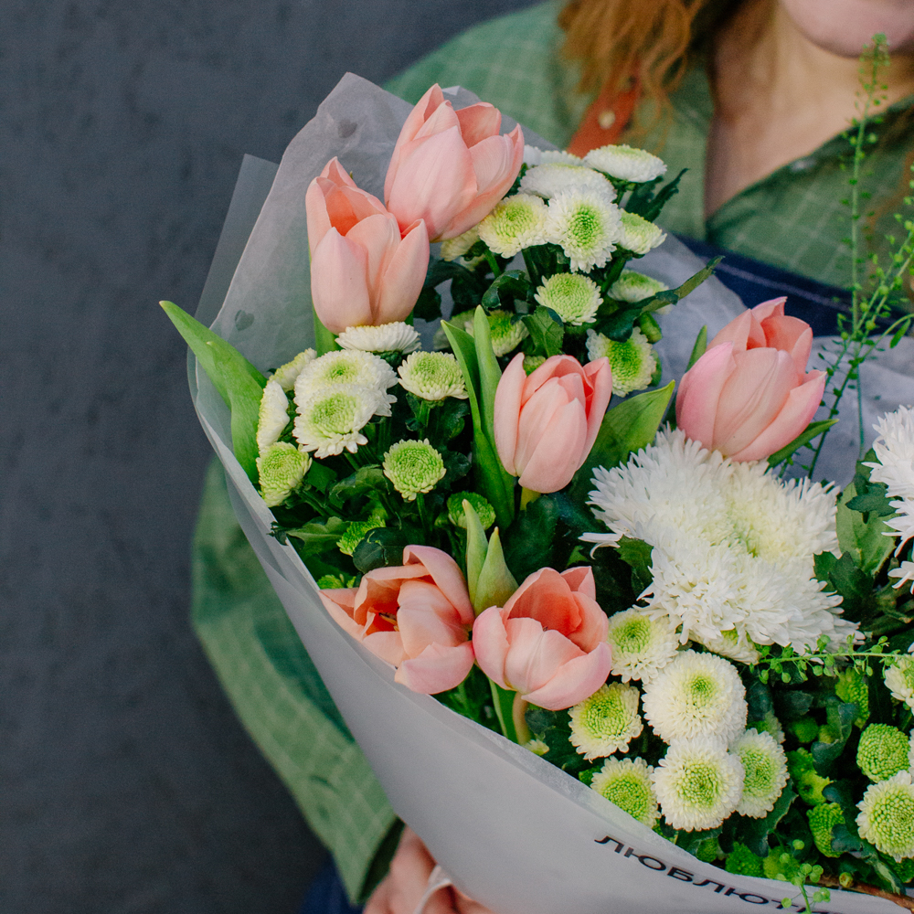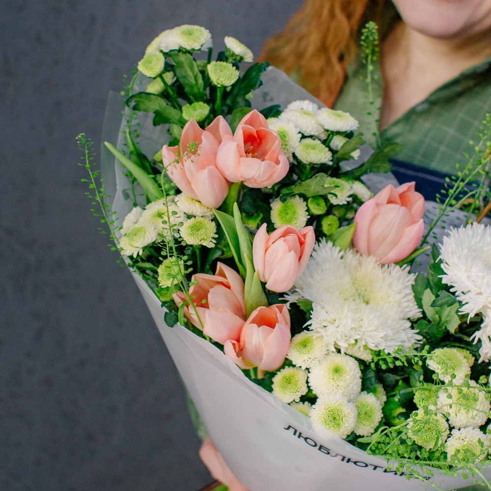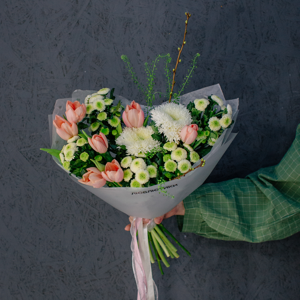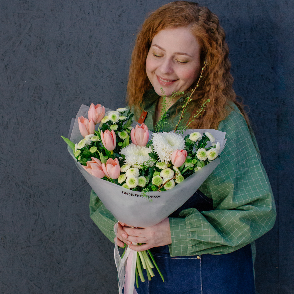 Такой букет уместен в качестве подарка маме или бабушке, девушке или коллеге - он выглядит элегантно, но без лишней торжественности, скорее как искренний комплимент без повода.