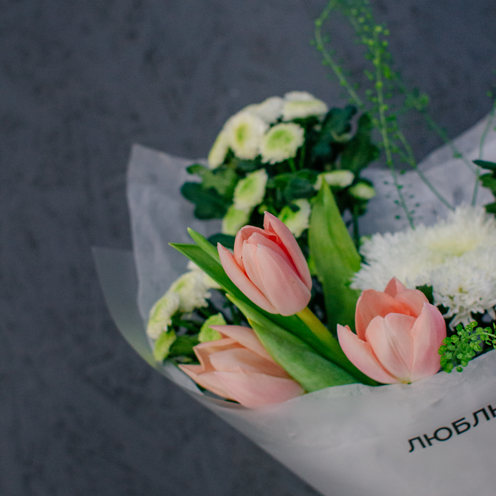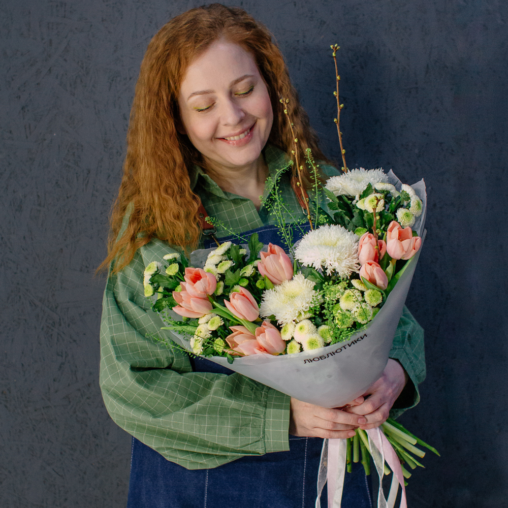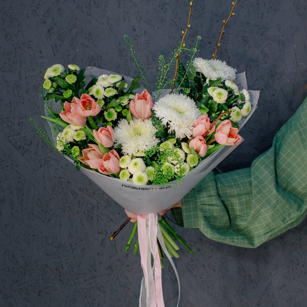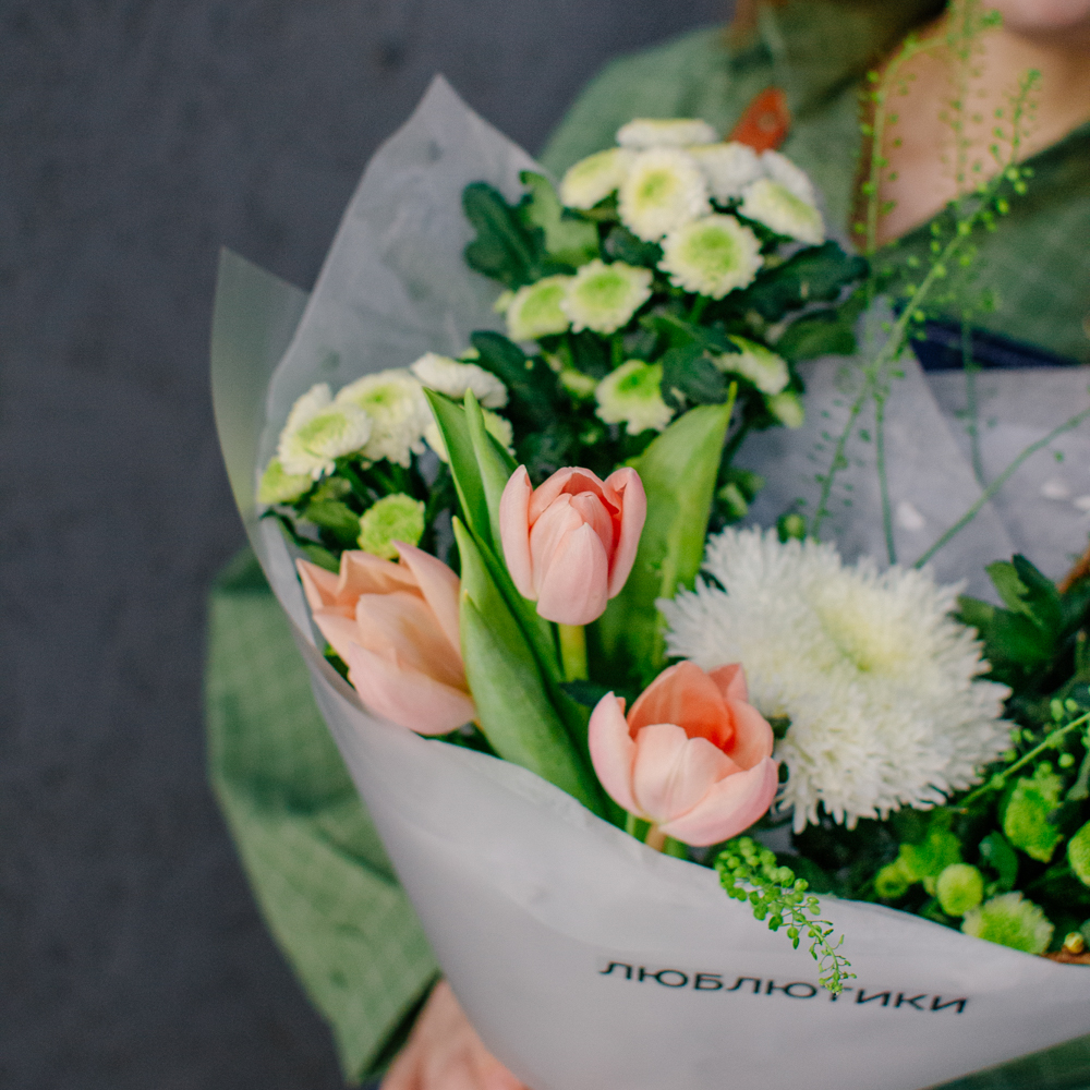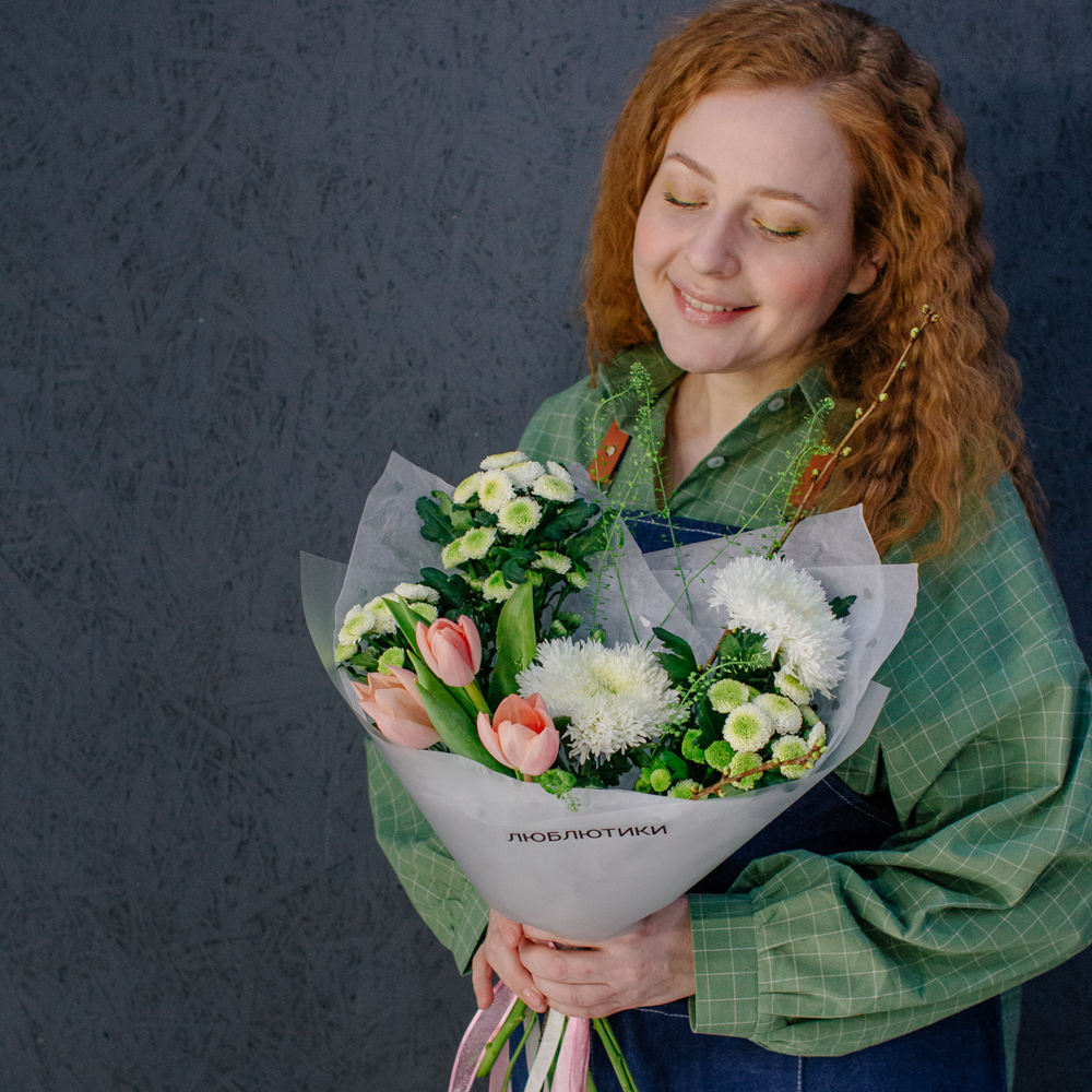 Такой букет уместен в качестве подарка маме или бабушке, девушке или коллеге - он выглядит элегантно, но без лишней торжественности, скорее как искренний комплимент без повода.