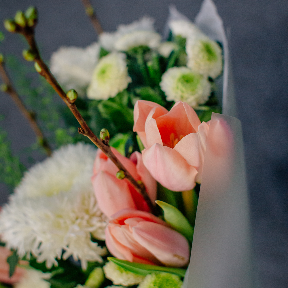 Тюльпаны в пастельных тонах выглядят невесомыми и трогательными, а ветки вишни с мелкими бутонами добавляют композиции графичности и воздушности. Эта пара идеально дополняет друг друга: округлые чаши тюльпанов и тонкие линии веток создают красивый ритм.