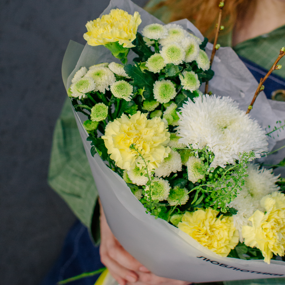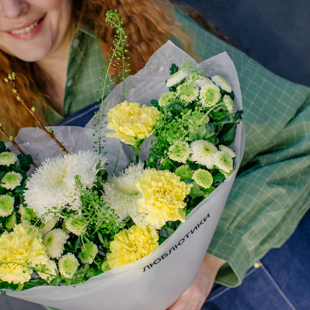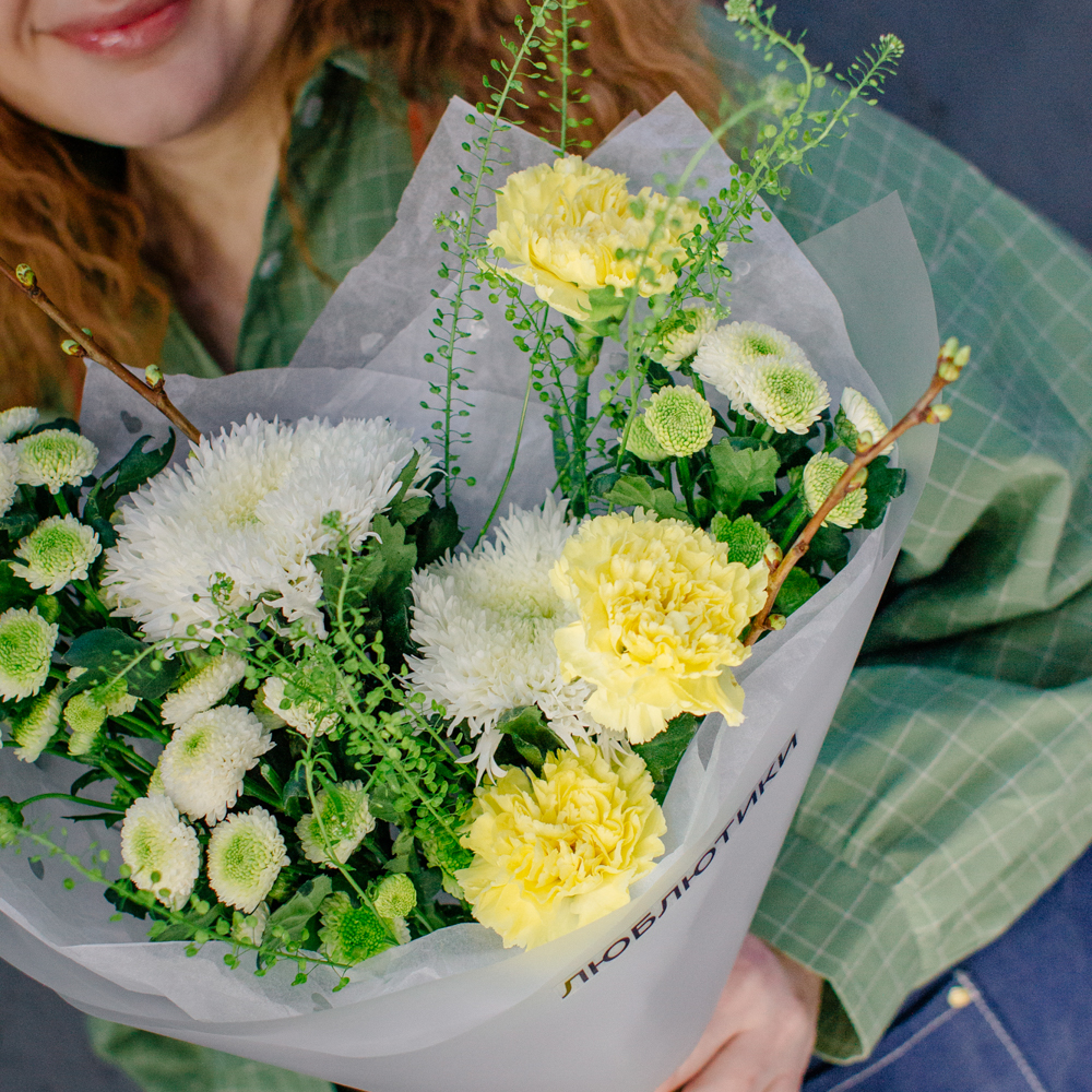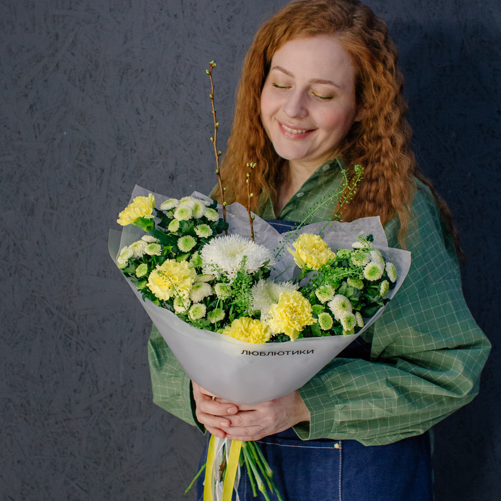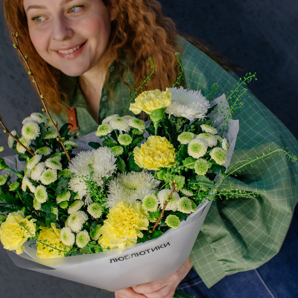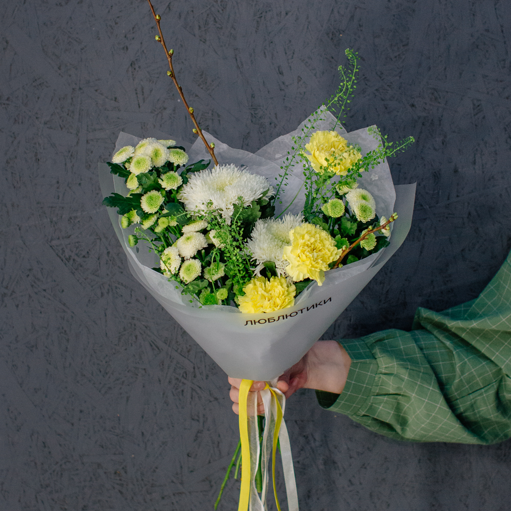 Бело-желто-зеленая гамма этого букета напоминает о первых по-настоящему теплых днях, когда солнце уже уверенно светит и все вокруг начинает зеленеть.
