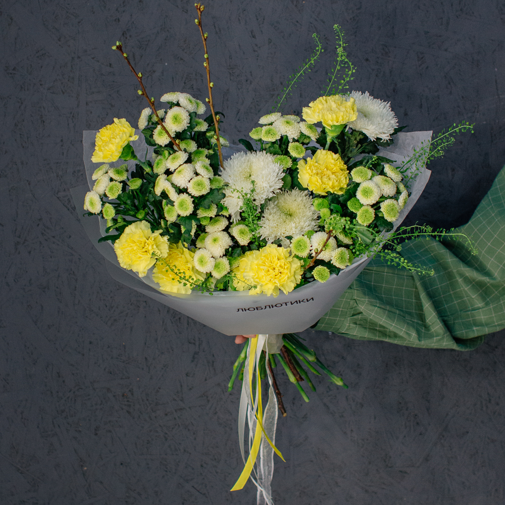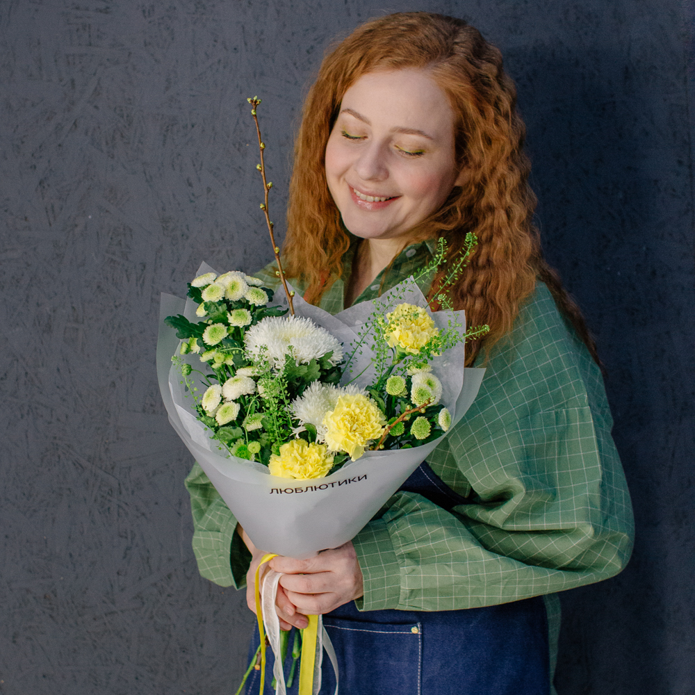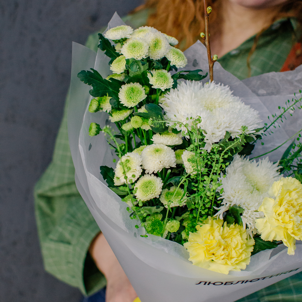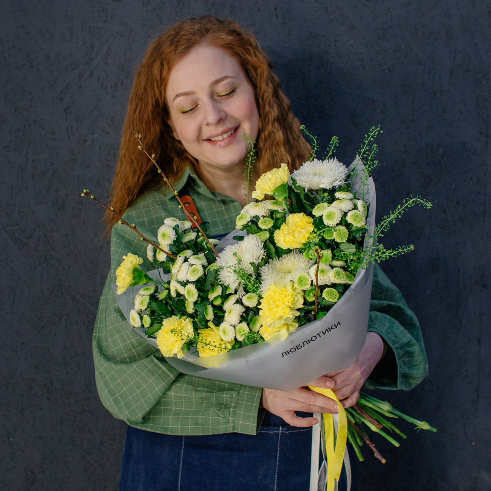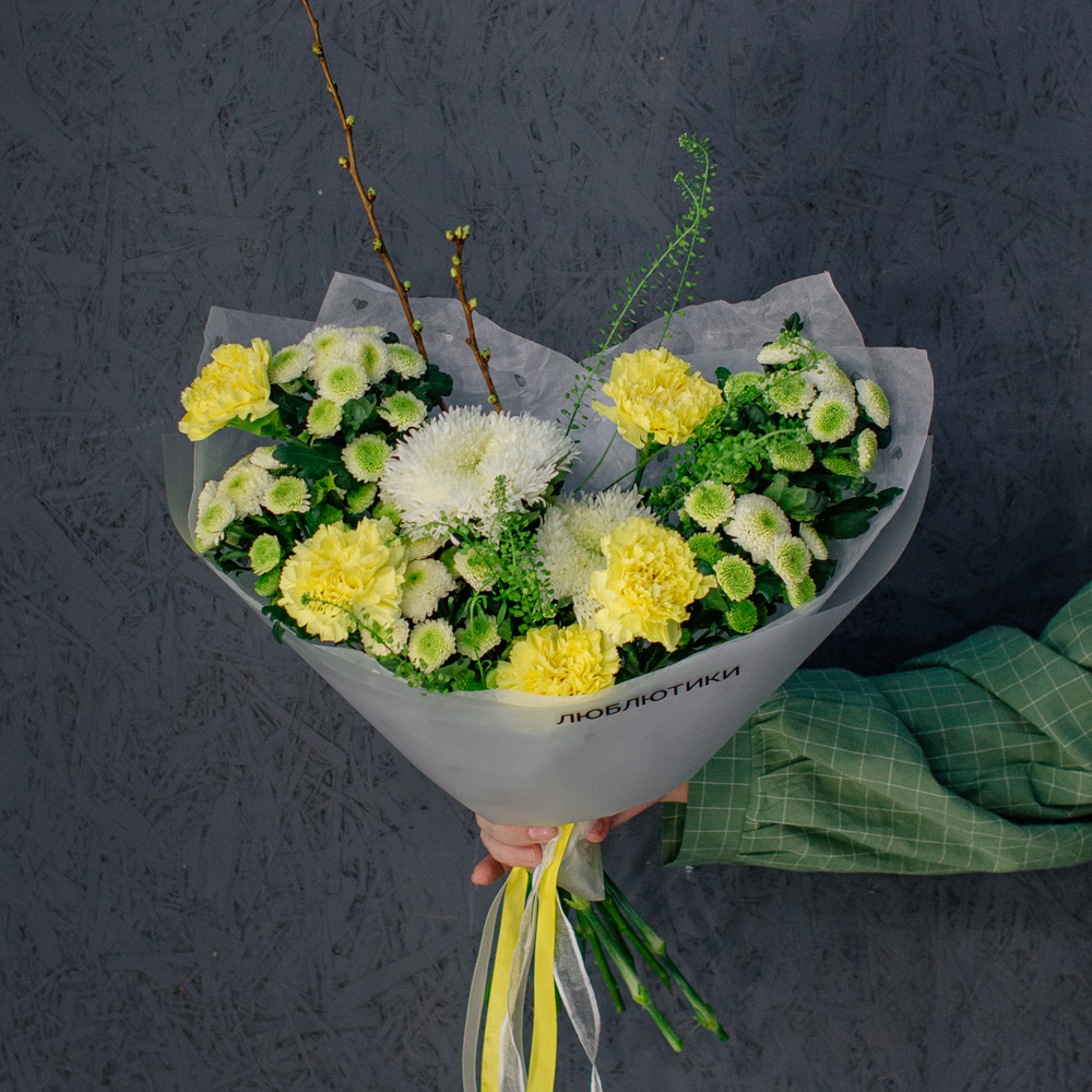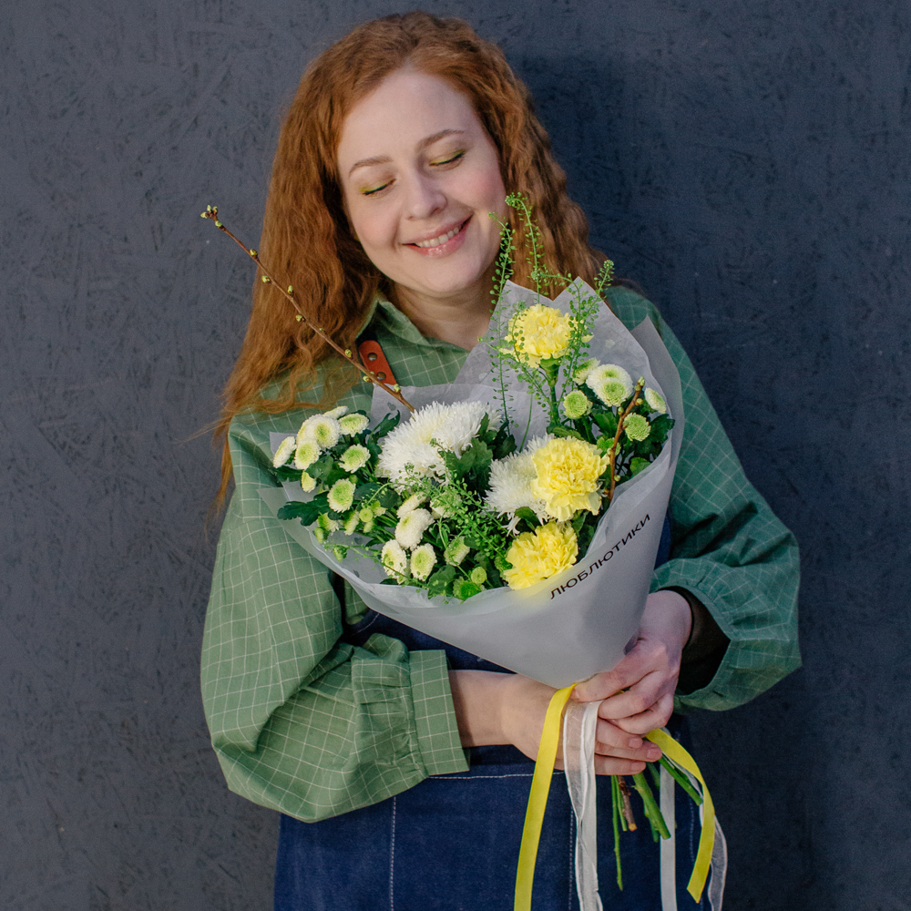 Бело-желто-зеленая гамма этого букета напоминает о первых по-настоящему теплых днях, когда солнце уже уверенно светит и все вокруг начинает зеленеть.
