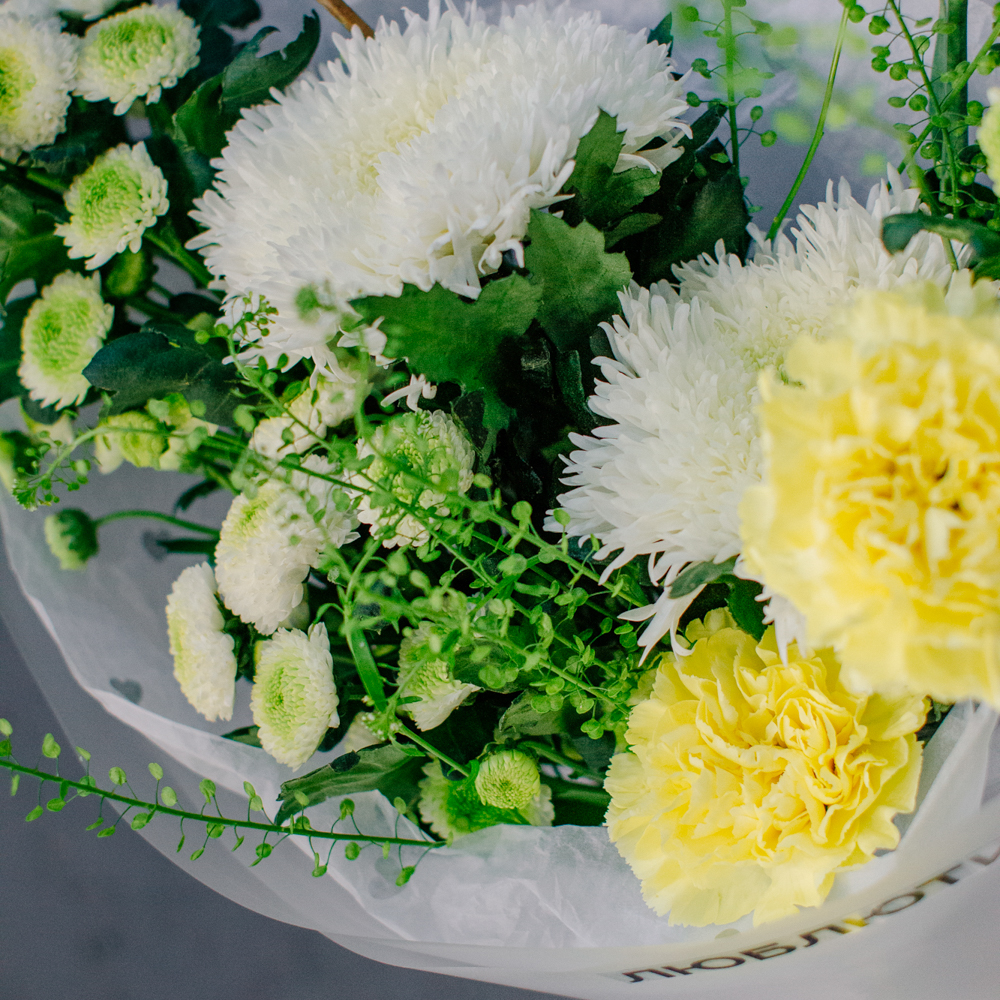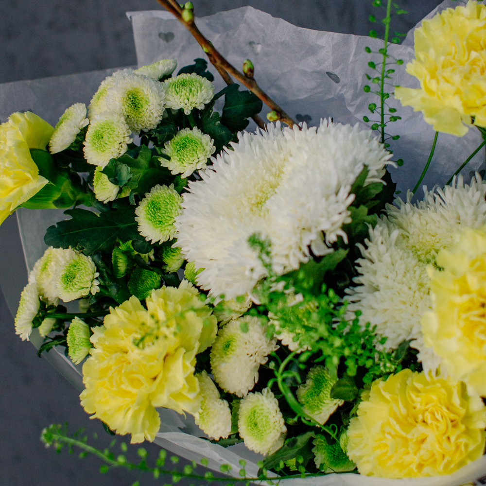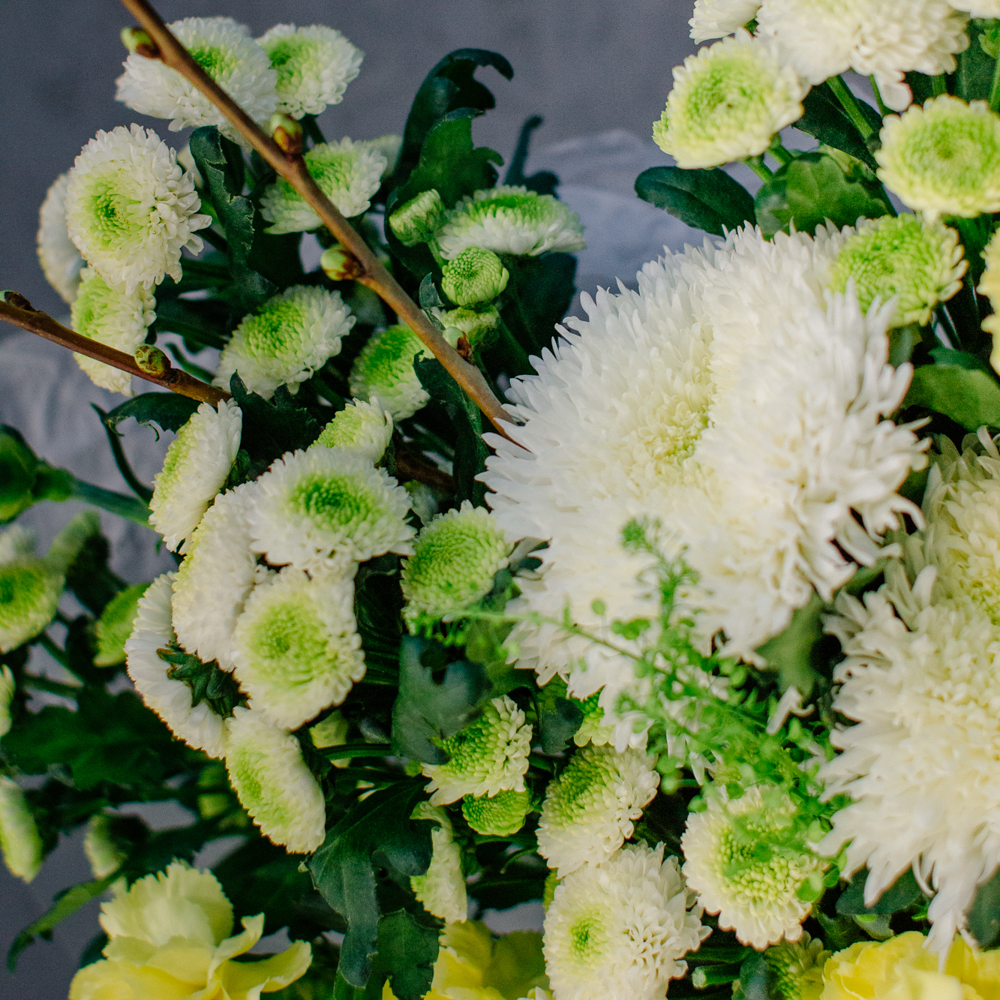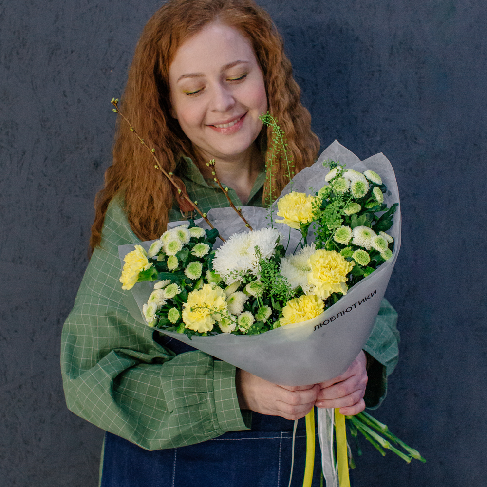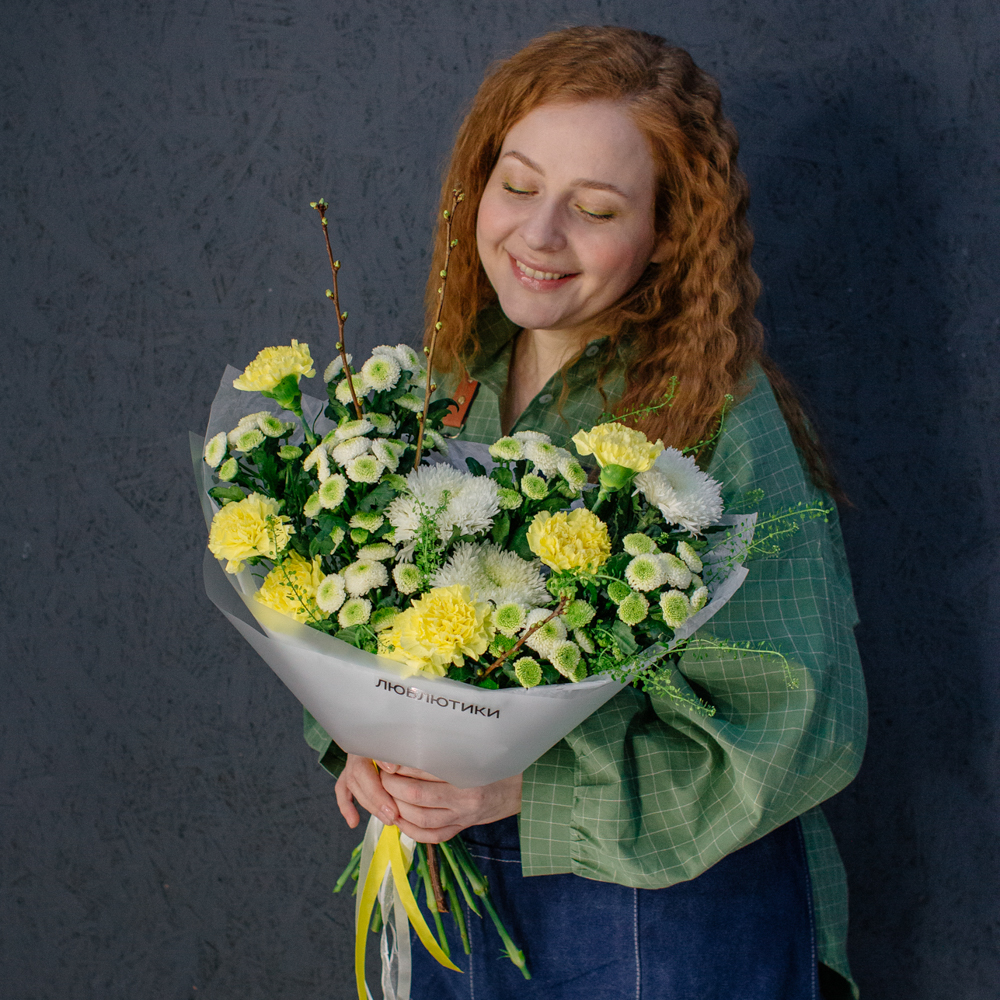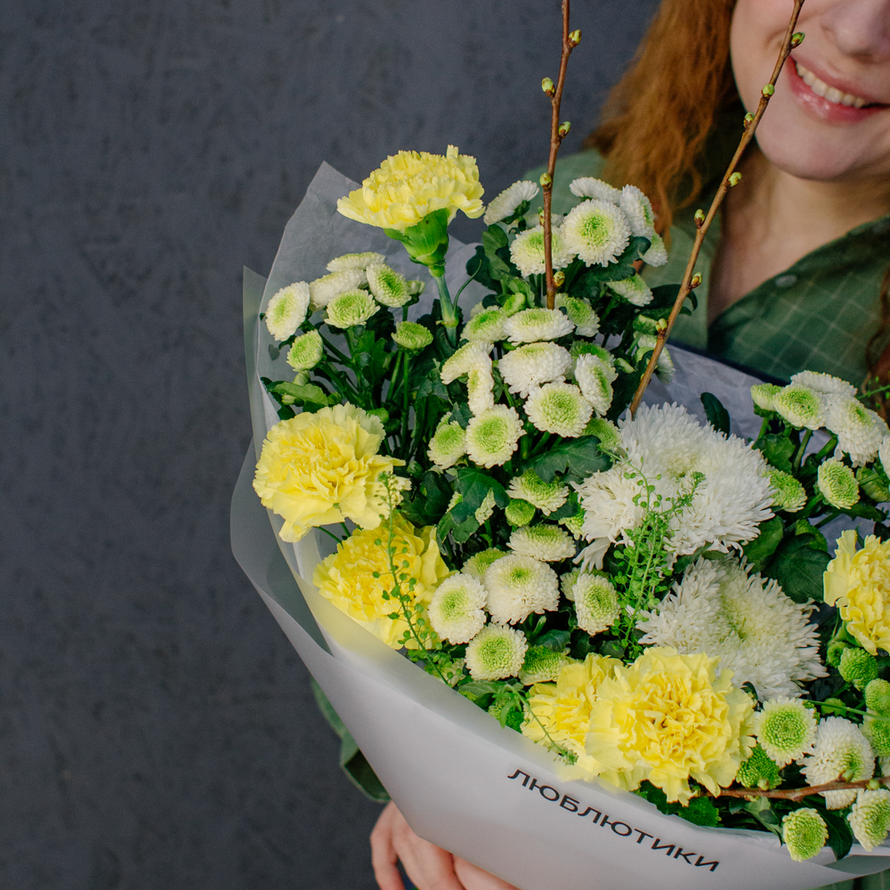 Бело-желто-зеленая гамма этого букета напоминает о первых по-настоящему теплых днях, когда солнце уже уверенно светит и все вокруг начинает зеленеть.