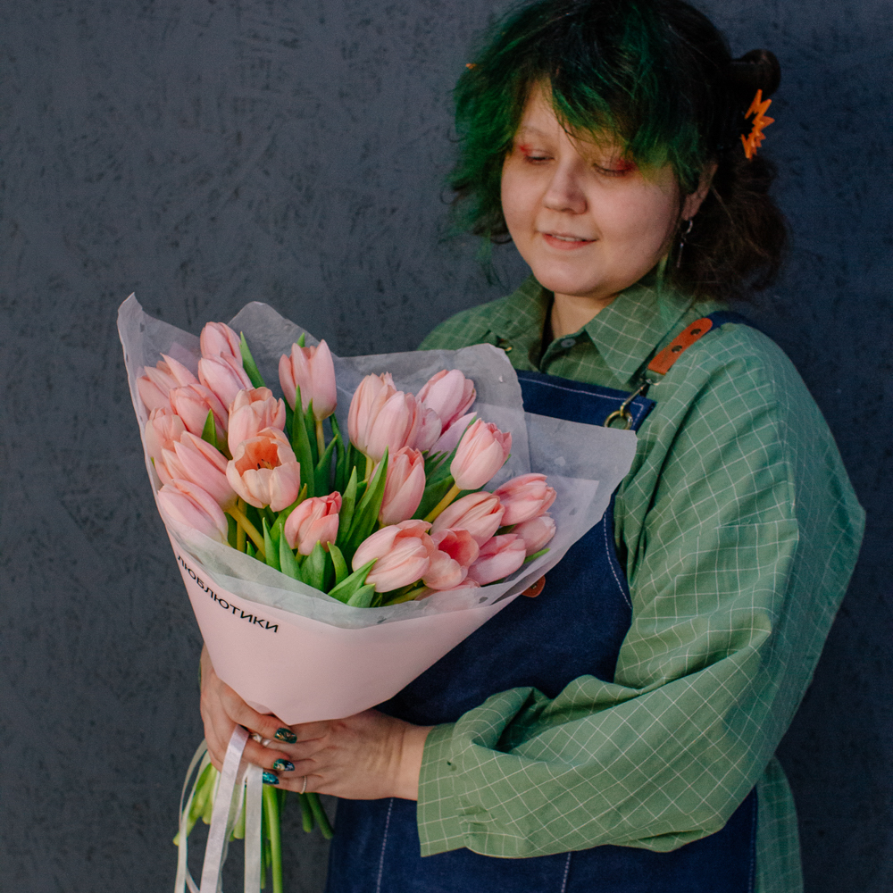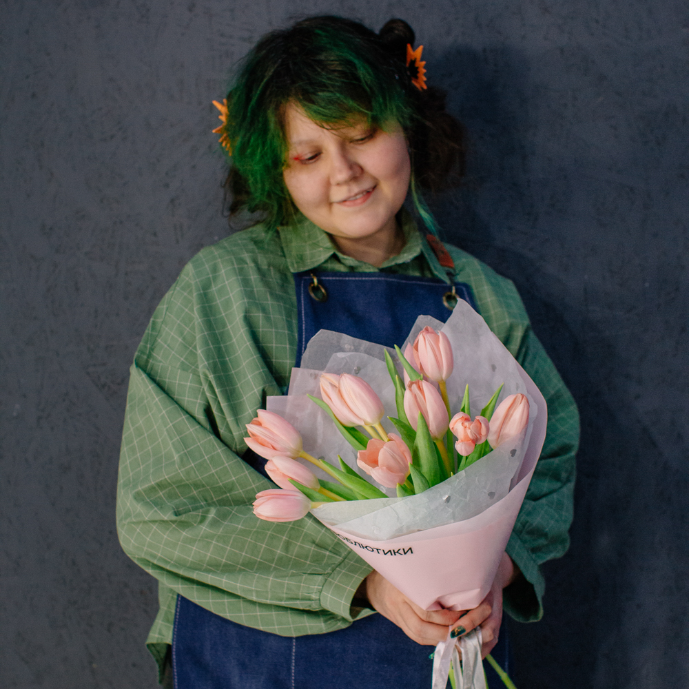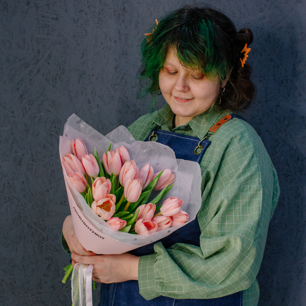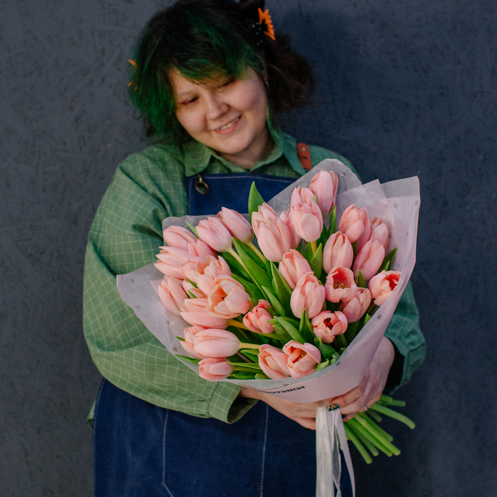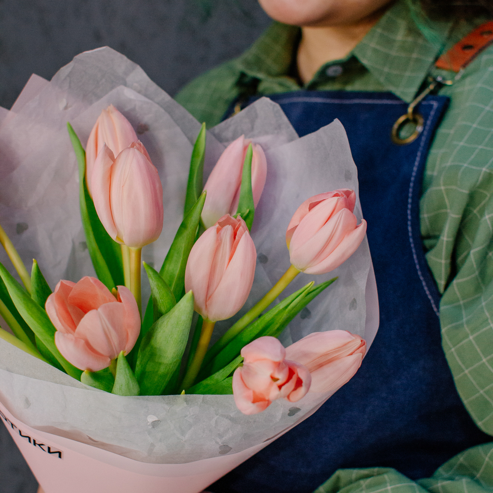 Букеты из тюльпанов при сборке выглядят небольшими, но продолжают расти и раскрываться у получателя дома. Тюльпаны почти не имеют запаха — удобно для аллергиков.