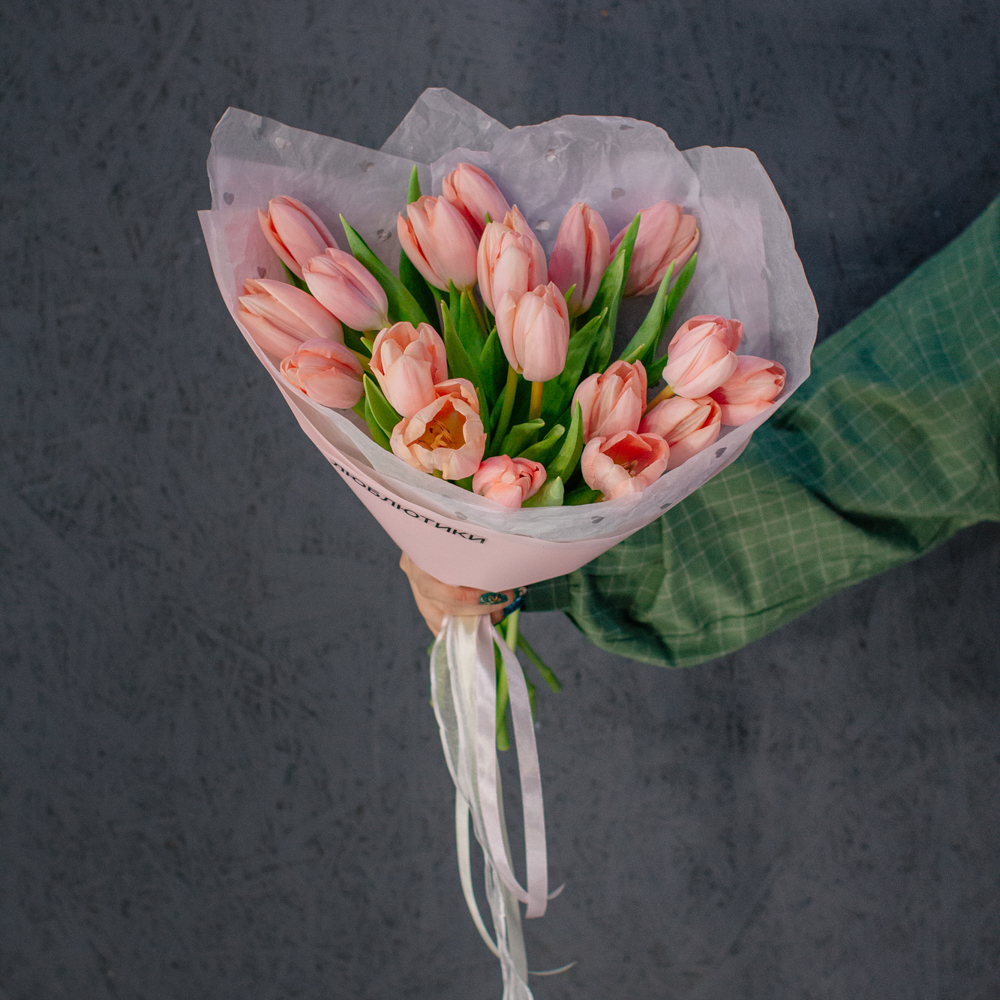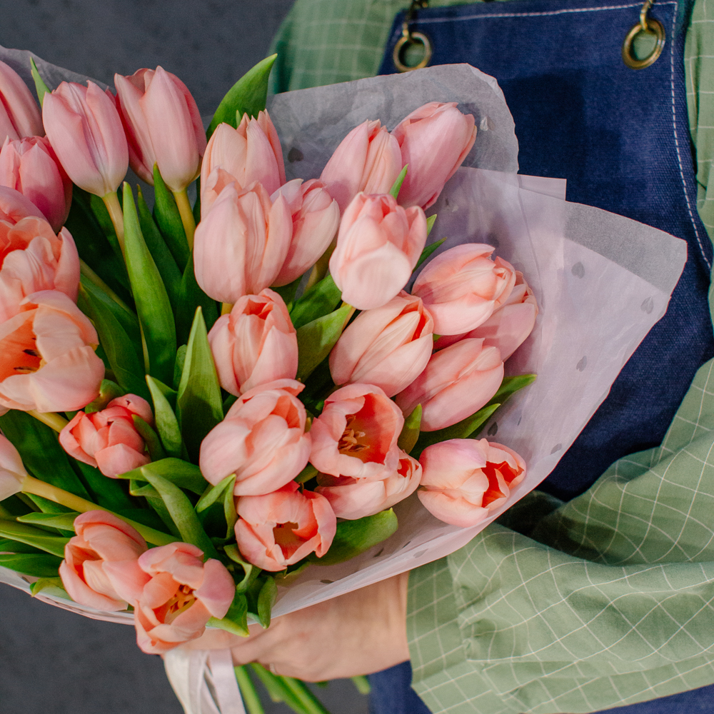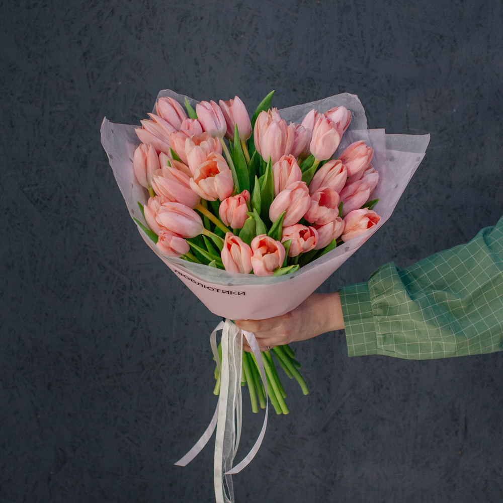 Букет из нежных персиковых/лососевых тюльпанов. Цвет с легким переходом к кремовому. Лепестки плотные, бутоны хорошо держат форму.