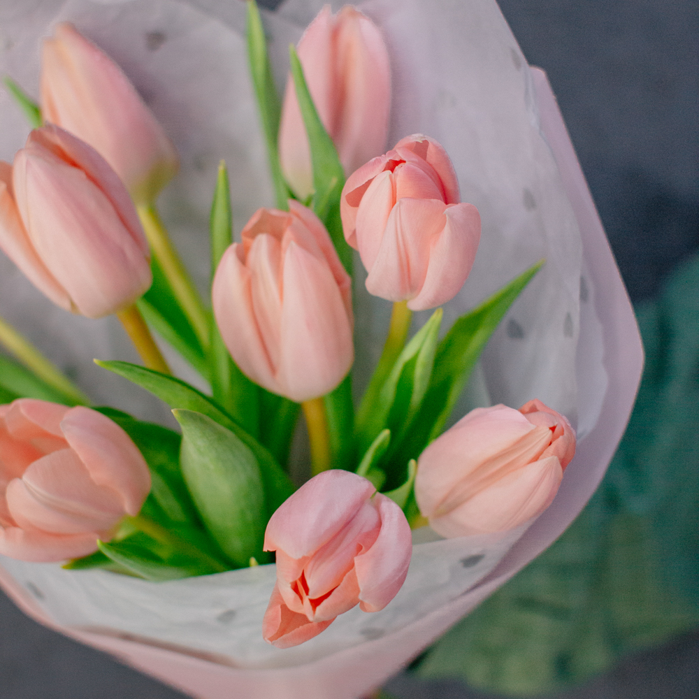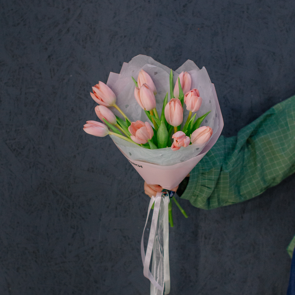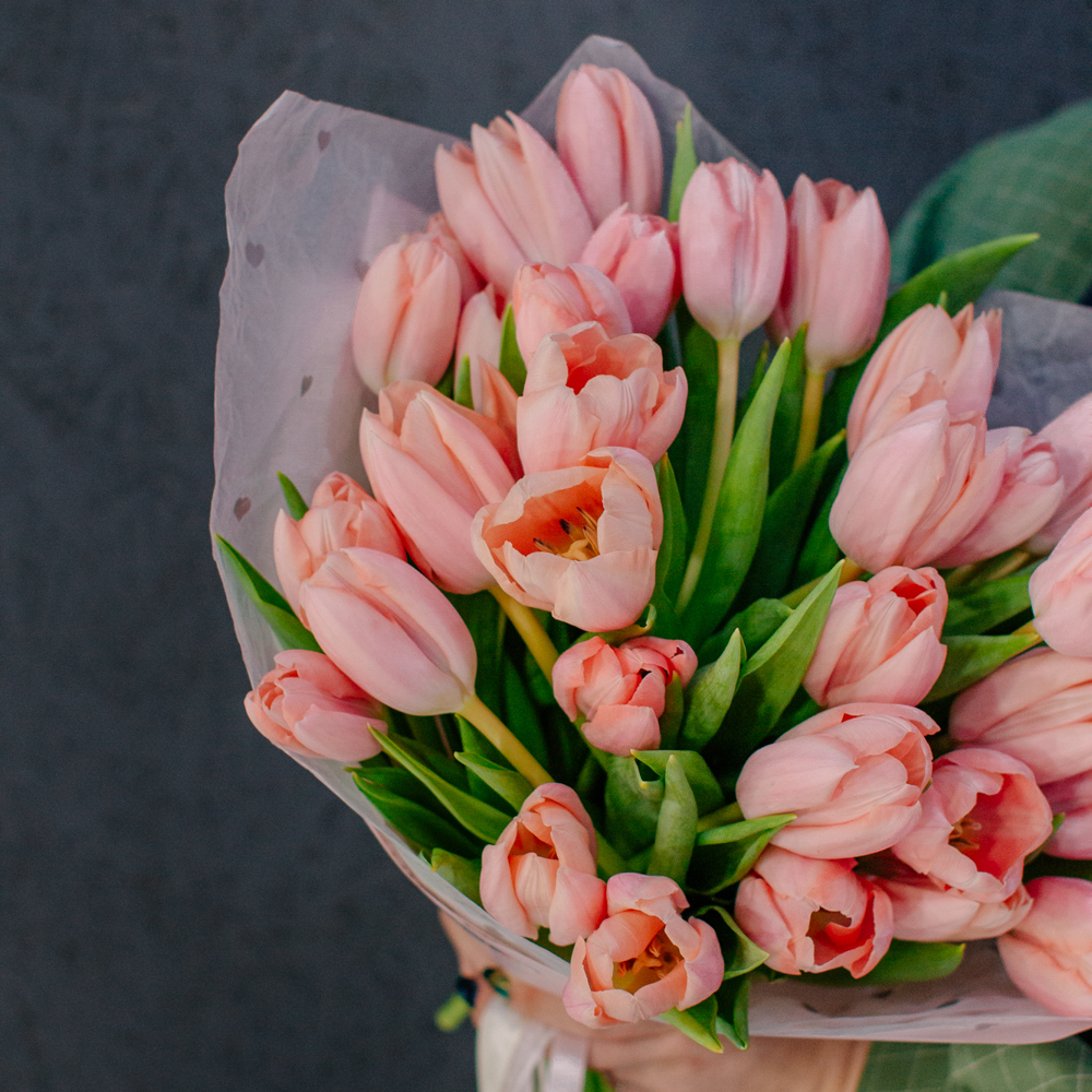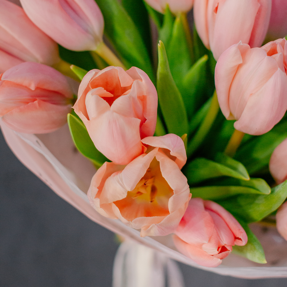 Букет из нежных персиковых/лососевых тюльпанов. Цвет с легким переходом к кремовому. Лепестки плотные, бутоны хорошо держат форму.