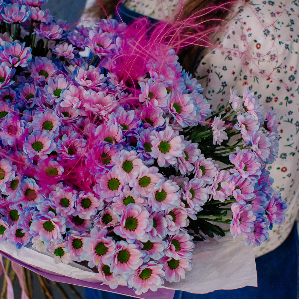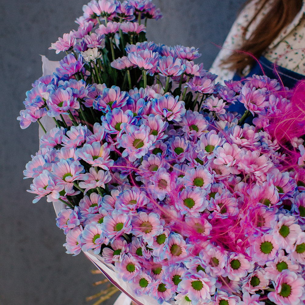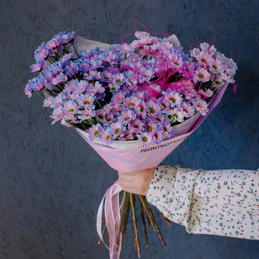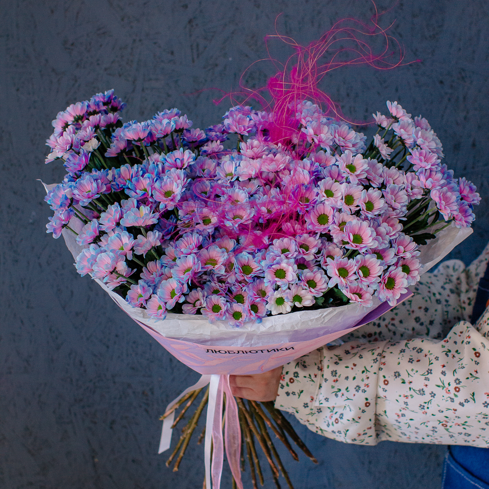 Яркий и запоминающийся букет для тех, кто любит выделяться. Его основа - необычная двуцветная сантини, каждый бутон которой словно расписан акварелью, что создает эффект сложного мерцающего оттенка.