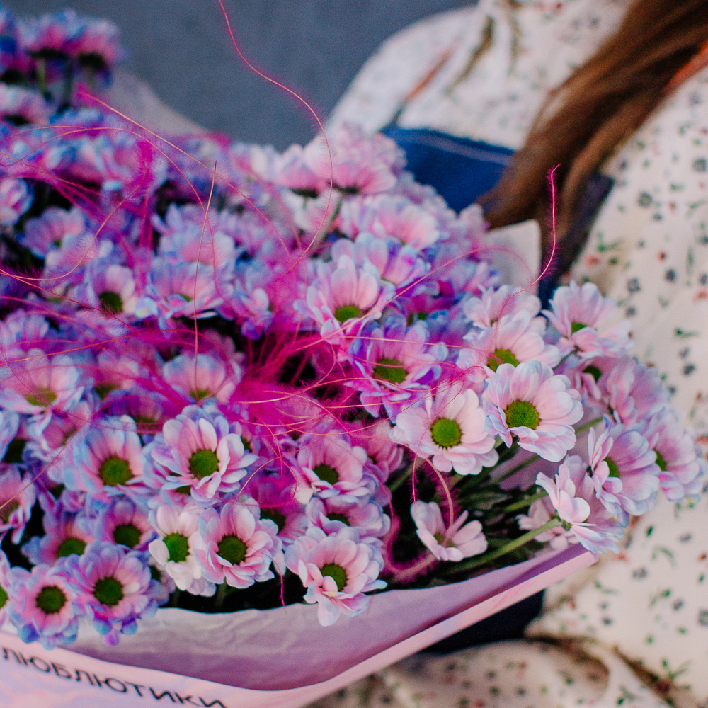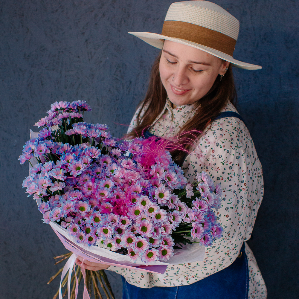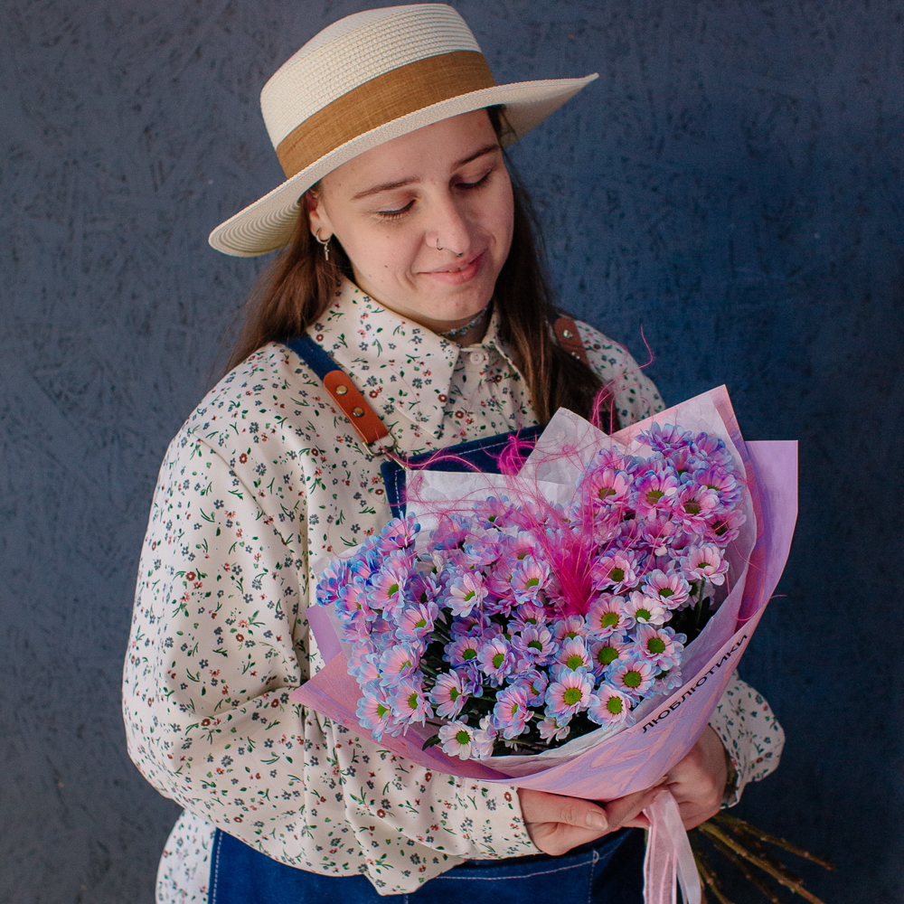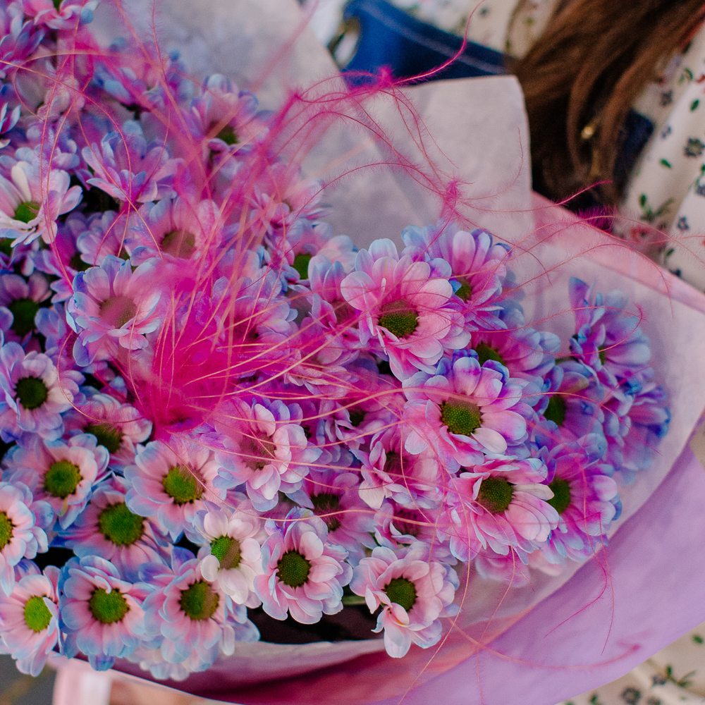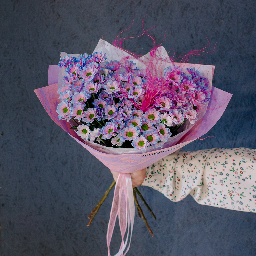 Яркий и запоминающийся букет для тех, кто любит выделяться. Его основа - необычная двуцветная сантини, каждый бутон которой словно расписан акварелью, что создает эффект сложного мерцающего оттенка.