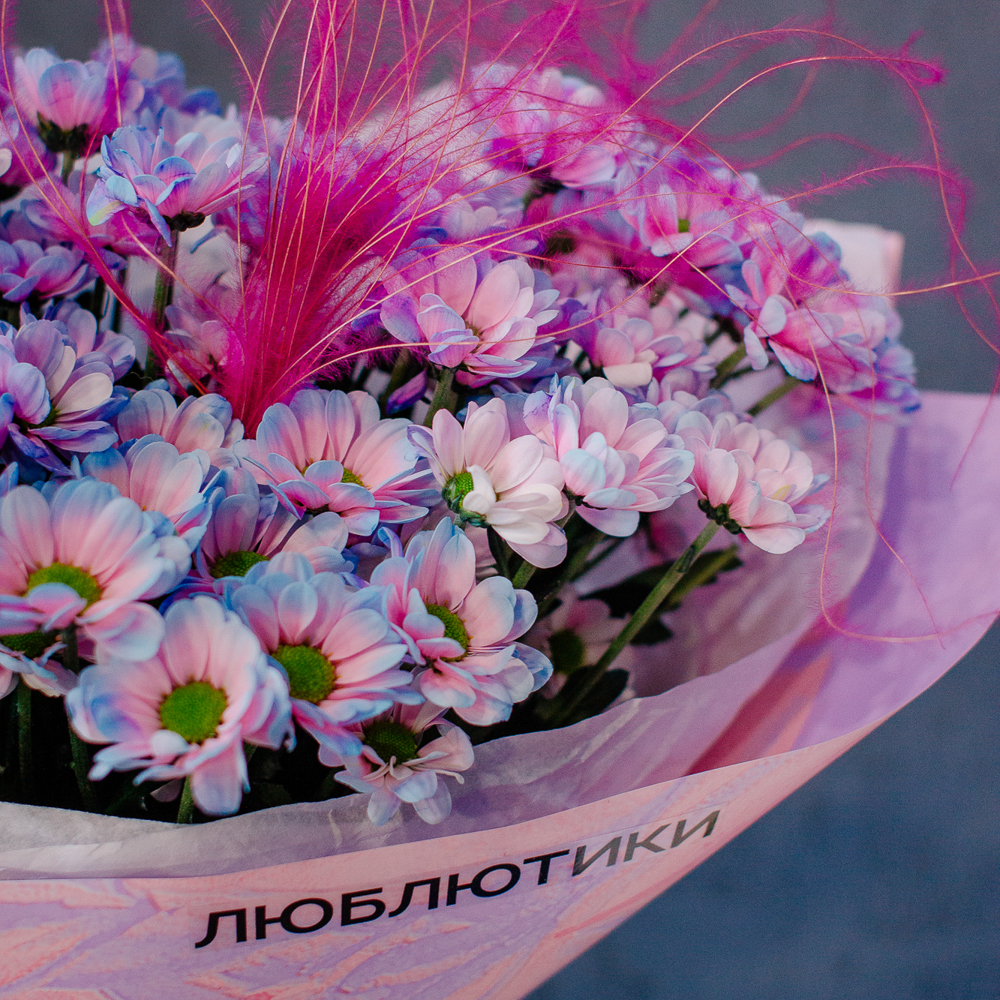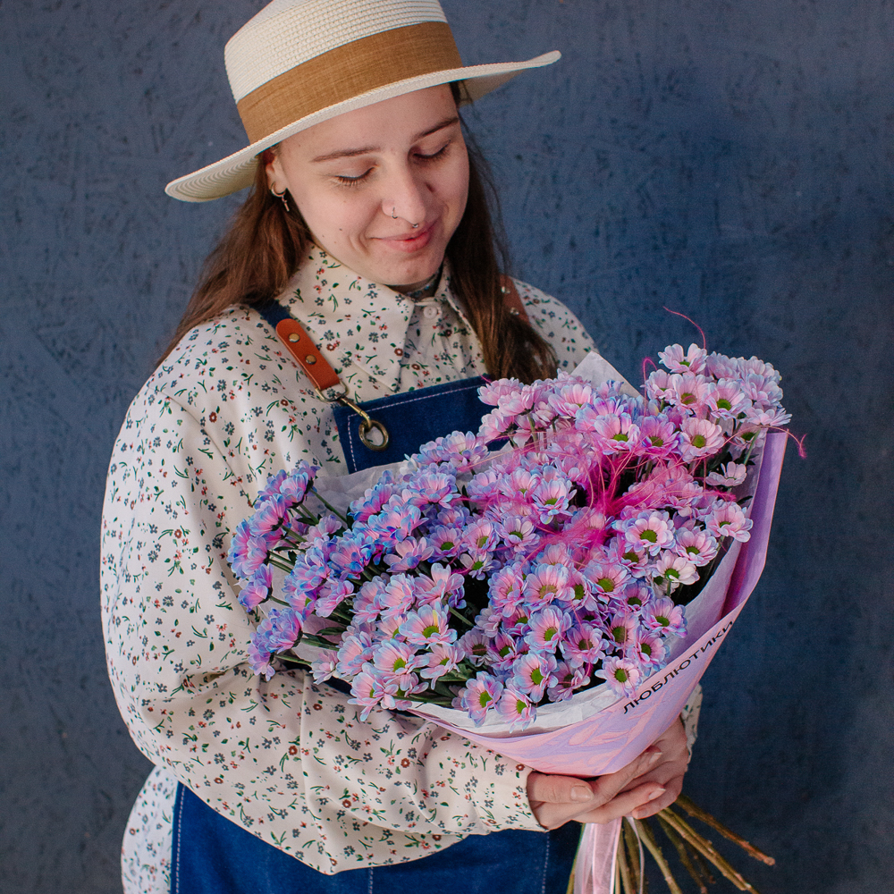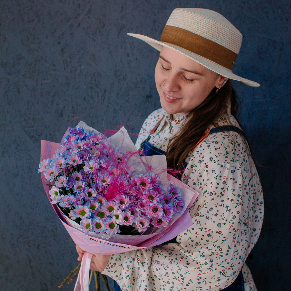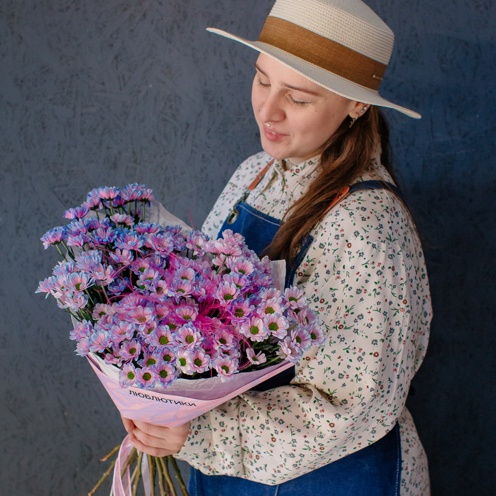 Яркий и запоминающийся букет для тех, кто любит выделяться. Его основа - необычная двуцветная сантини, каждый бутон которой словно расписан акварелью, что создает эффект сложного мерцающего оттенка.