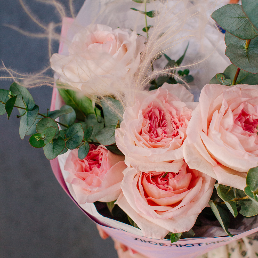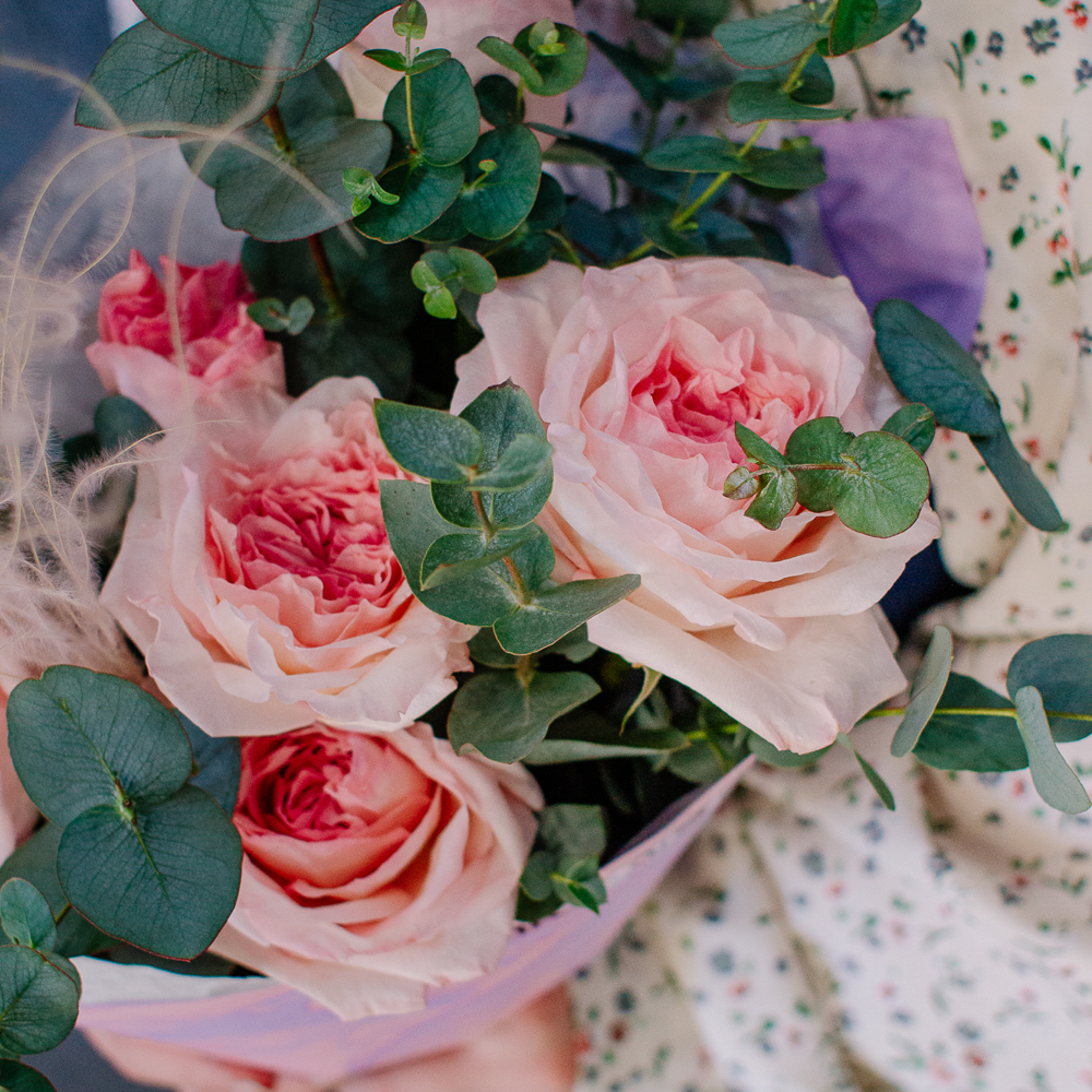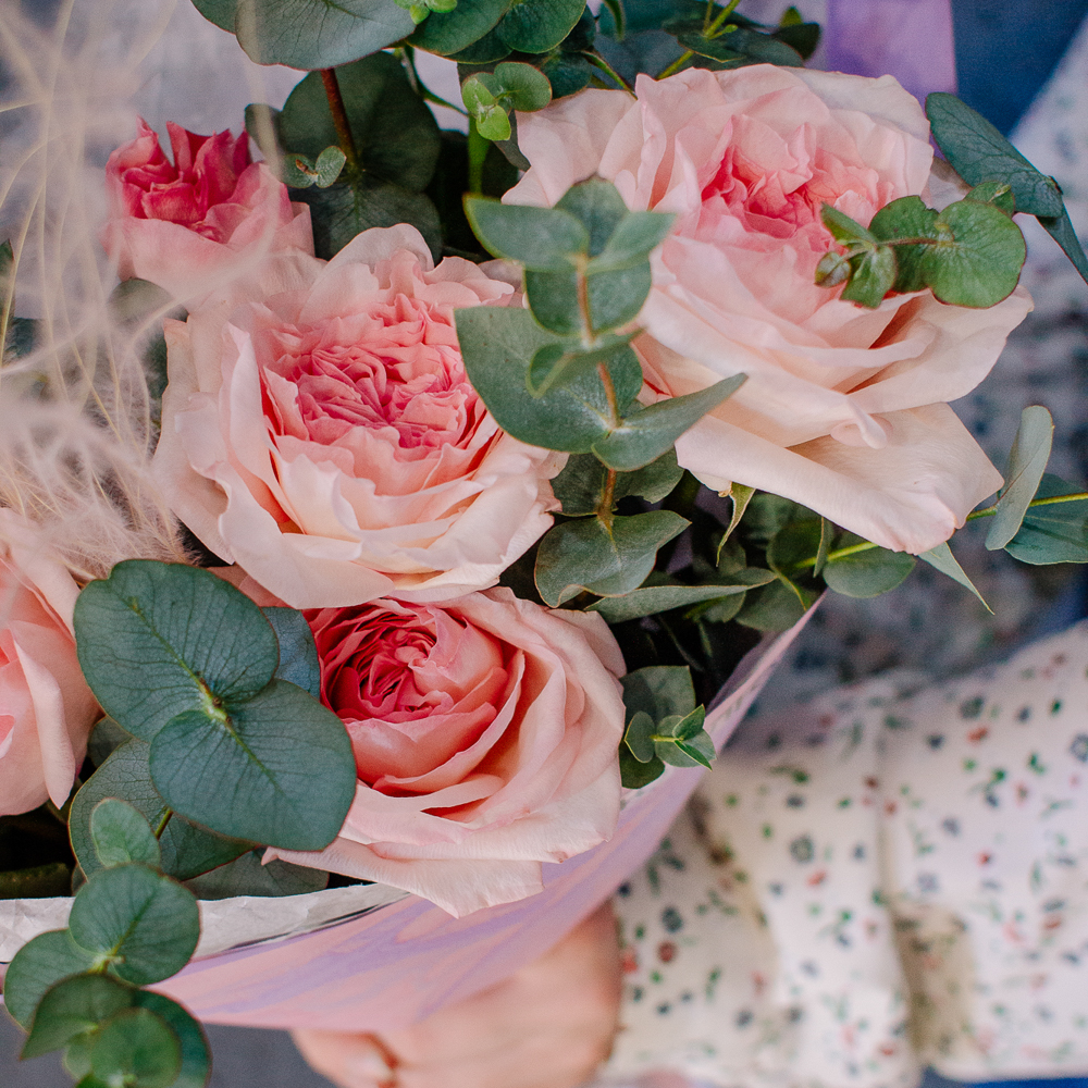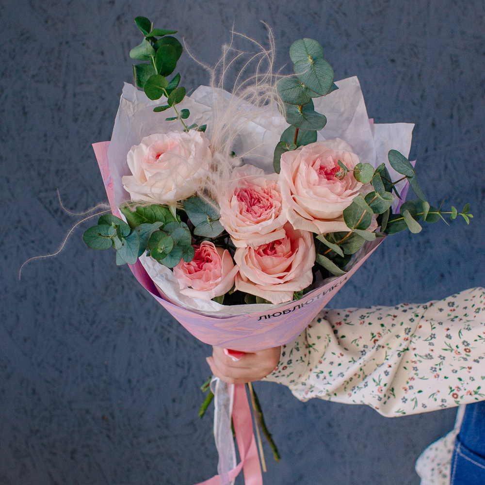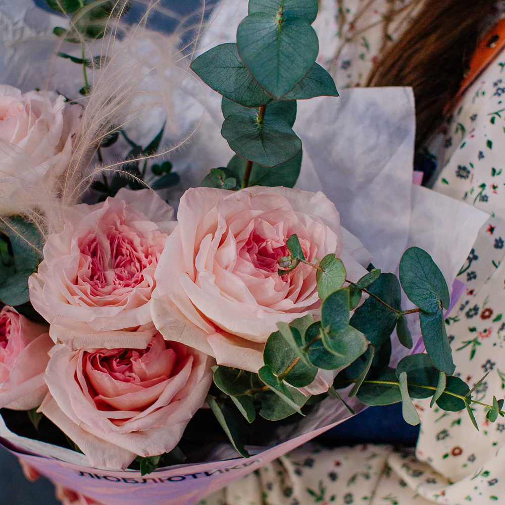 Пышные пионовидные розы с насыщенным ароматом создают мягкий объём и романтичное настроение, а веточки эвкалипта добавляют композиции свежесть и красивый зелёный акцент.
