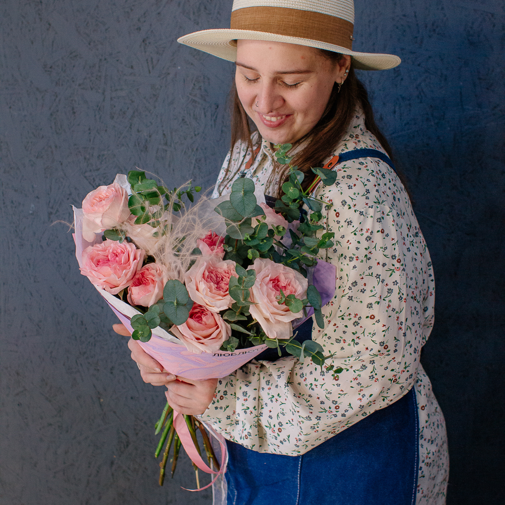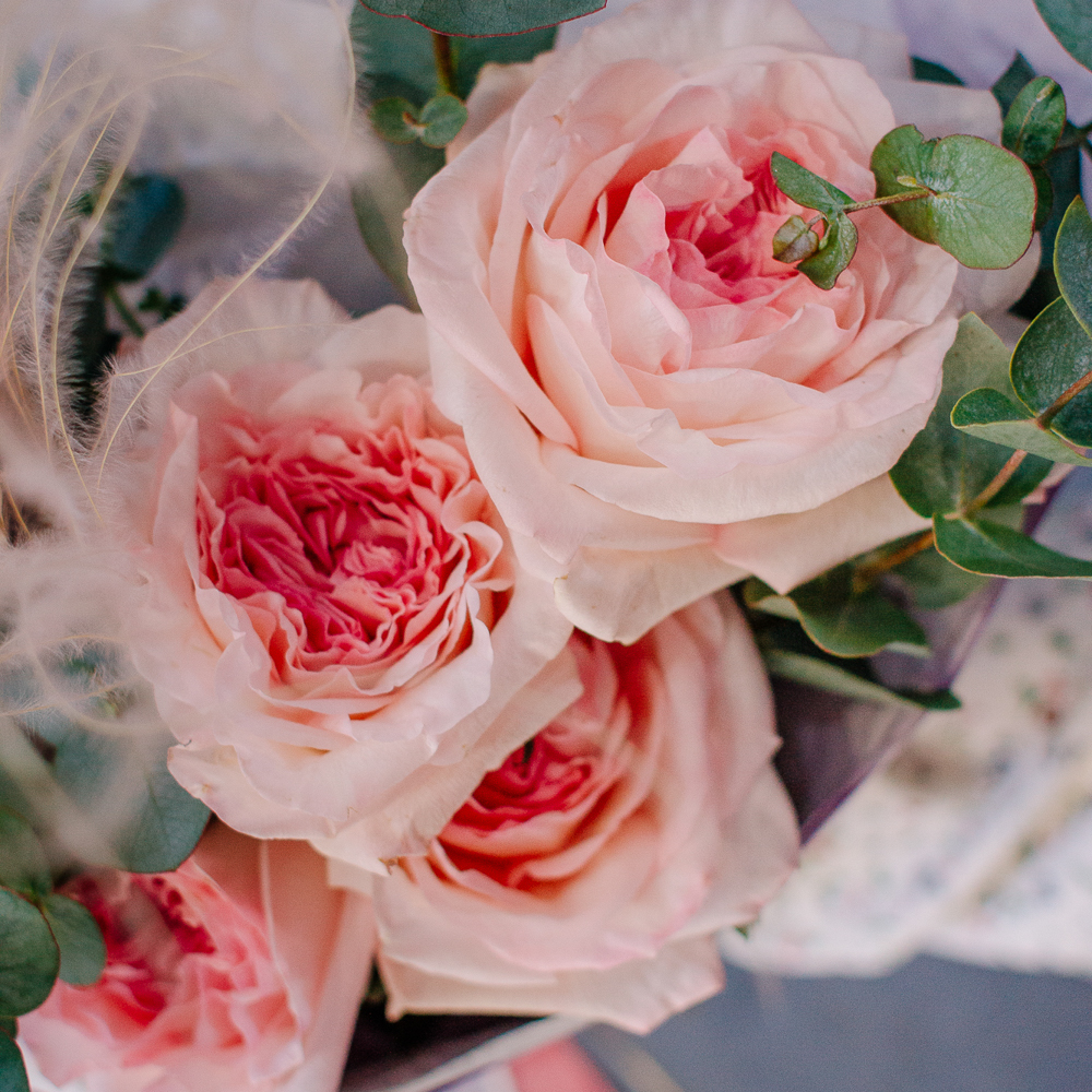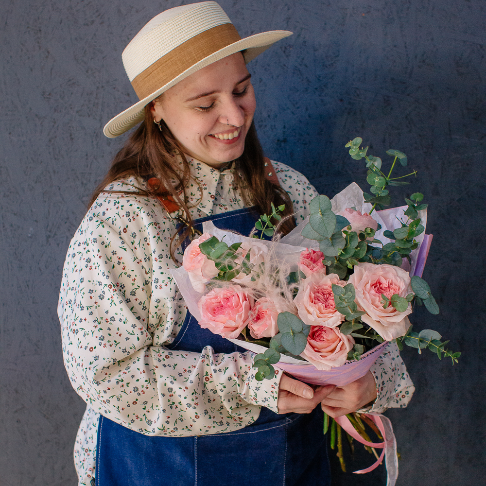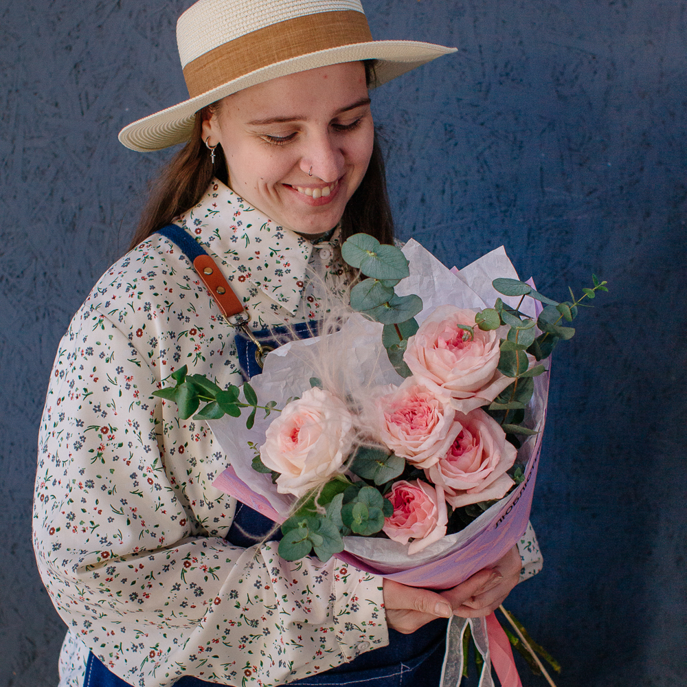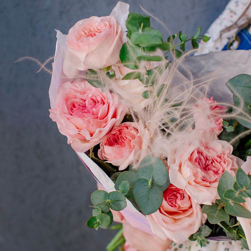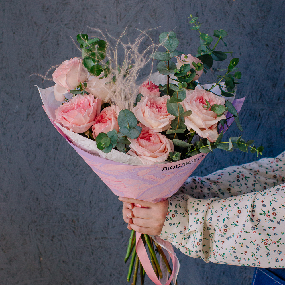 Пышные пионовидные розы с насыщенным ароматом создают мягкий объём и романтичное настроение, а веточки эвкалипта добавляют композиции свежесть и красивый зелёный акцент.