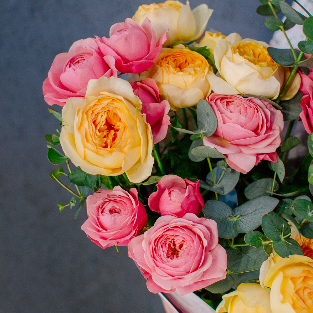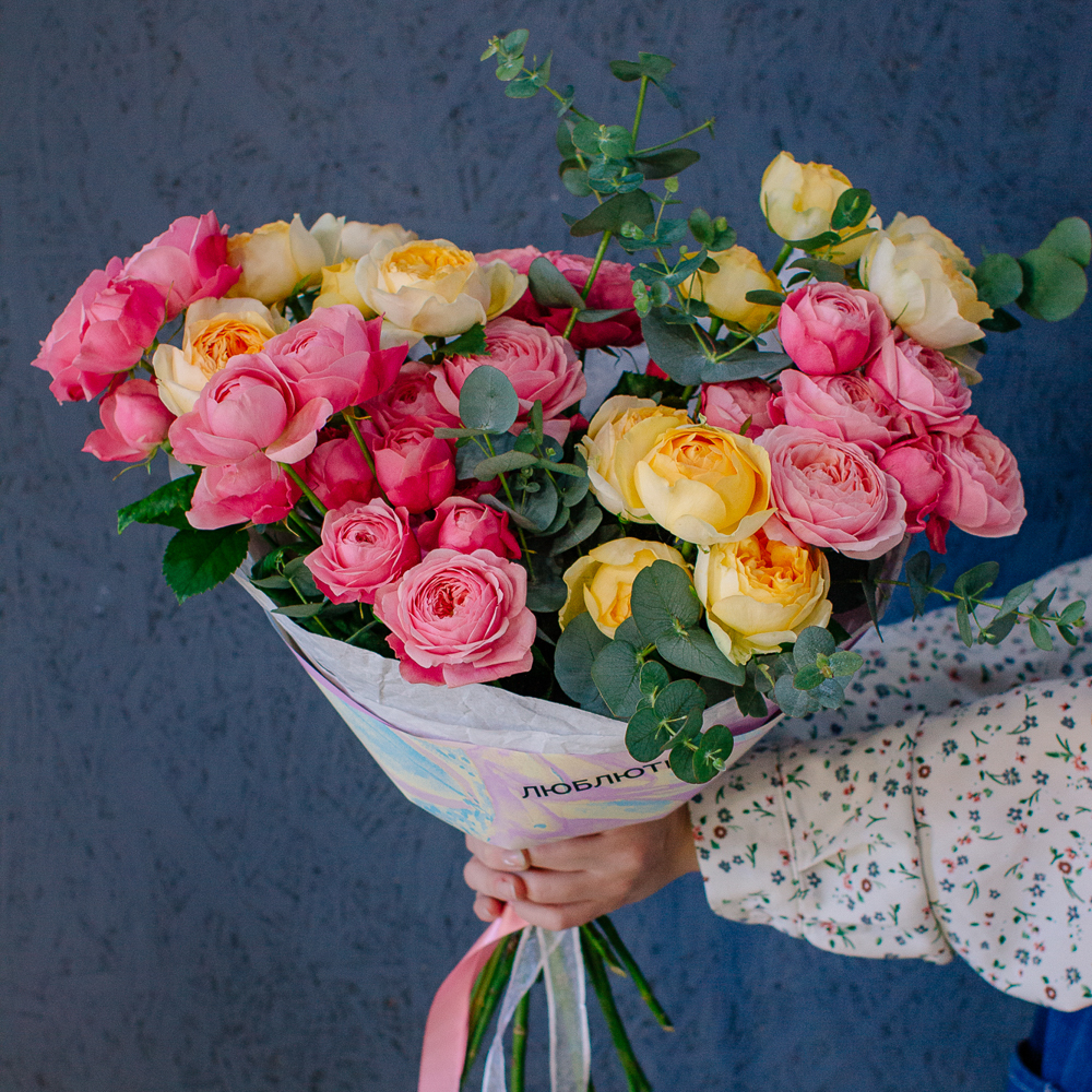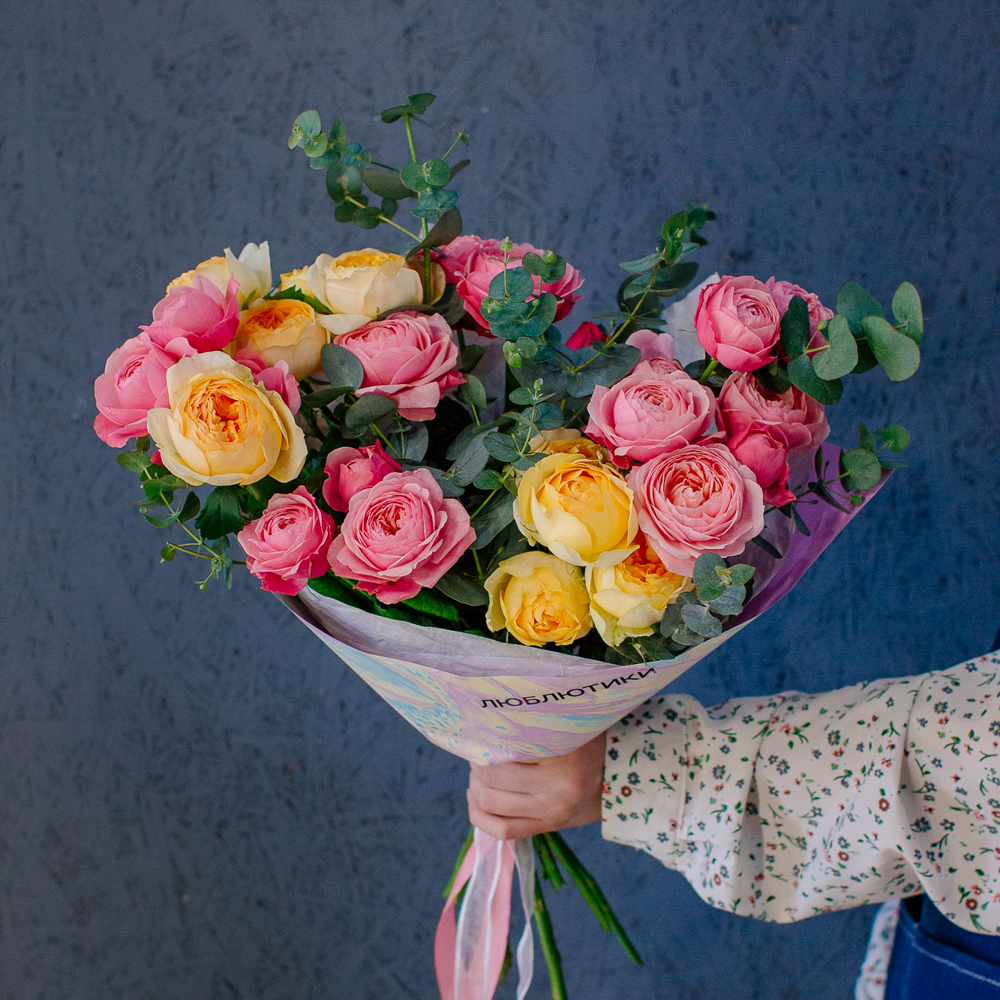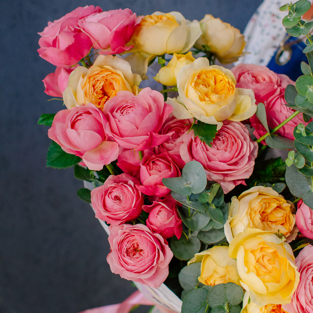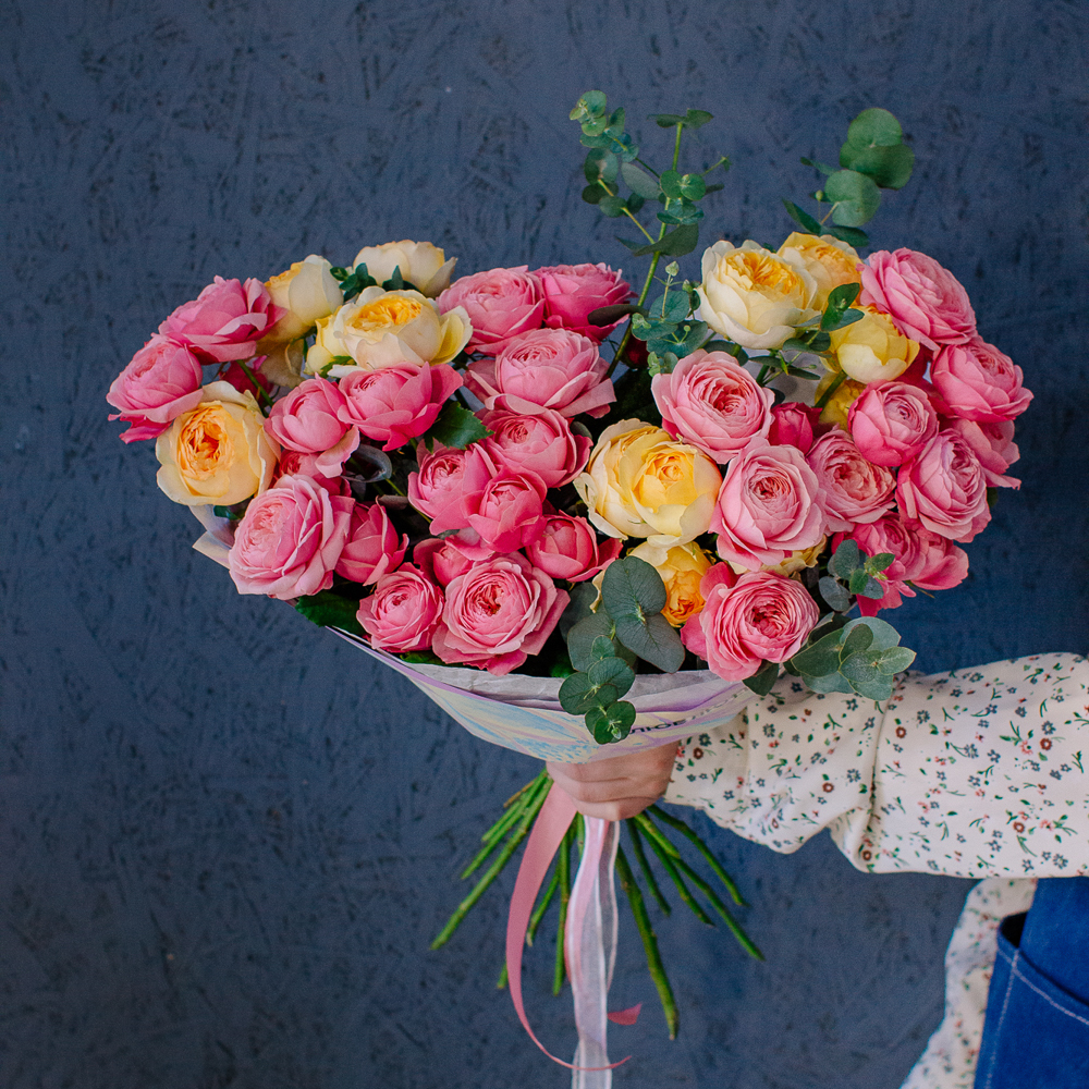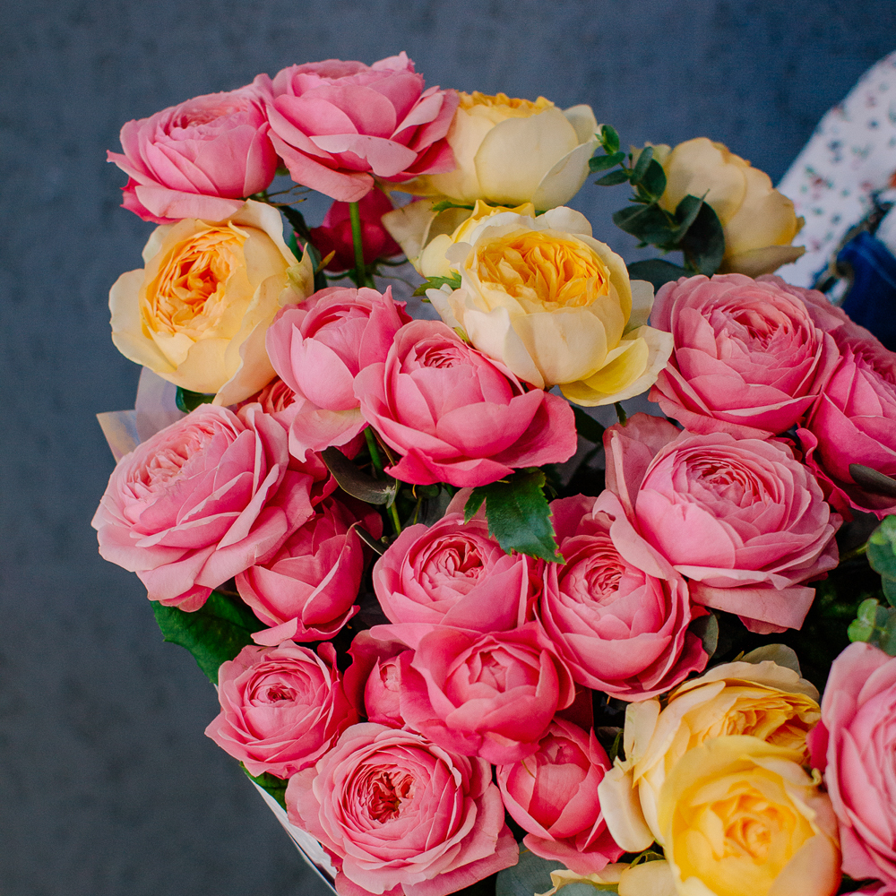 Яркий букет-микс из жёлтых и розовых кустовых пионовидных роз. Пышные веточки роз с нежной пионовидной формой создают объёмную и живую композицию, а сочетание солнечных жёлтых и теплых розовых оттенков наполняет букет светом и настроением.