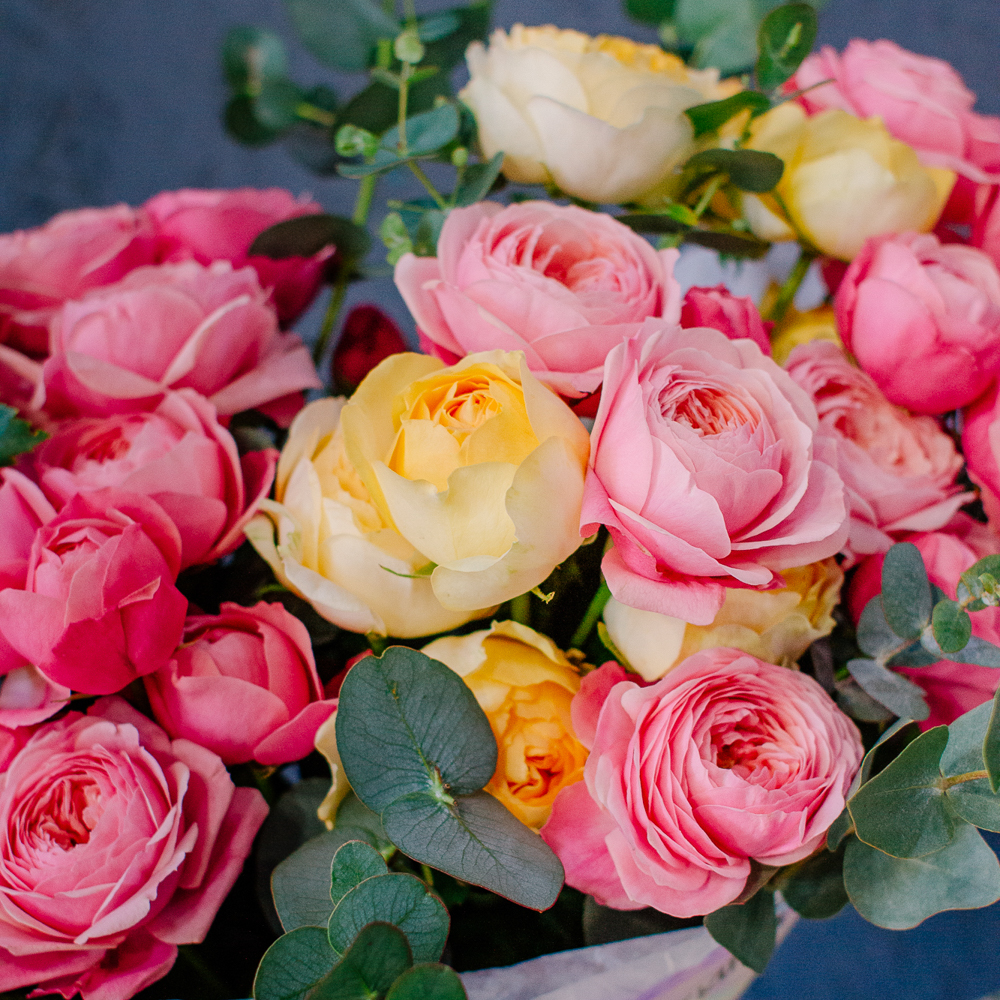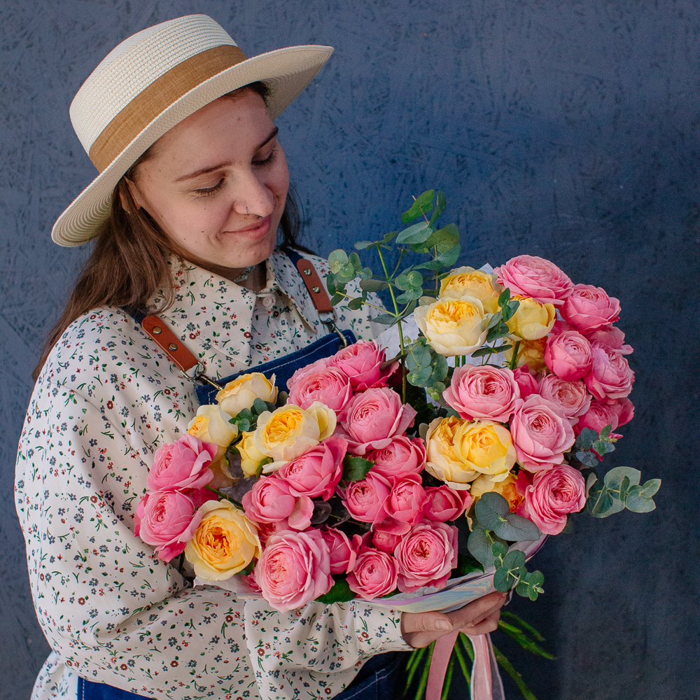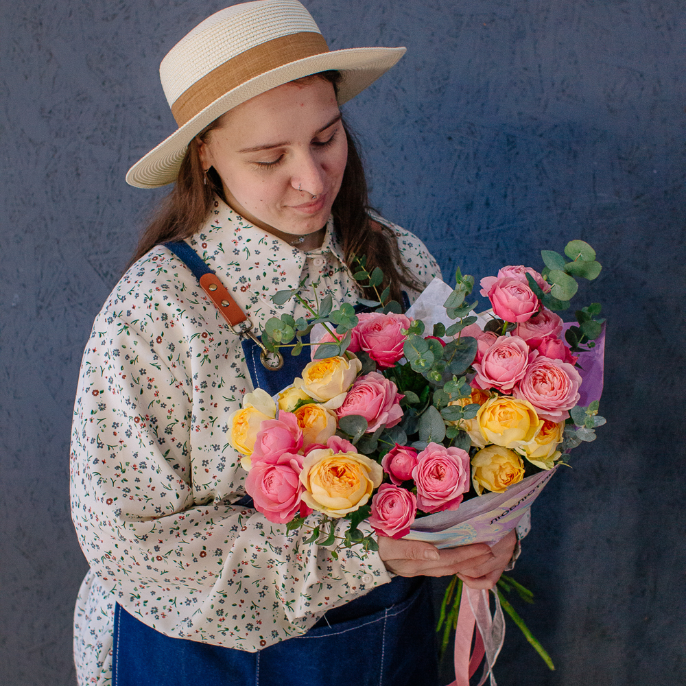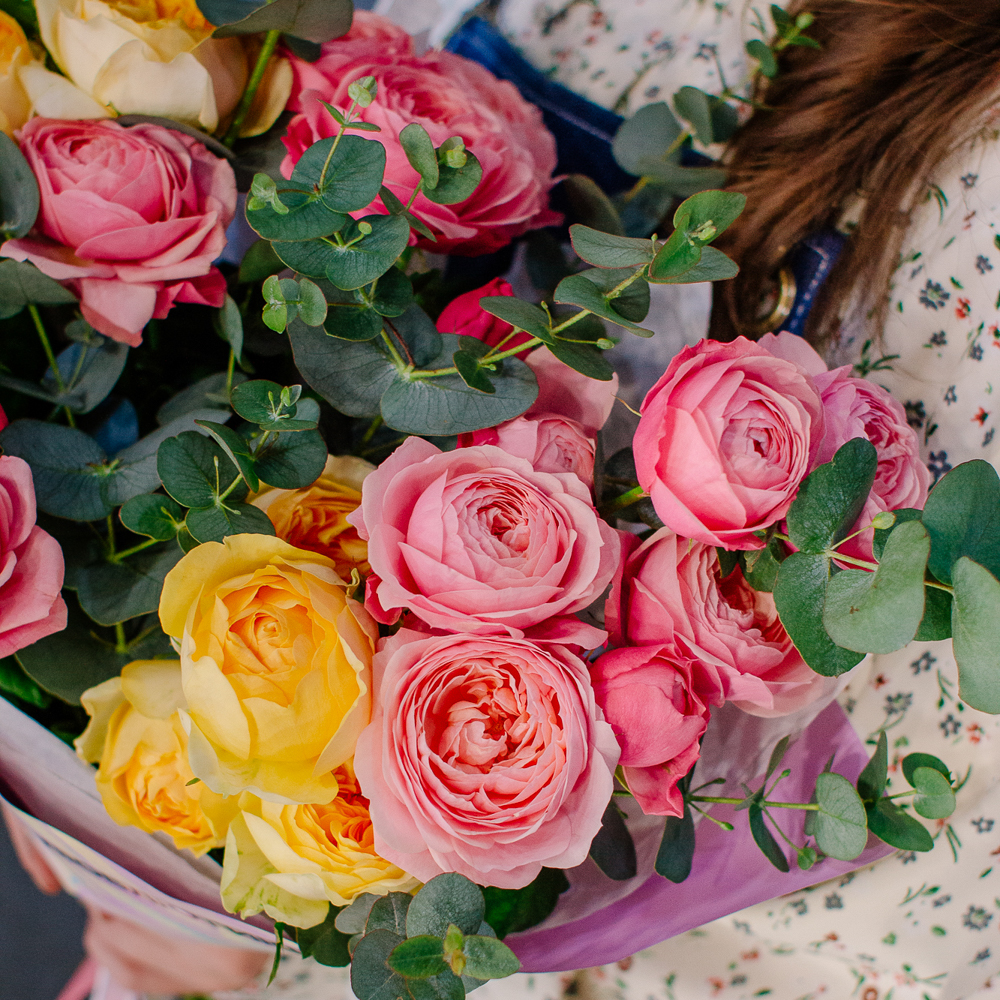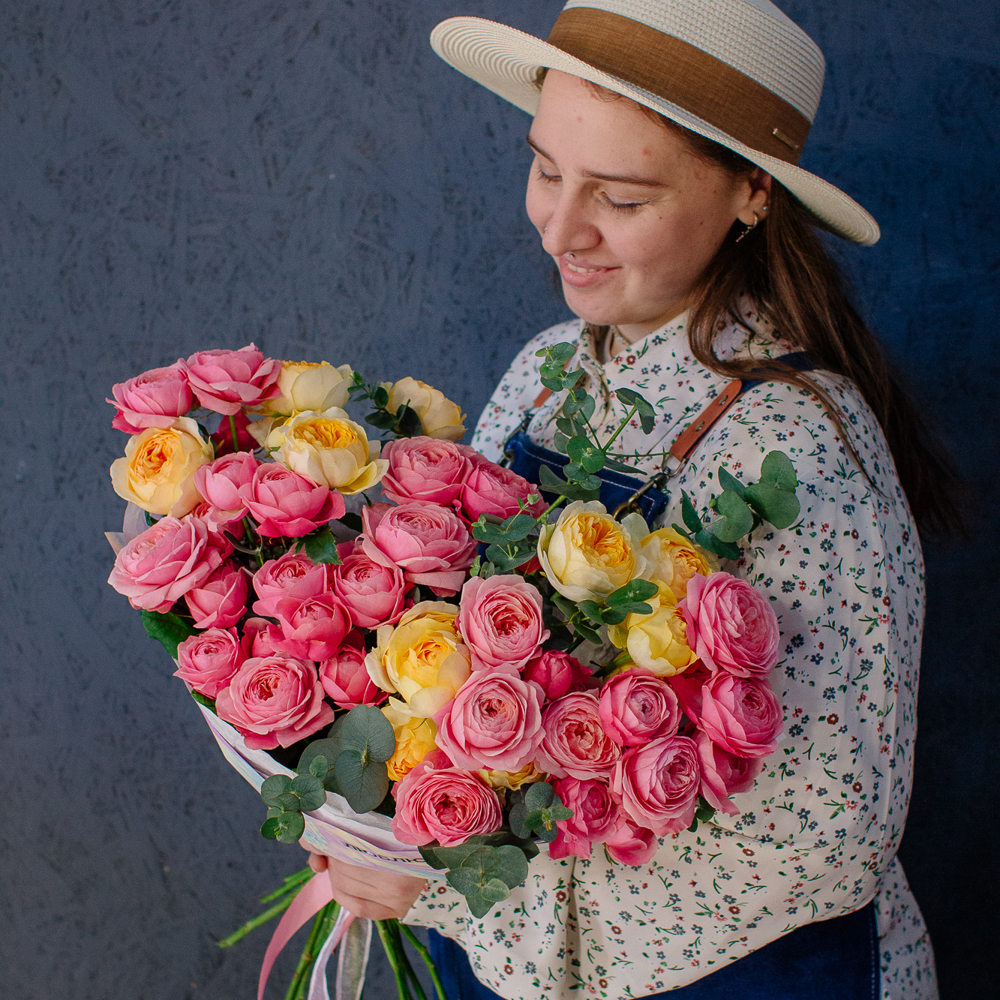 Яркий букет-микс из жёлтых и розовых кустовых пионовидных роз. Пышные веточки роз с нежной пионовидной формой создают объёмную и живую композицию, а сочетание солнечных жёлтых и теплых розовых оттенков наполняет букет светом и настроением.