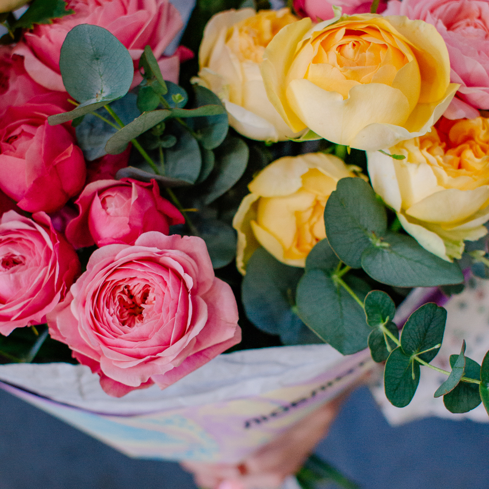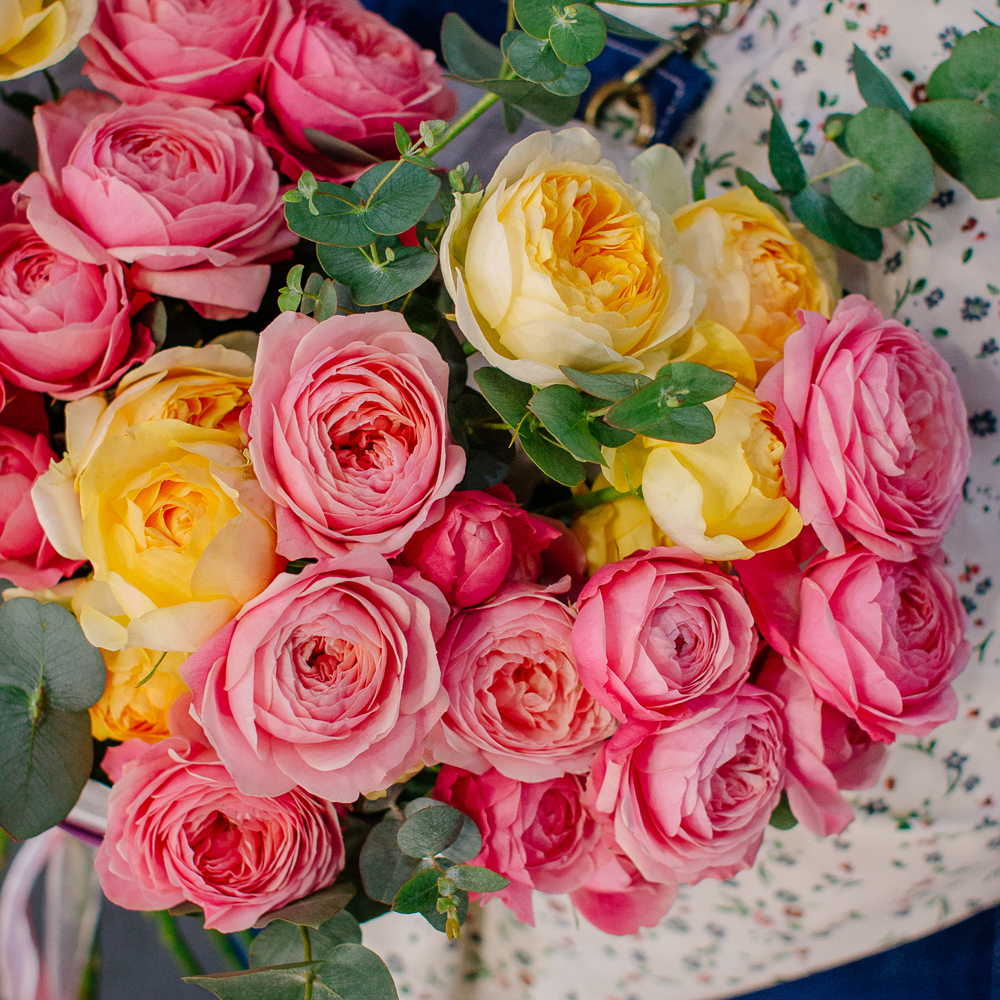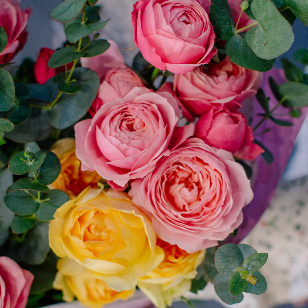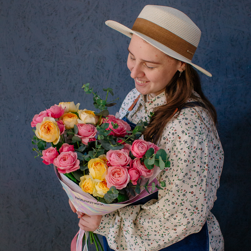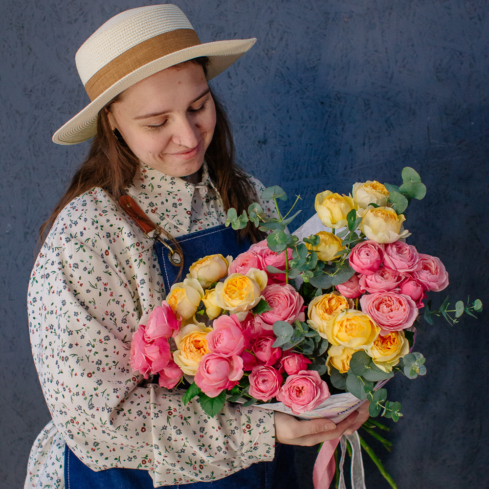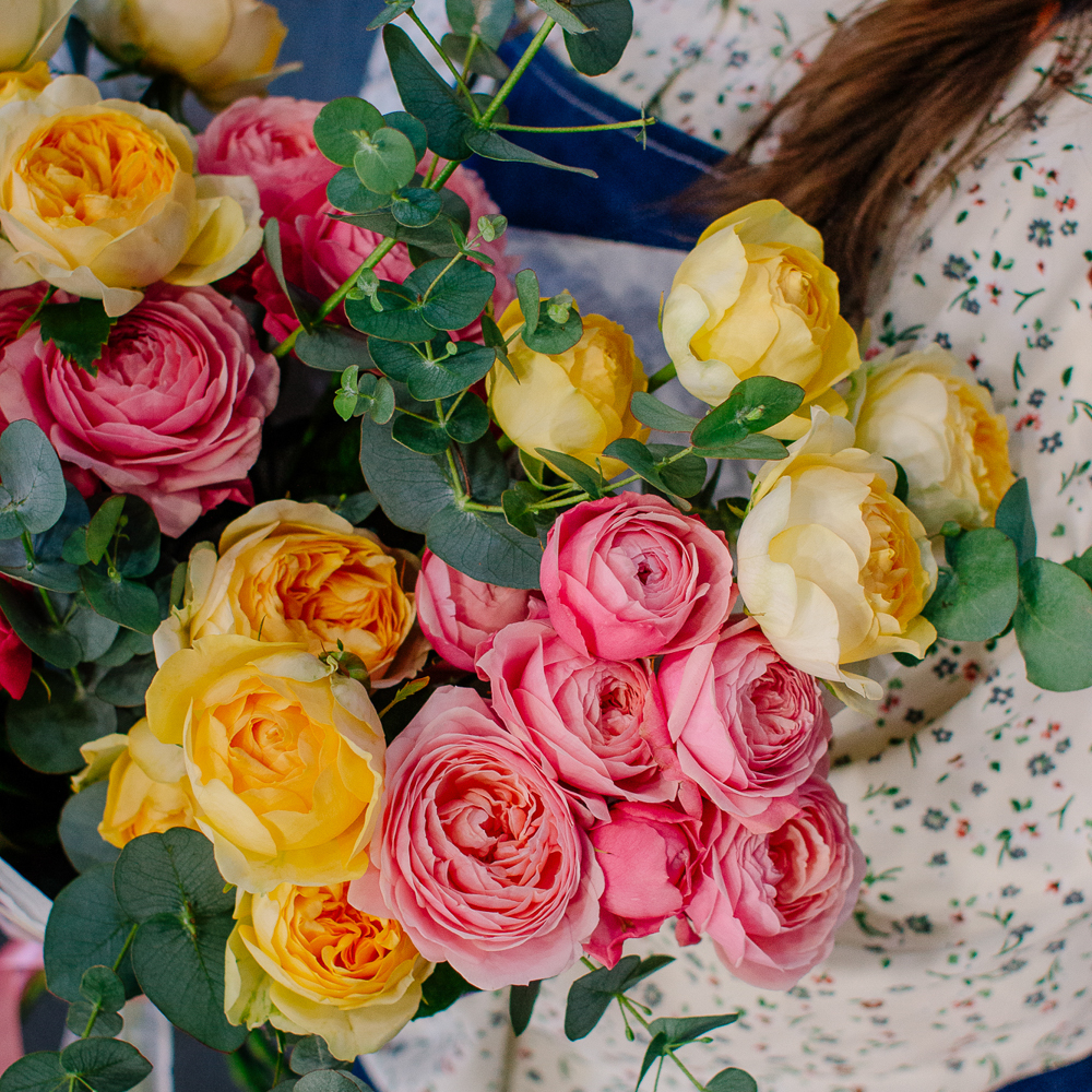 Яркий букет-микс из жёлтых и розовых кустовых пионовидных роз. Пышные веточки роз с нежной пионовидной формой создают объёмную и живую композицию, а сочетание солнечных жёлтых и теплых розовых оттенков наполняет букет светом и настроением.