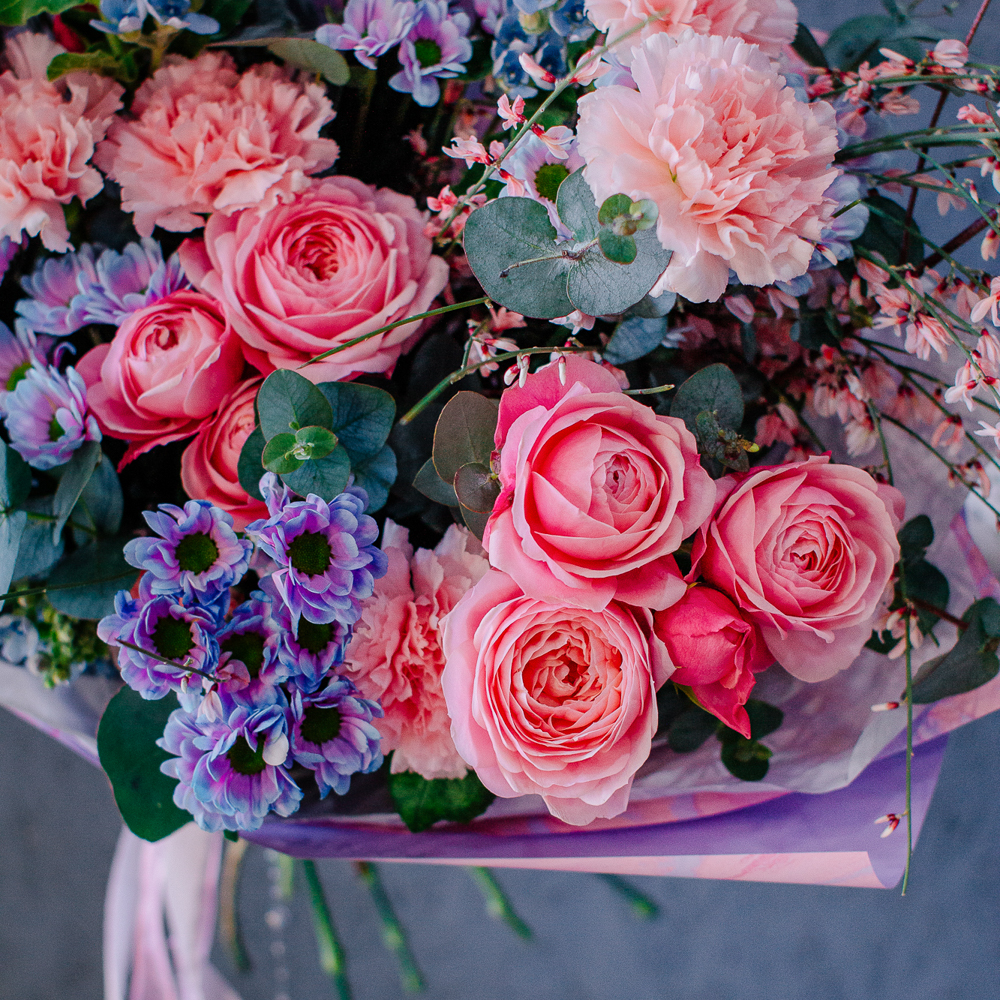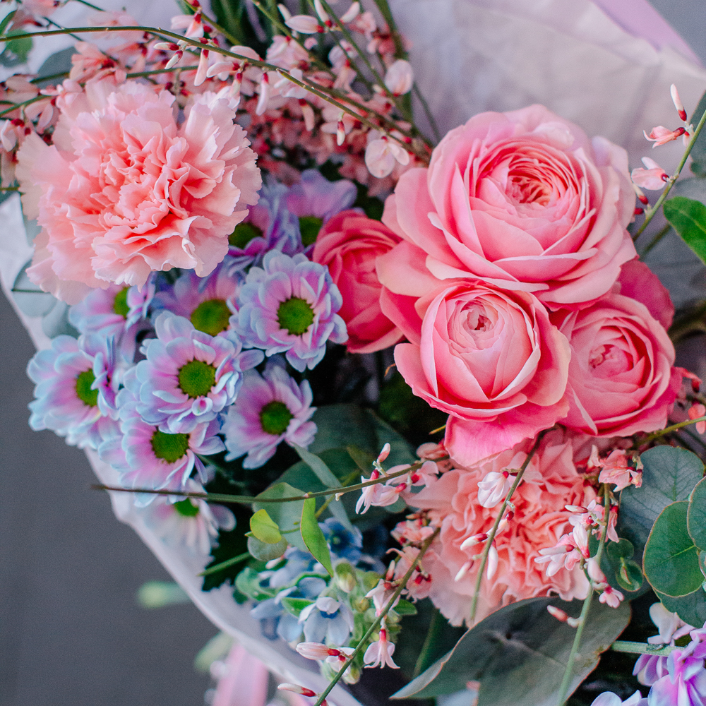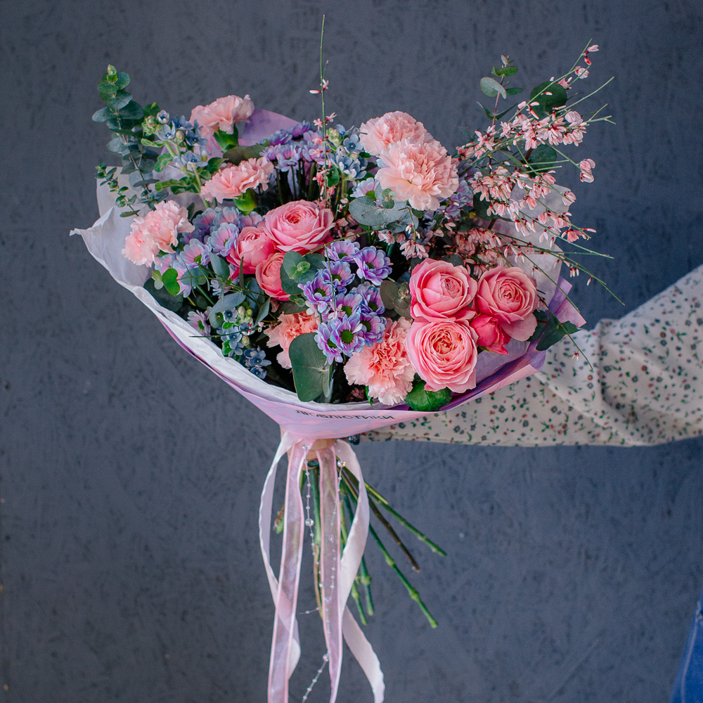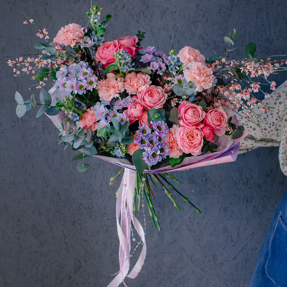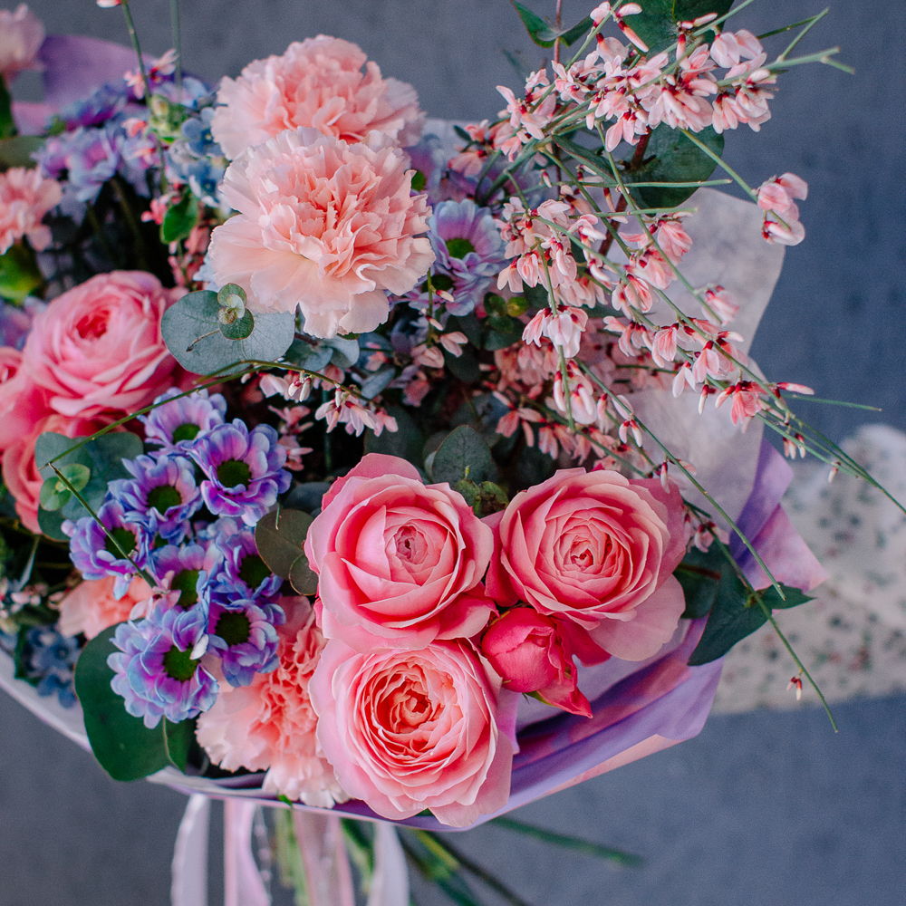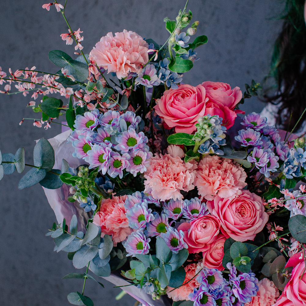 В нём собраны красивые пионовидные кустовые розы, аккуратные хризантемы сантини, нежные диантусы, изящный оксипеталум, воздушная гениста и ароматный эвкалипт - всё вместе создаёт мягкий, романтичный и при этом живой образ.