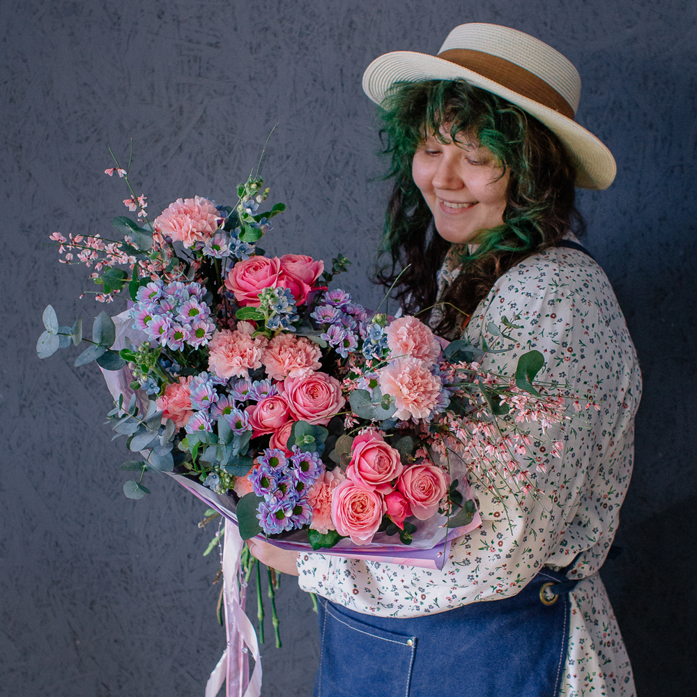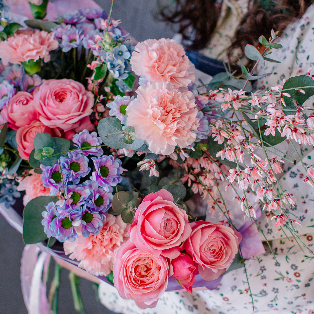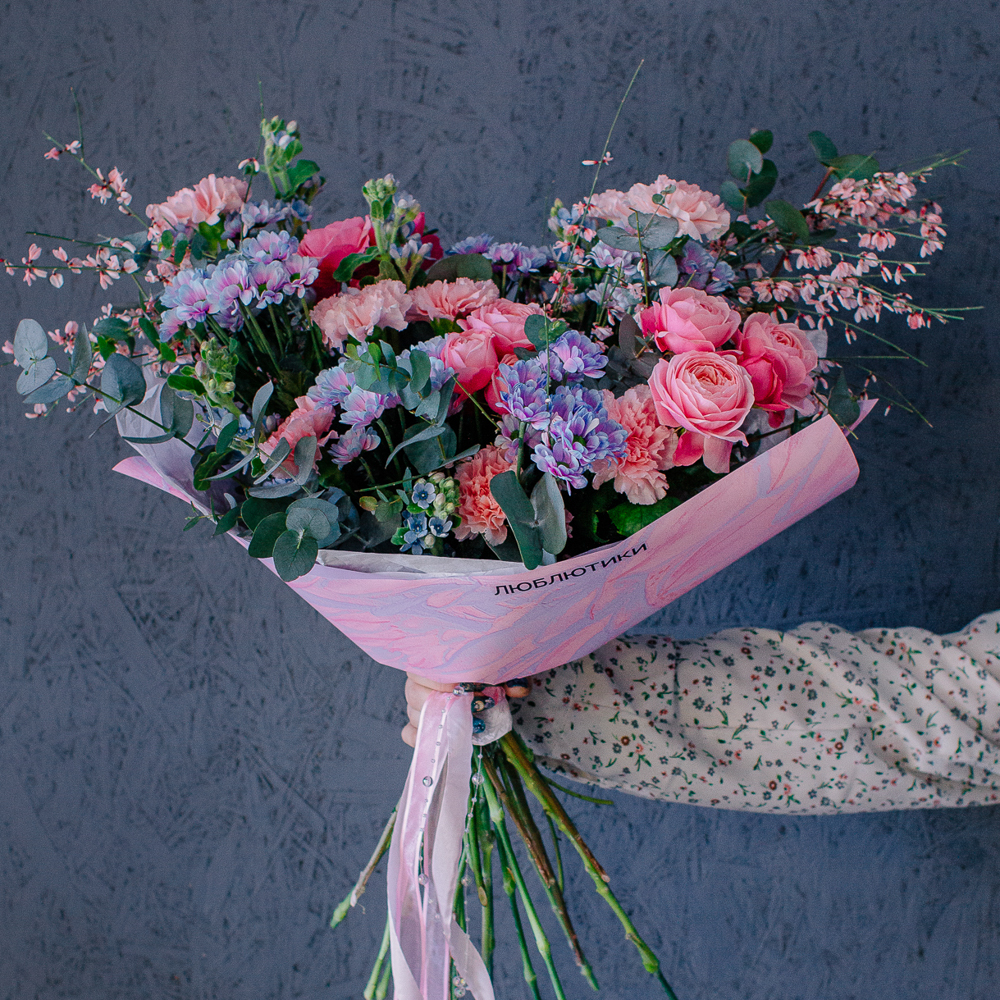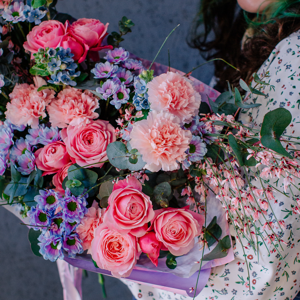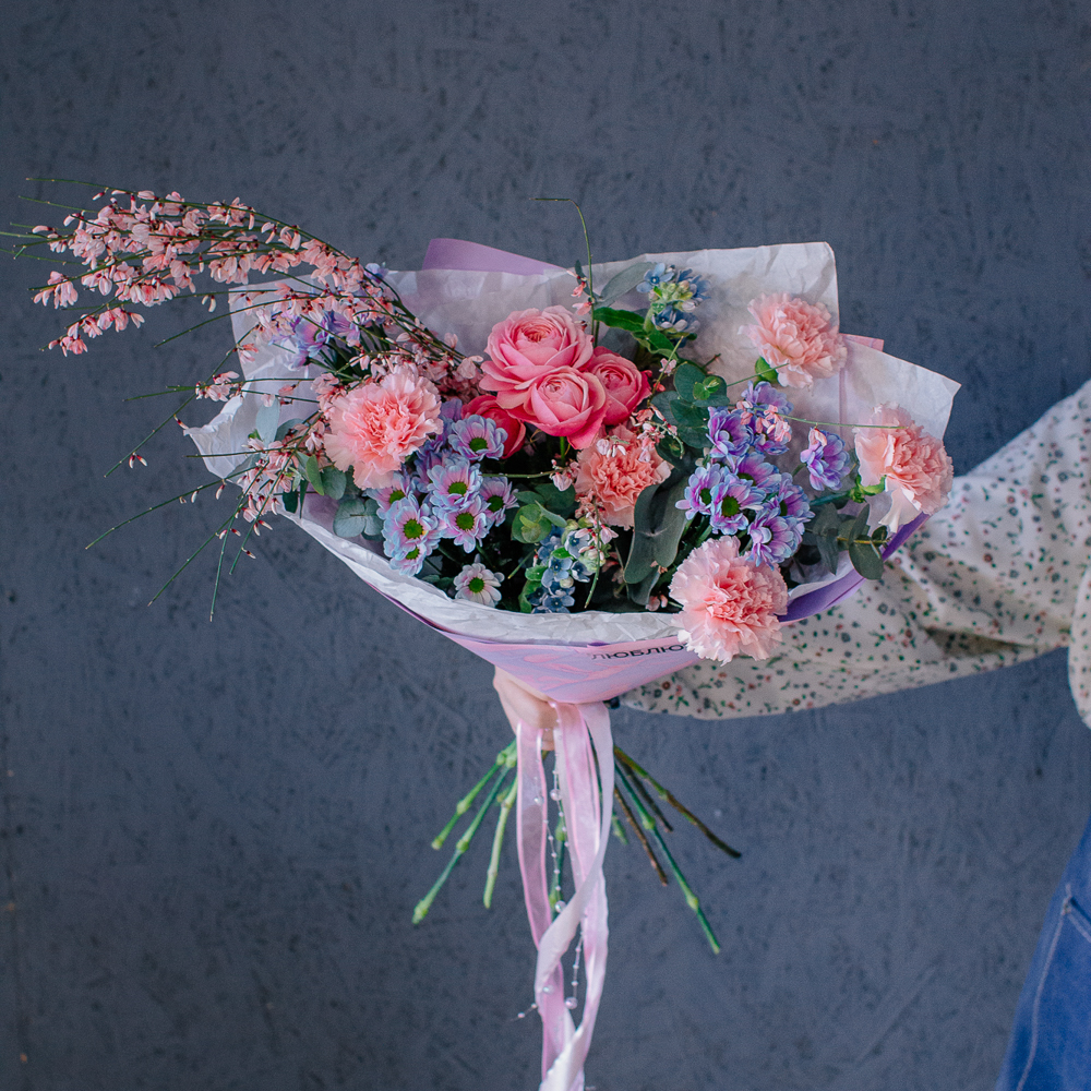 В нём собраны красивые пионовидные кустовые розы, аккуратные хризантемы сантини, нежные диантусы, изящный оксипеталум, воздушная гениста и ароматный эвкалипт - всё вместе создаёт мягкий, романтичный и при этом живой образ.