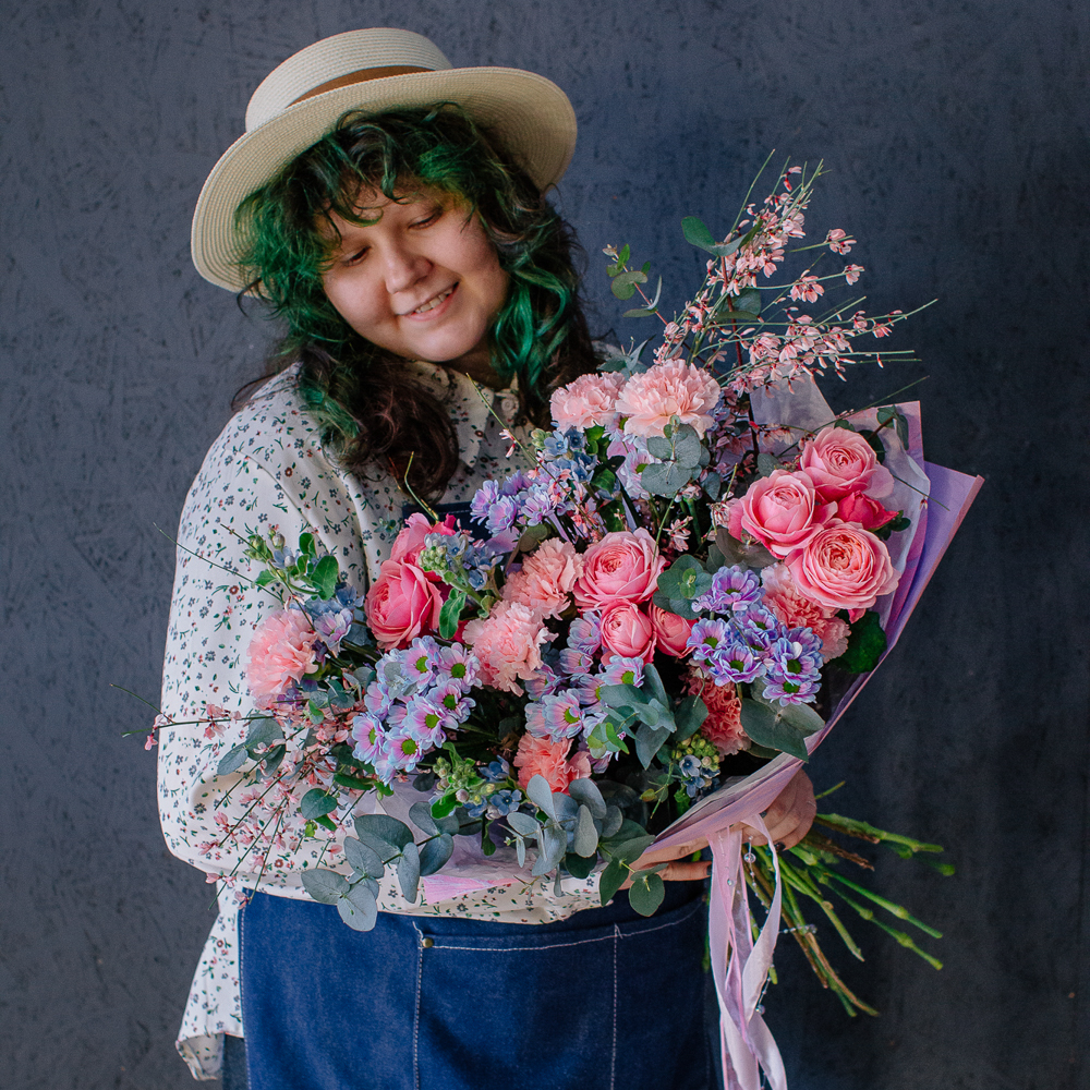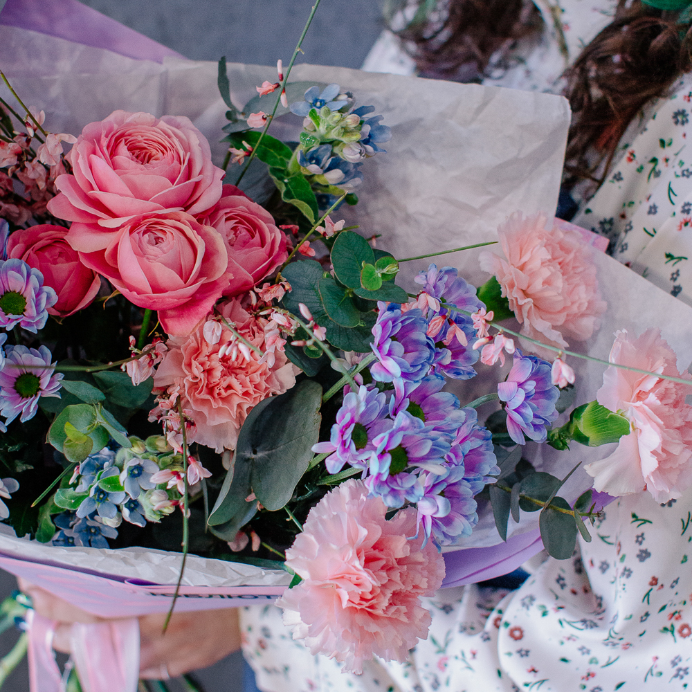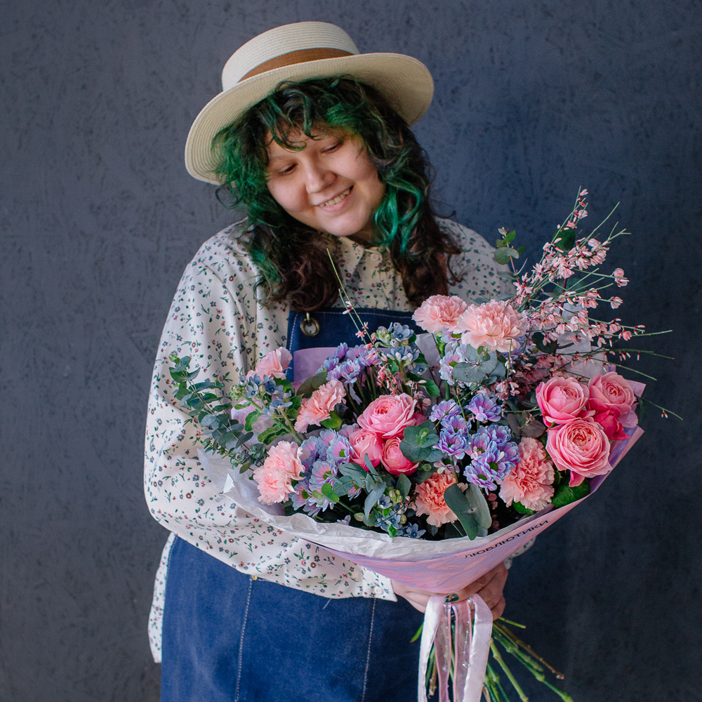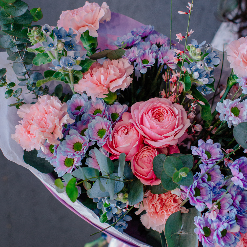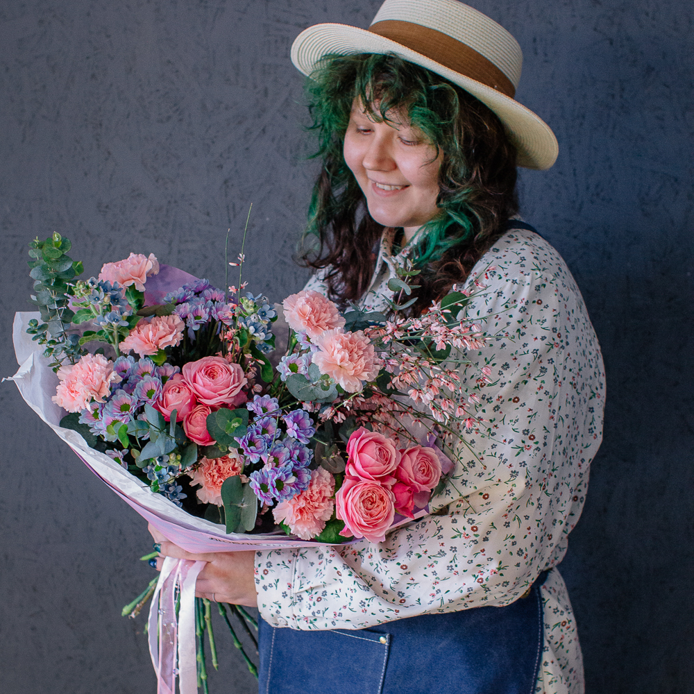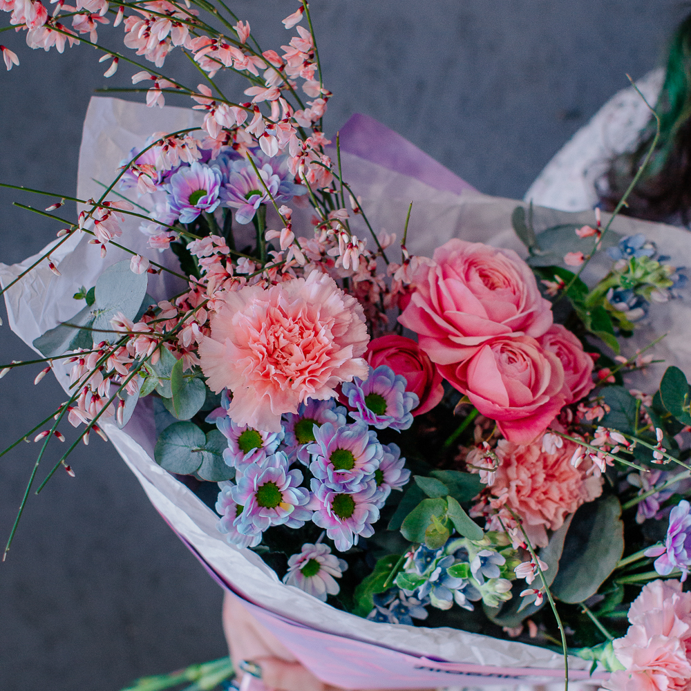 В нём собраны красивые пионовидные кустовые розы, аккуратные хризантемы сантини, нежные диантусы, изящный оксипеталум, воздушная гениста и ароматный эвкалипт - всё вместе создаёт мягкий, романтичный и при этом живой образ.