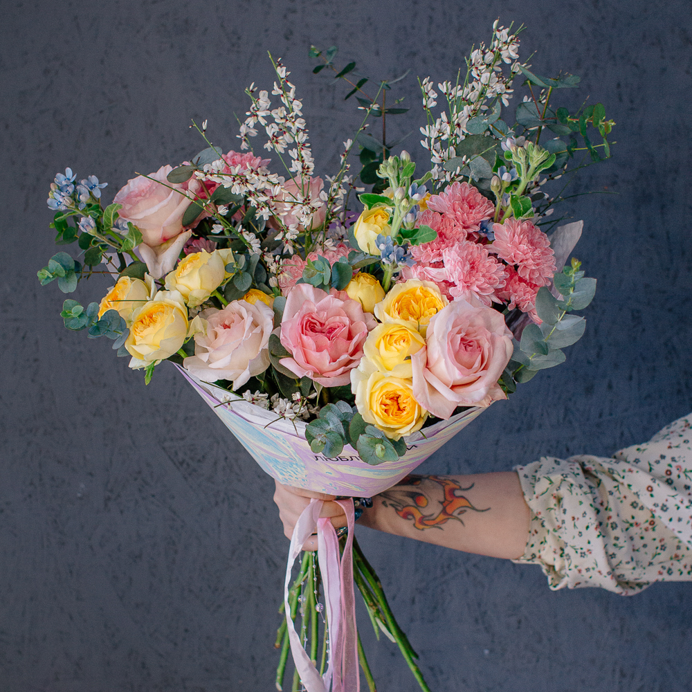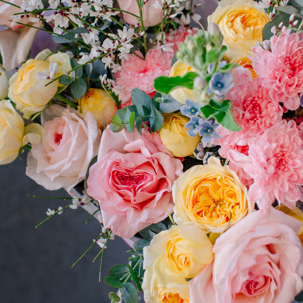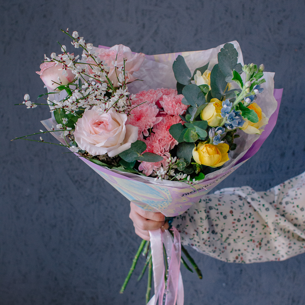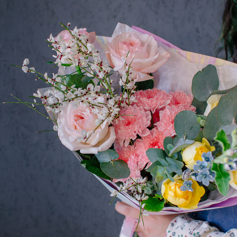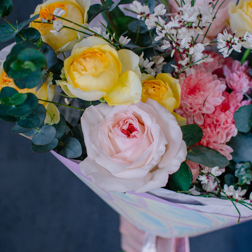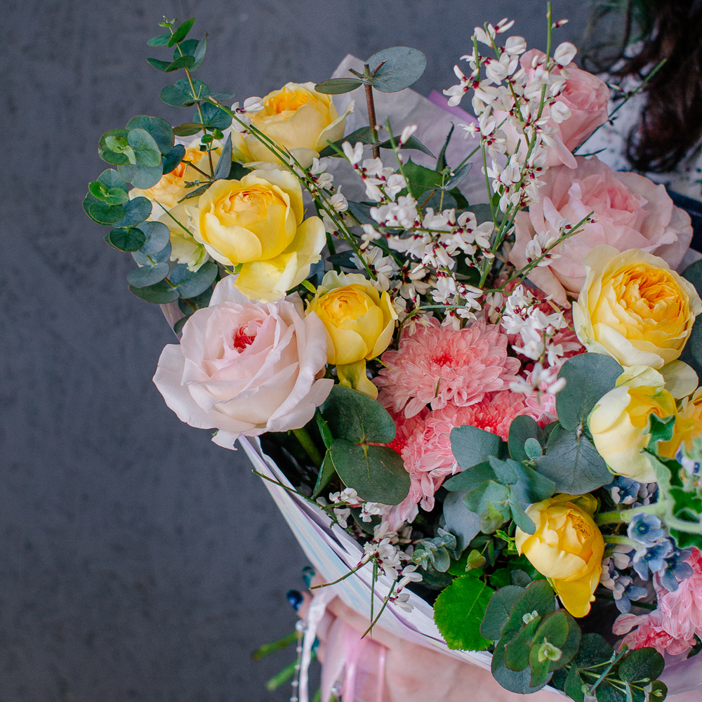 Собран из ароматных пионовидных одноголовых и кустовых роз, стойкой кустовой хризантемы, изящного оксипеталума, воздушной генисты и зеленого эвкалипта.
