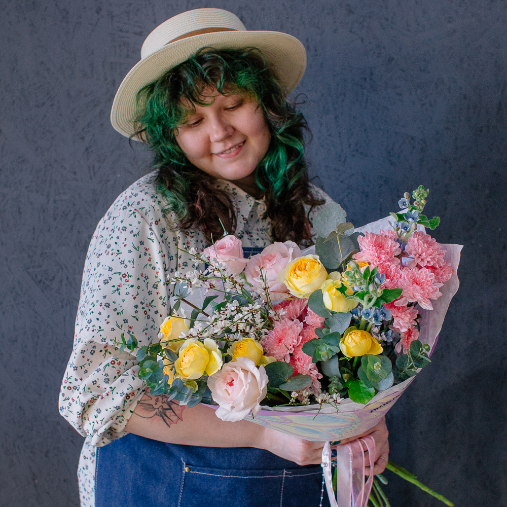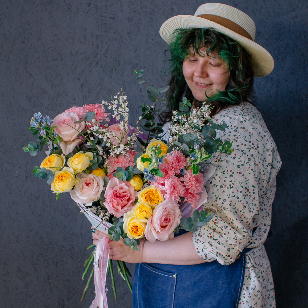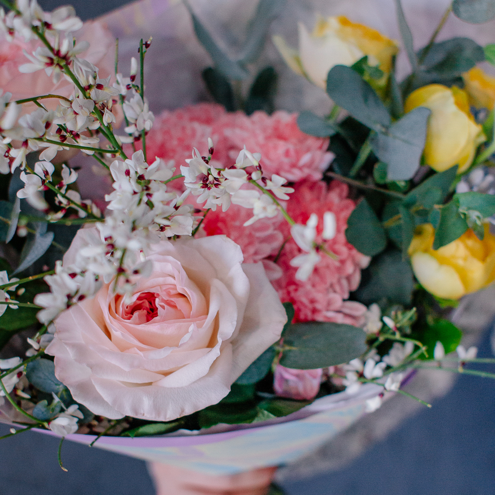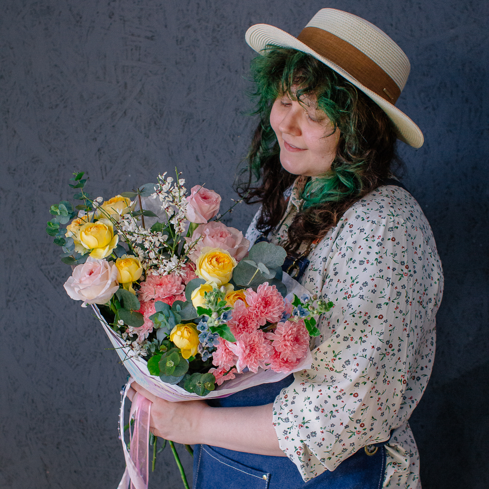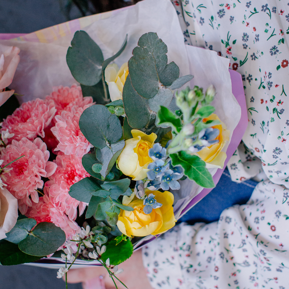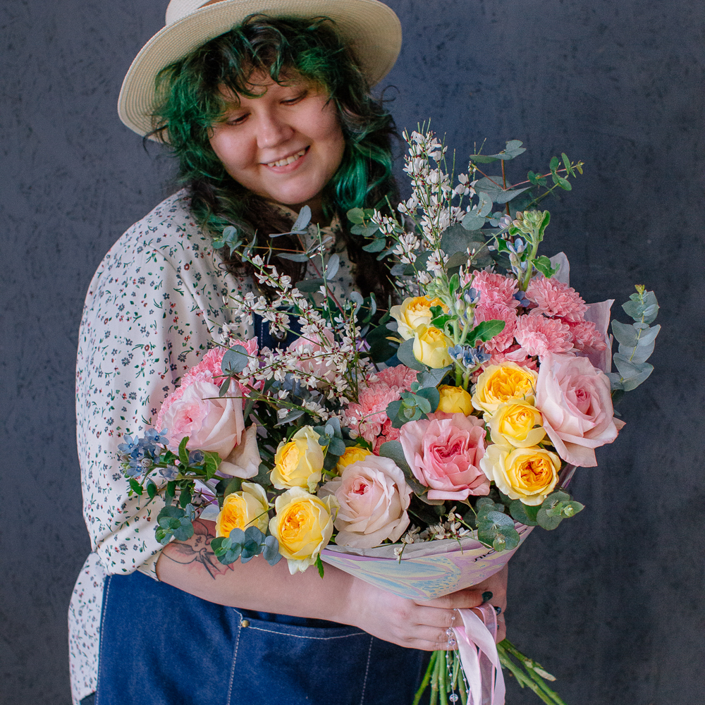 Собран из ароматных пионовидных одноголовых и кустовых роз, стойкой кустовой хризантемы, изящного оксипеталума, воздушной генисты и зеленого эвкалипта.