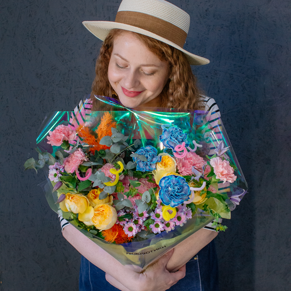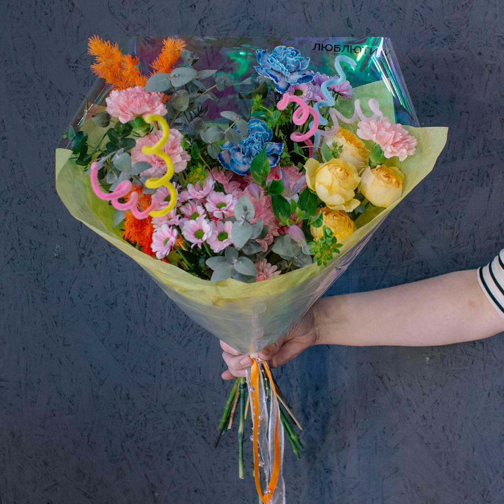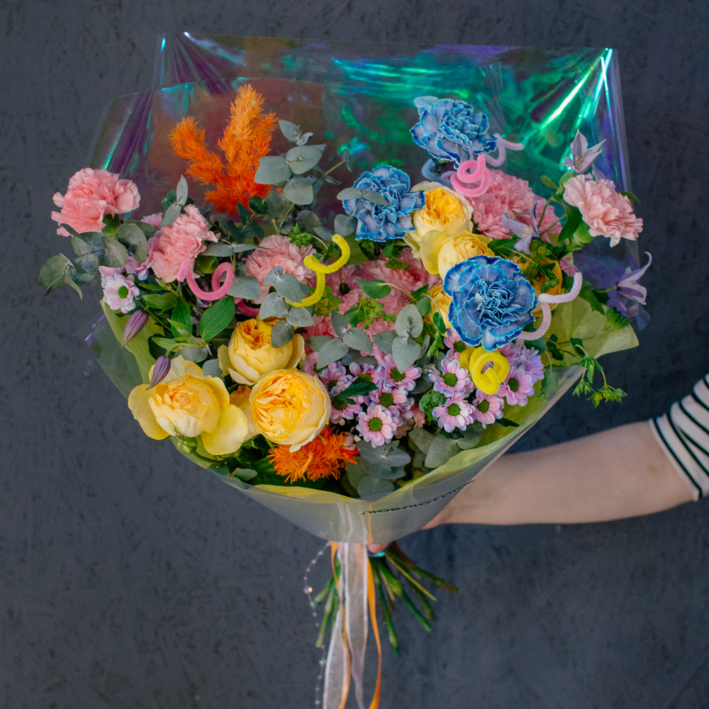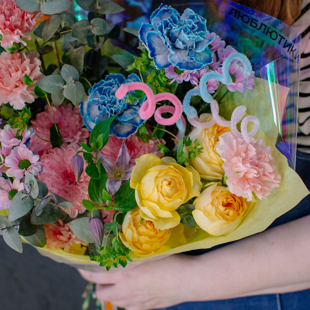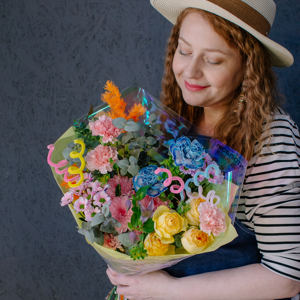 Главные проказники букета - забавные пушистые пружинки. Они выглядывают то тут, то там, добавляя композиции движения и игривости. Эти цветные непоседы так и просятся, чтобы им улыбнулись.