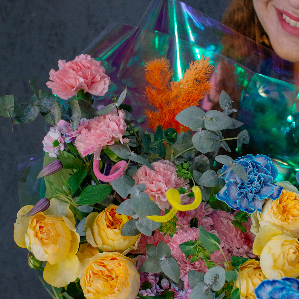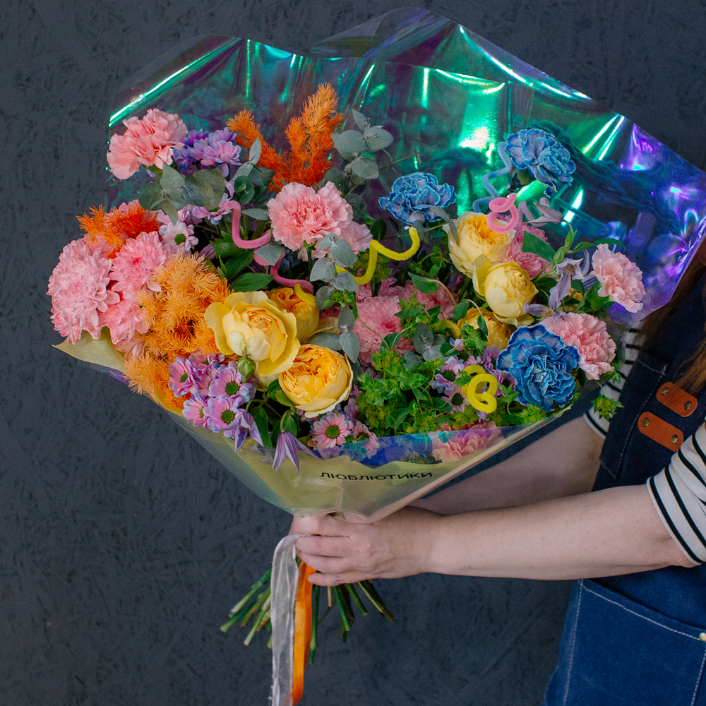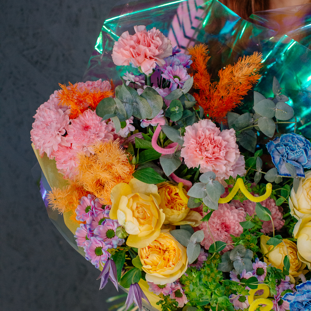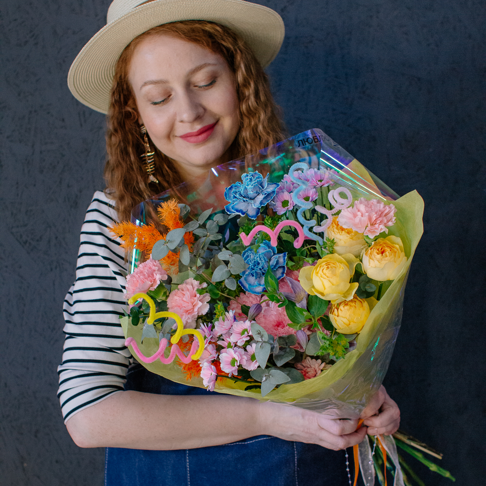 Главные проказники букета - забавные пушистые пружинки. Они выглядывают то тут, то там, добавляя композиции движения и игривости. Эти цветные непоседы так и просятся, чтобы им улыбнулись.