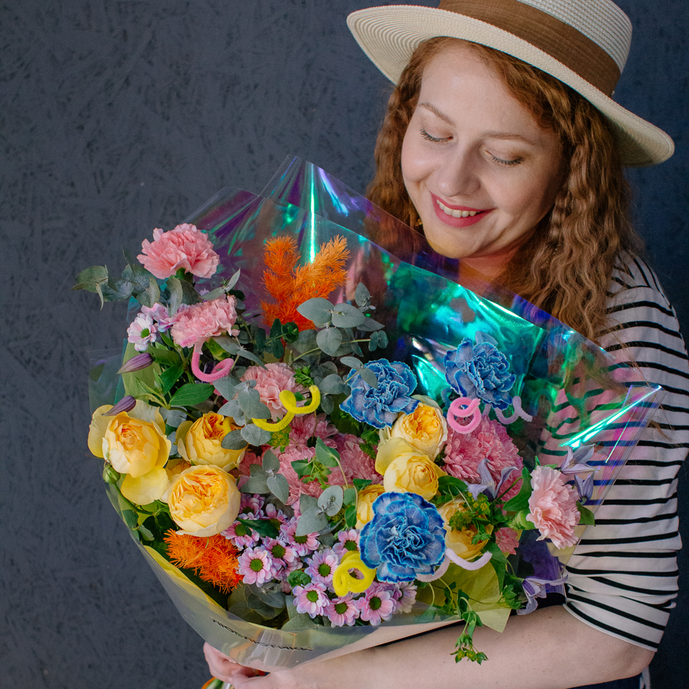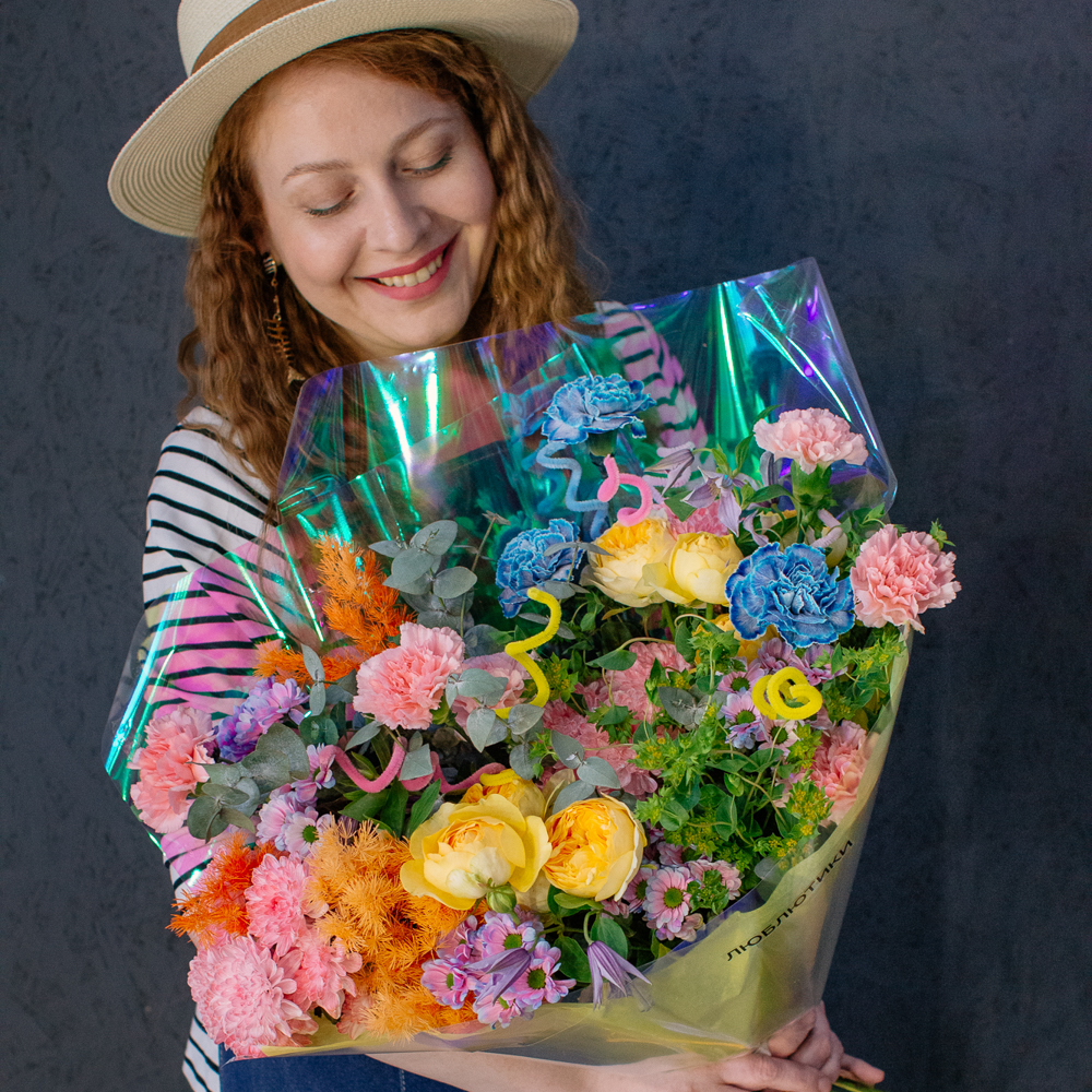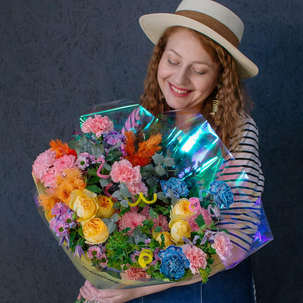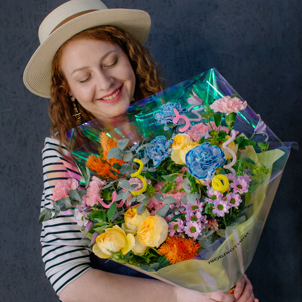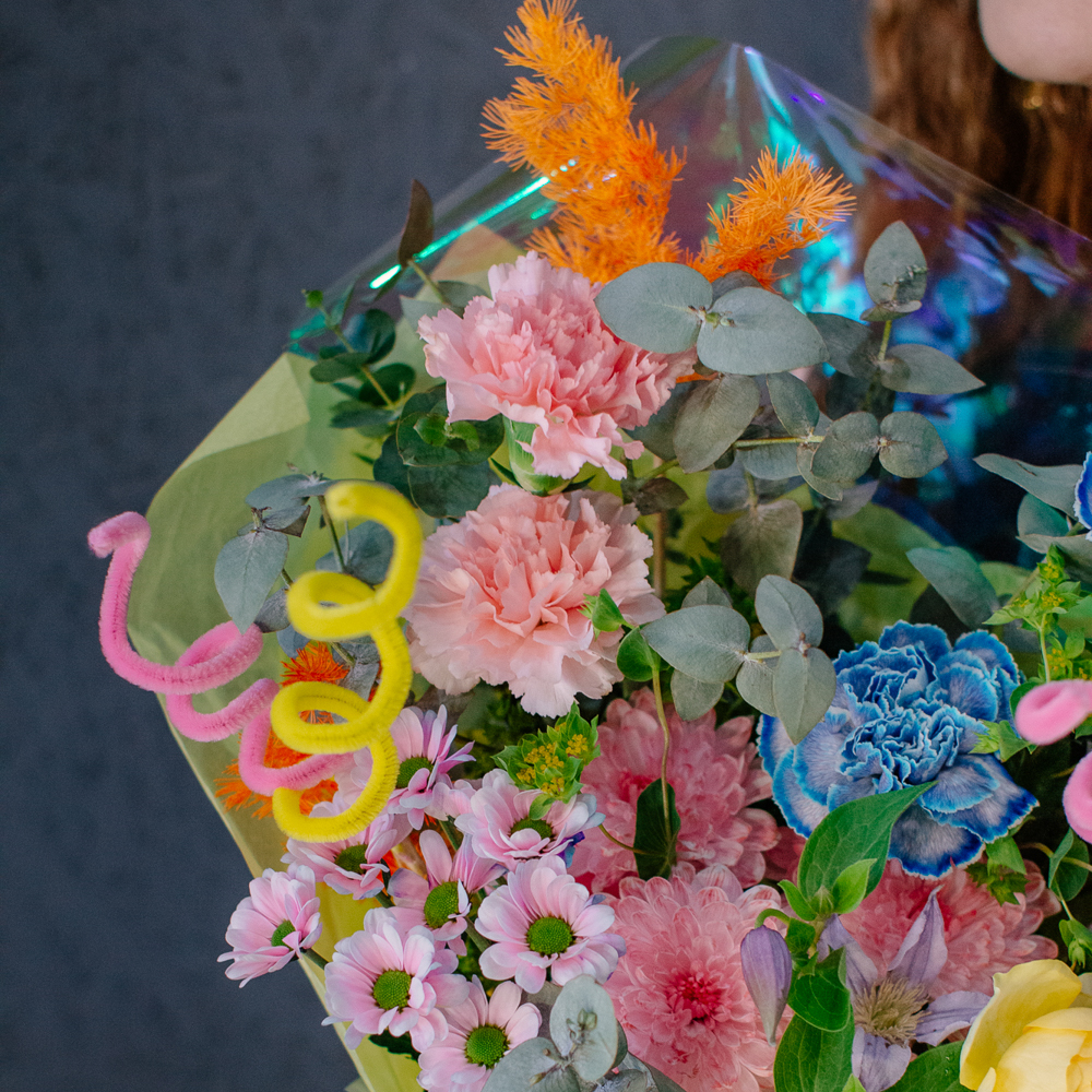 Главные проказники букета - забавные пушистые пружинки. Они выглядывают то тут, то там, добавляя композиции движения и игривости. Эти цветные непоседы так и просятся, чтобы им улыбнулись.