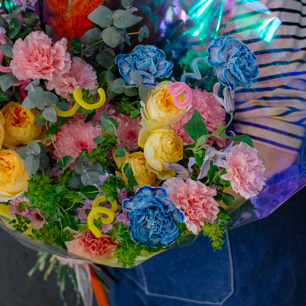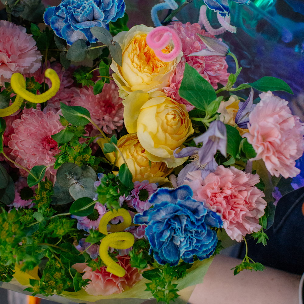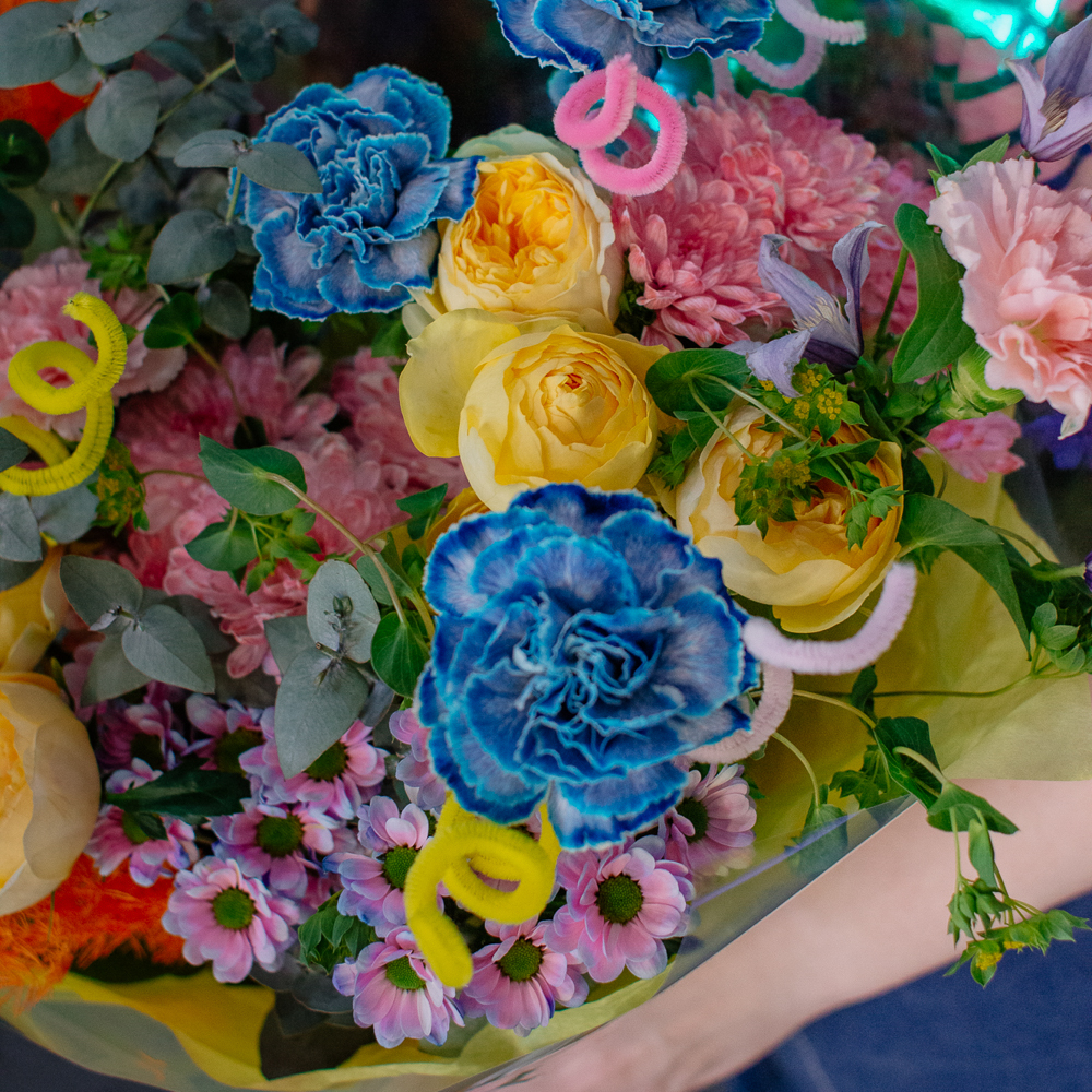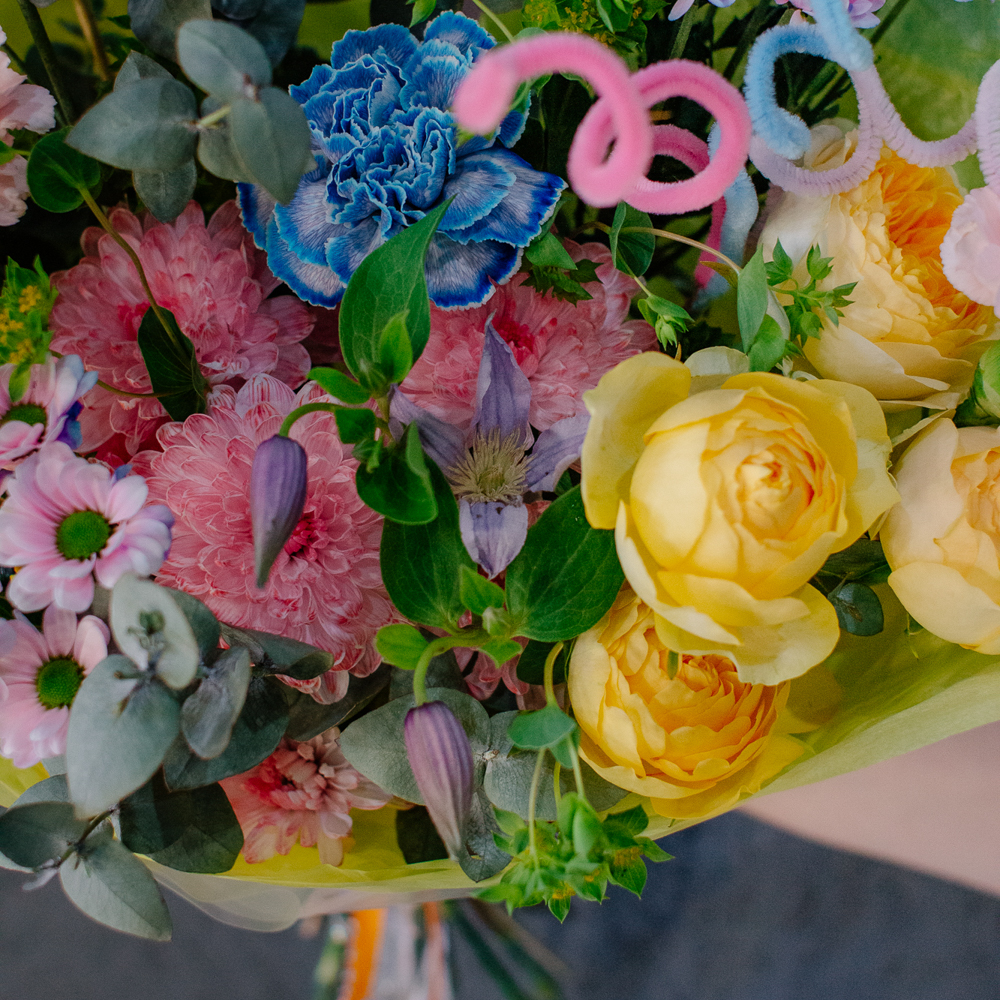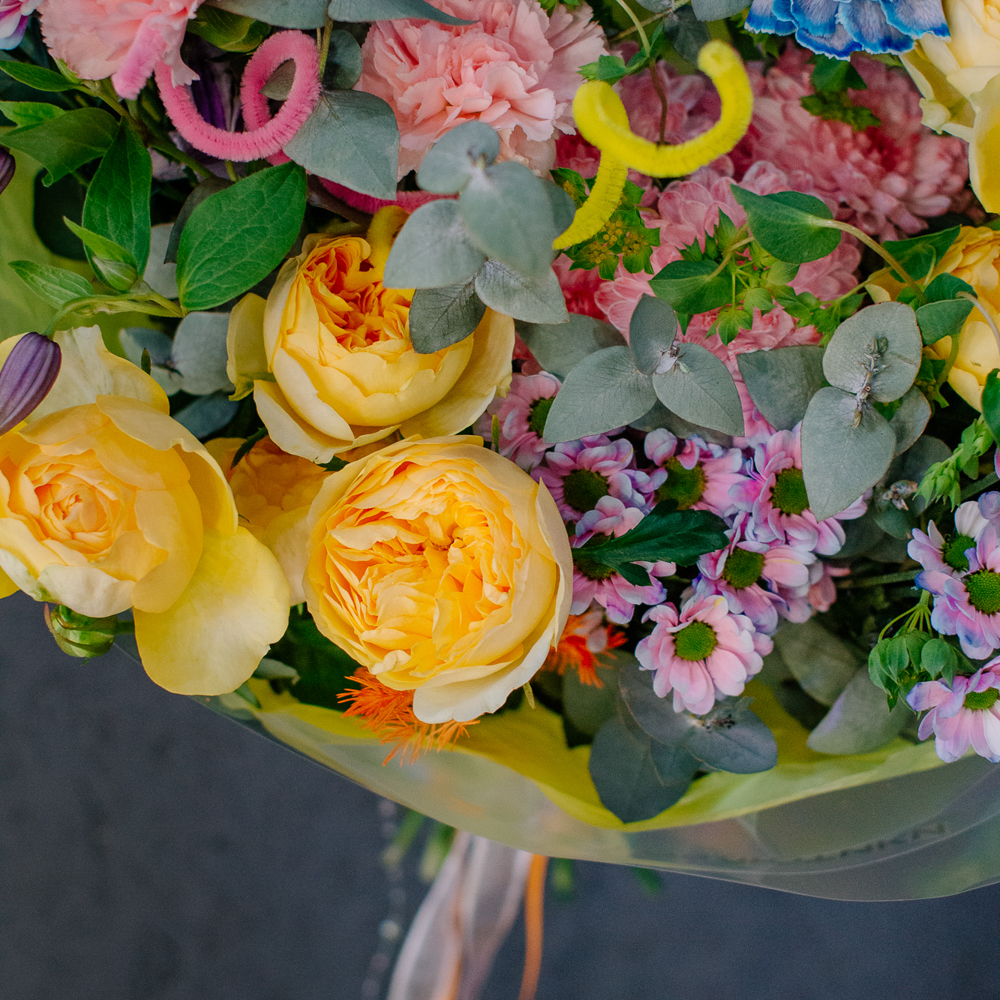 Главные проказники букета - забавные пушистые пружинки. Они выглядывают то тут, то там, добавляя композиции движения и игривости. Эти цветные непоседы так и просятся, чтобы им улыбнулись.
