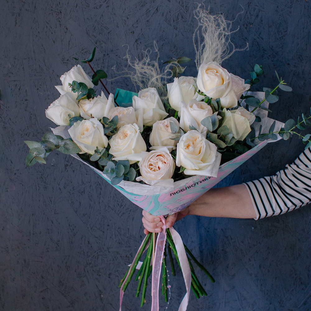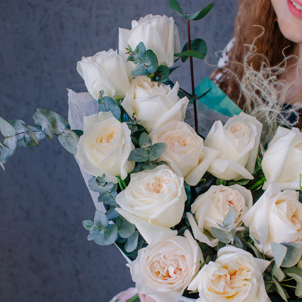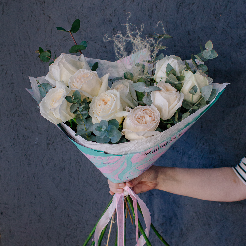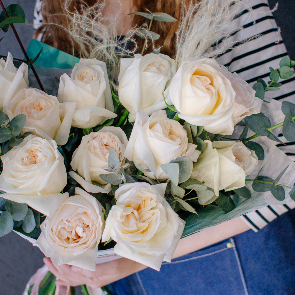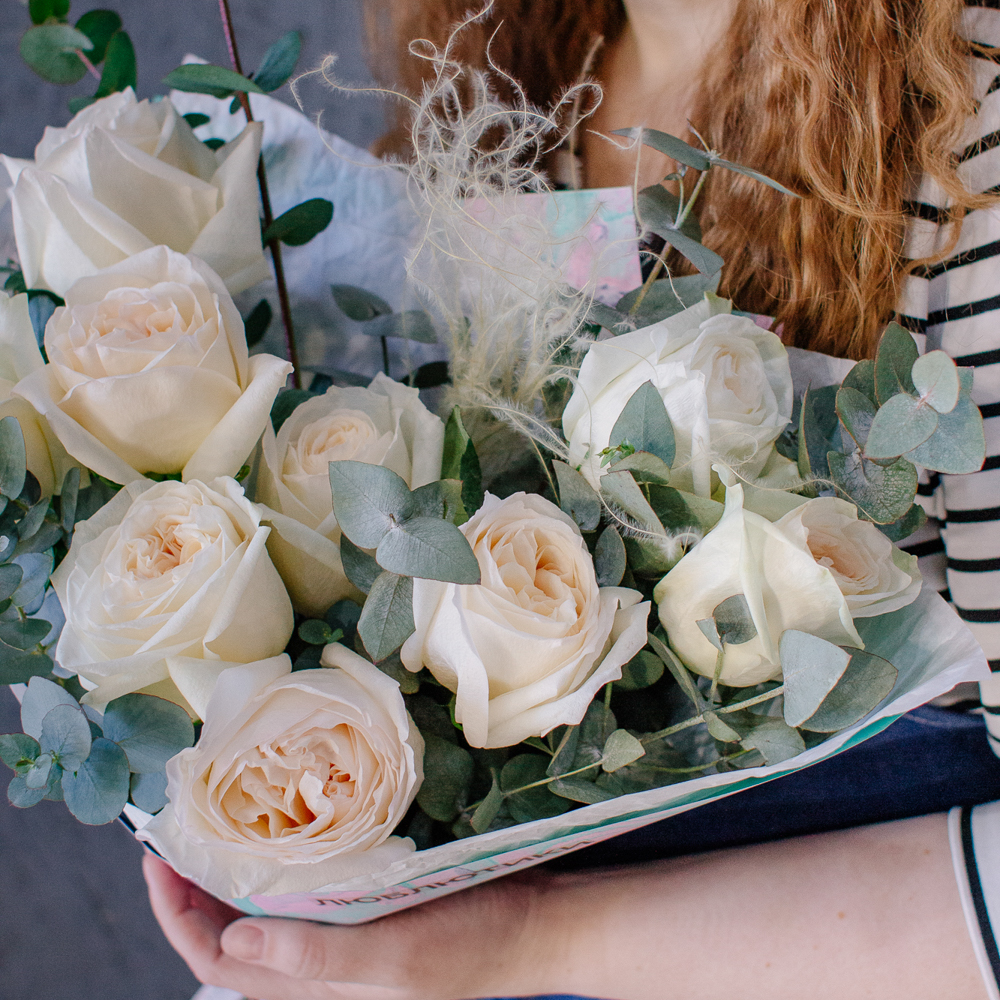 Пышные пионовидные розы с насыщенным ароматом создают мягкий объём и романтичное настроение, а веточки эвкалипта добавляют композиции свежесть и красивый зелёный акцент.