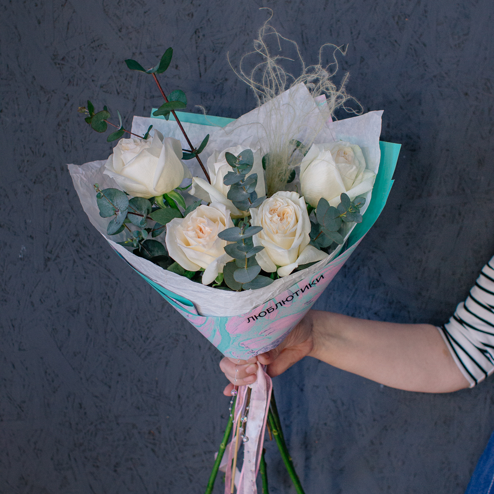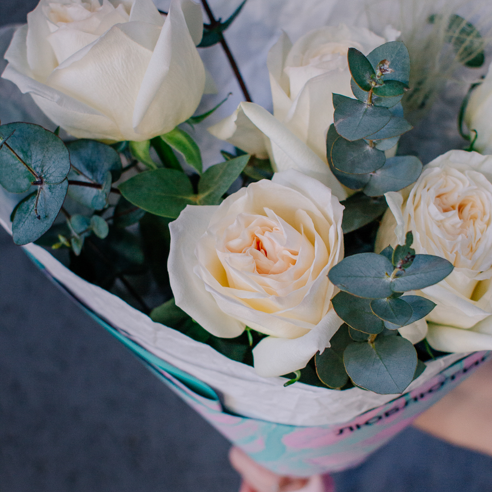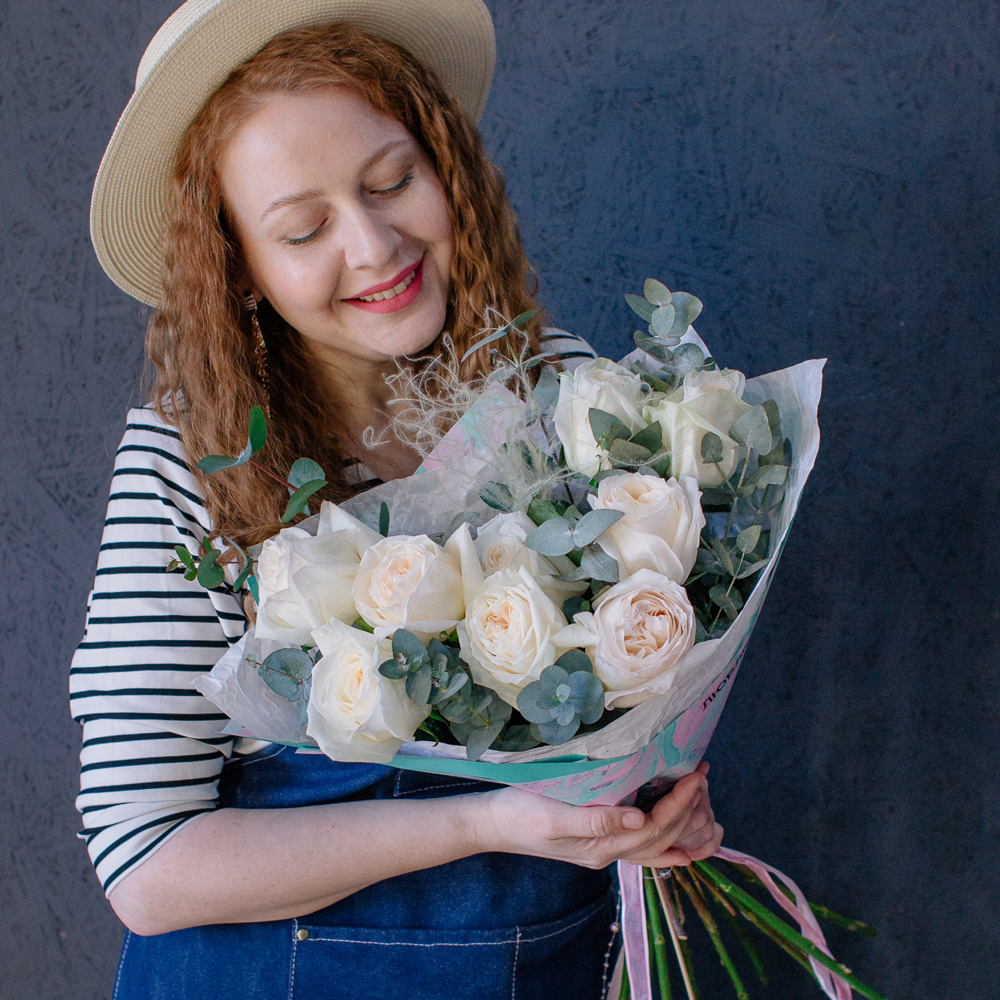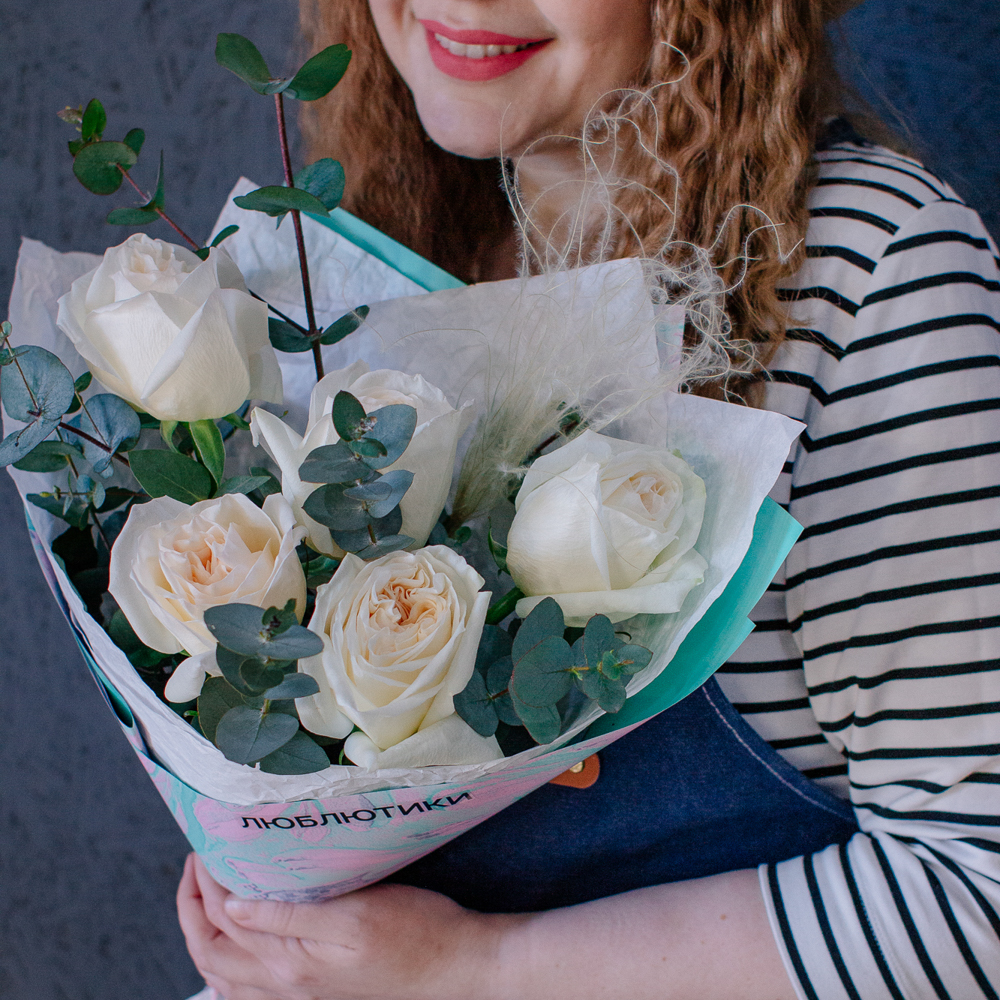 Пышные пионовидные розы с насыщенным ароматом создают мягкий объём и романтичное настроение, а веточки эвкалипта добавляют композиции свежесть и красивый зелёный акцент.