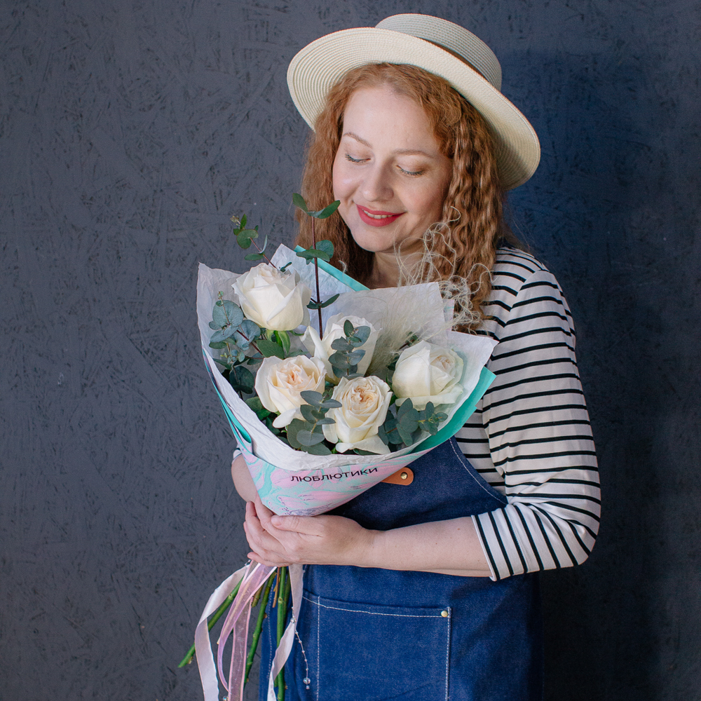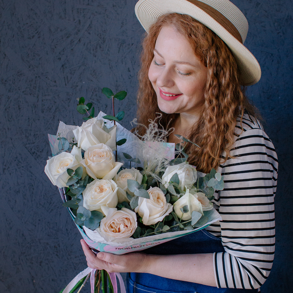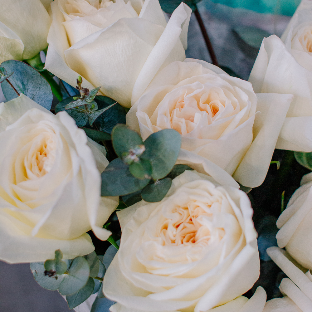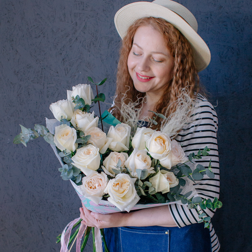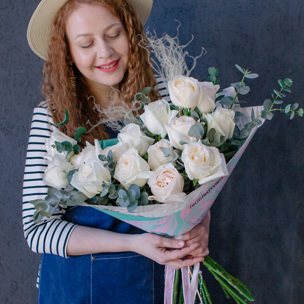 Пышные пионовидные розы с насыщенным ароматом создают мягкий объём и романтичное настроение, а веточки эвкалипта добавляют композиции свежесть и красивый зелёный акцент.