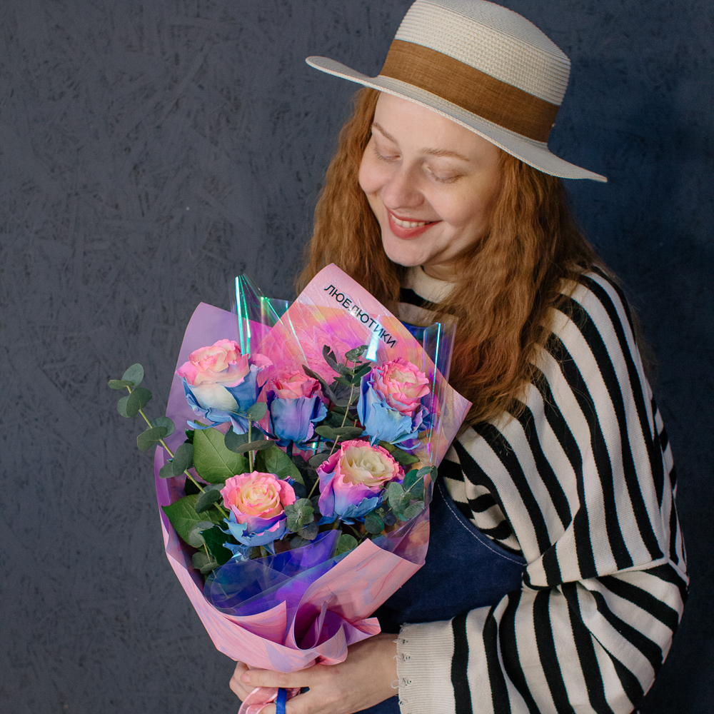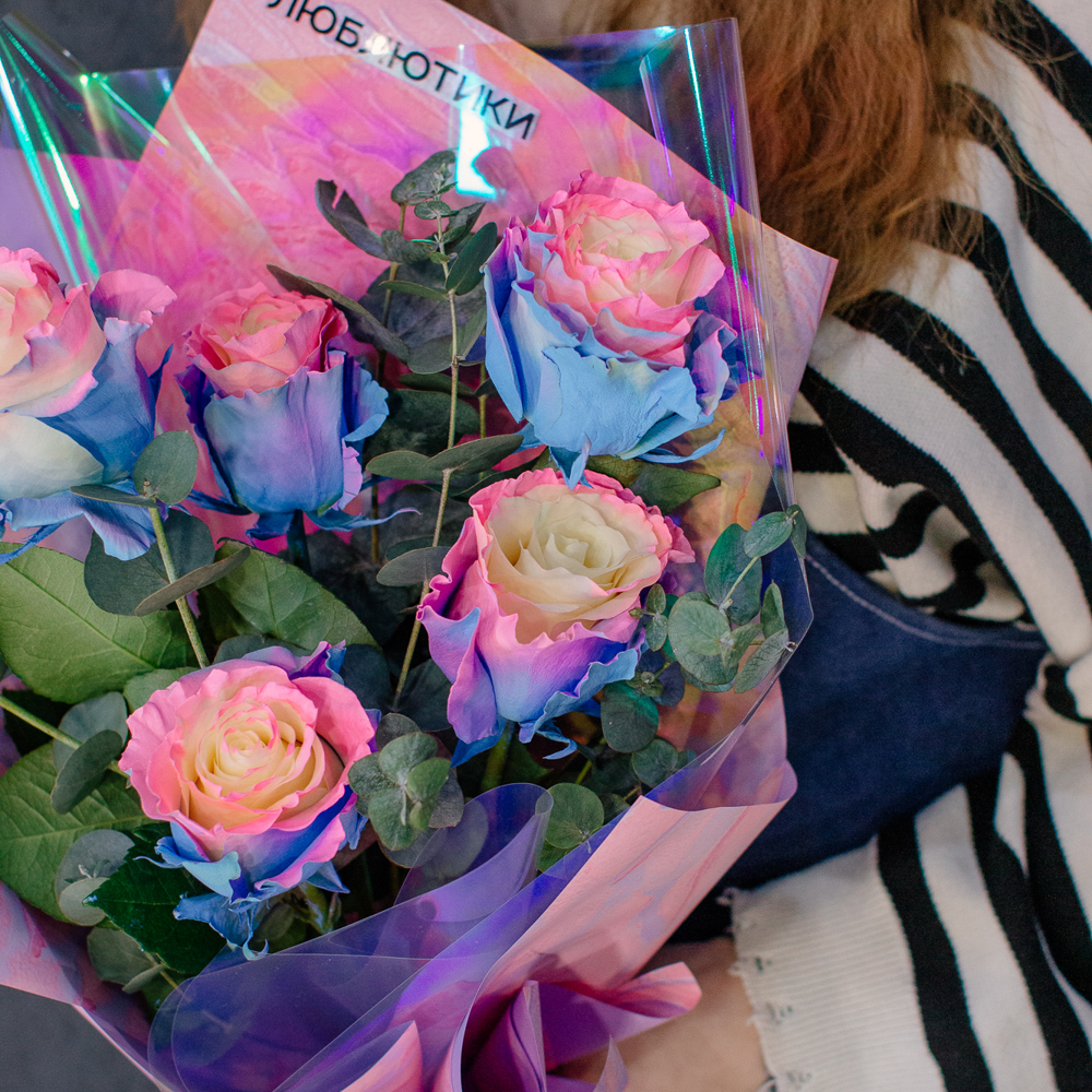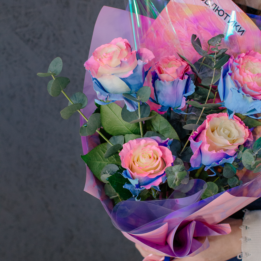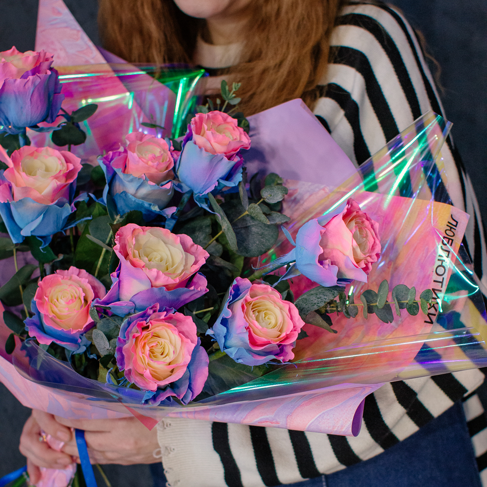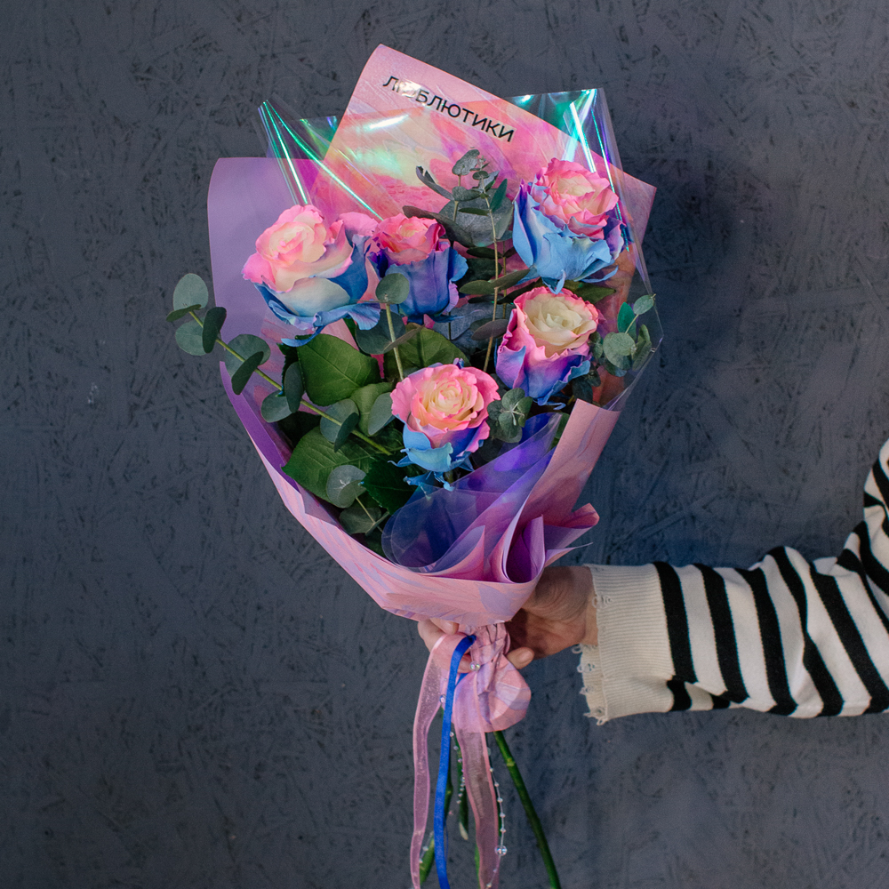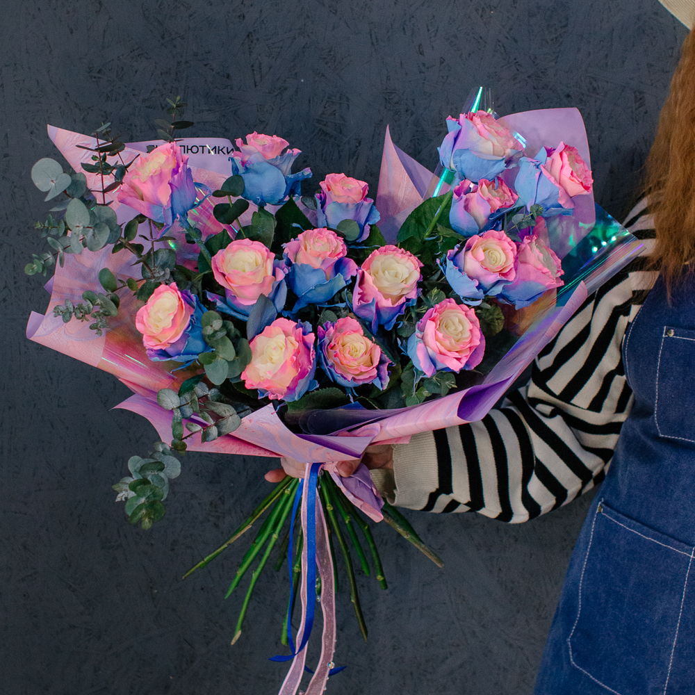 Перед вами букет, который дарит ощущение безмятежного счастья и летнего утра. Нежные розы сорта Барби с их уникальным розово-голубым оттенком, напоминающим рассветное небо, собраны в изящную композицию. Каждый бутон словно светится изнутри, даря тепло и радость.