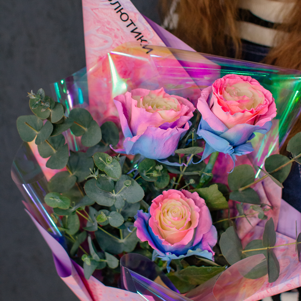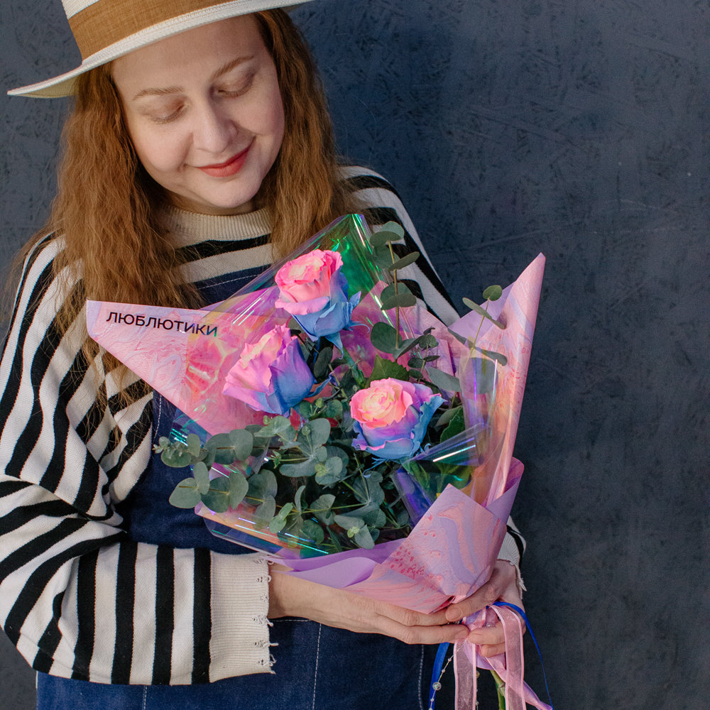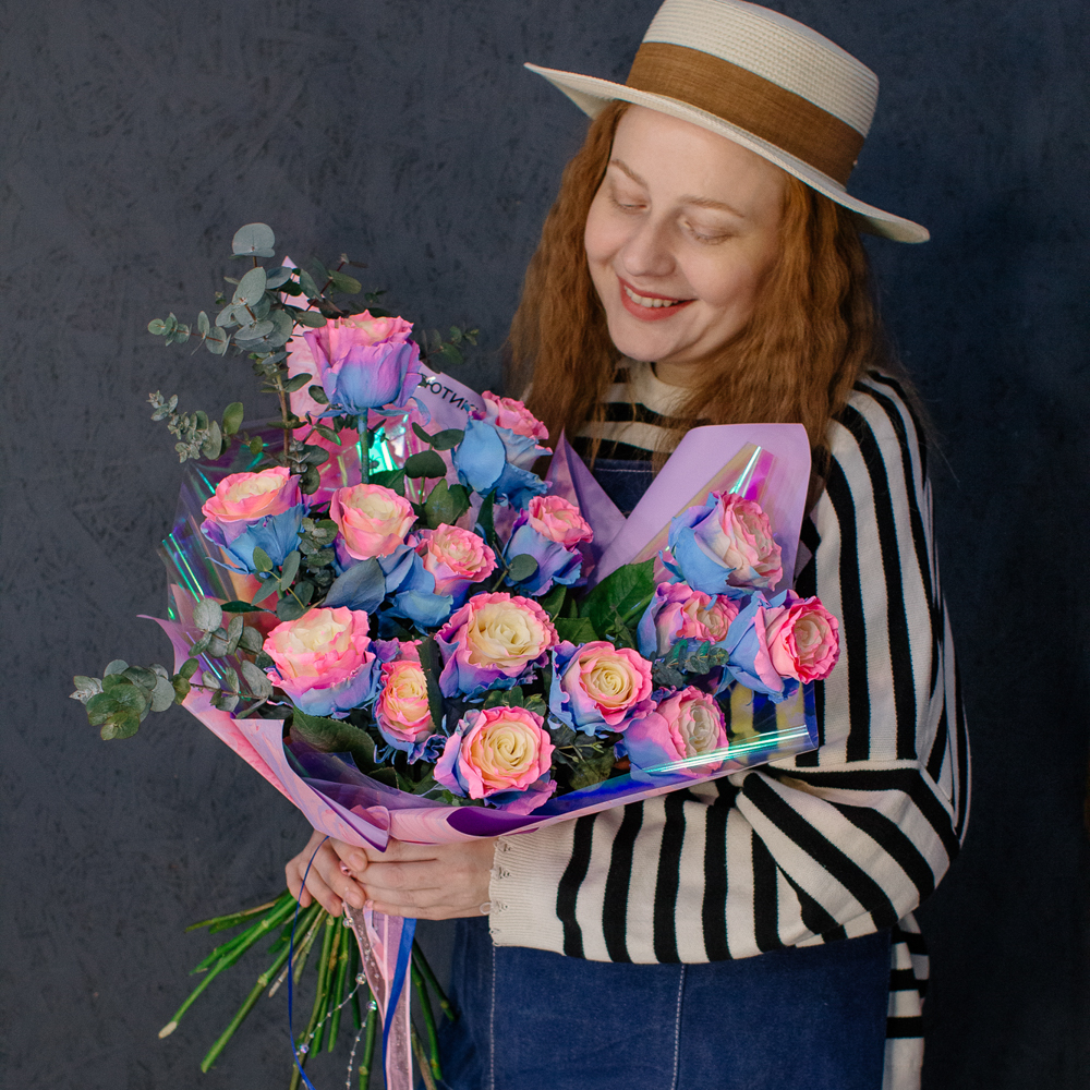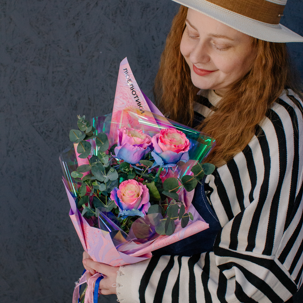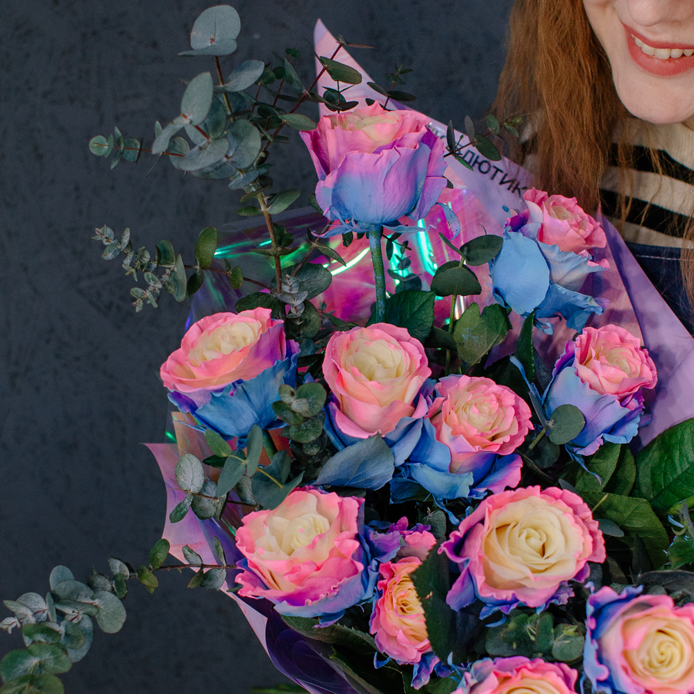 Перед вами букет, который дарит ощущение безмятежного счастья и летнего утра. Нежные розы сорта Барби с их уникальным розово-голубым оттенком, напоминающим рассветное небо, собраны в изящную композицию. Каждый бутон словно светится изнутри, даря тепло и радость.