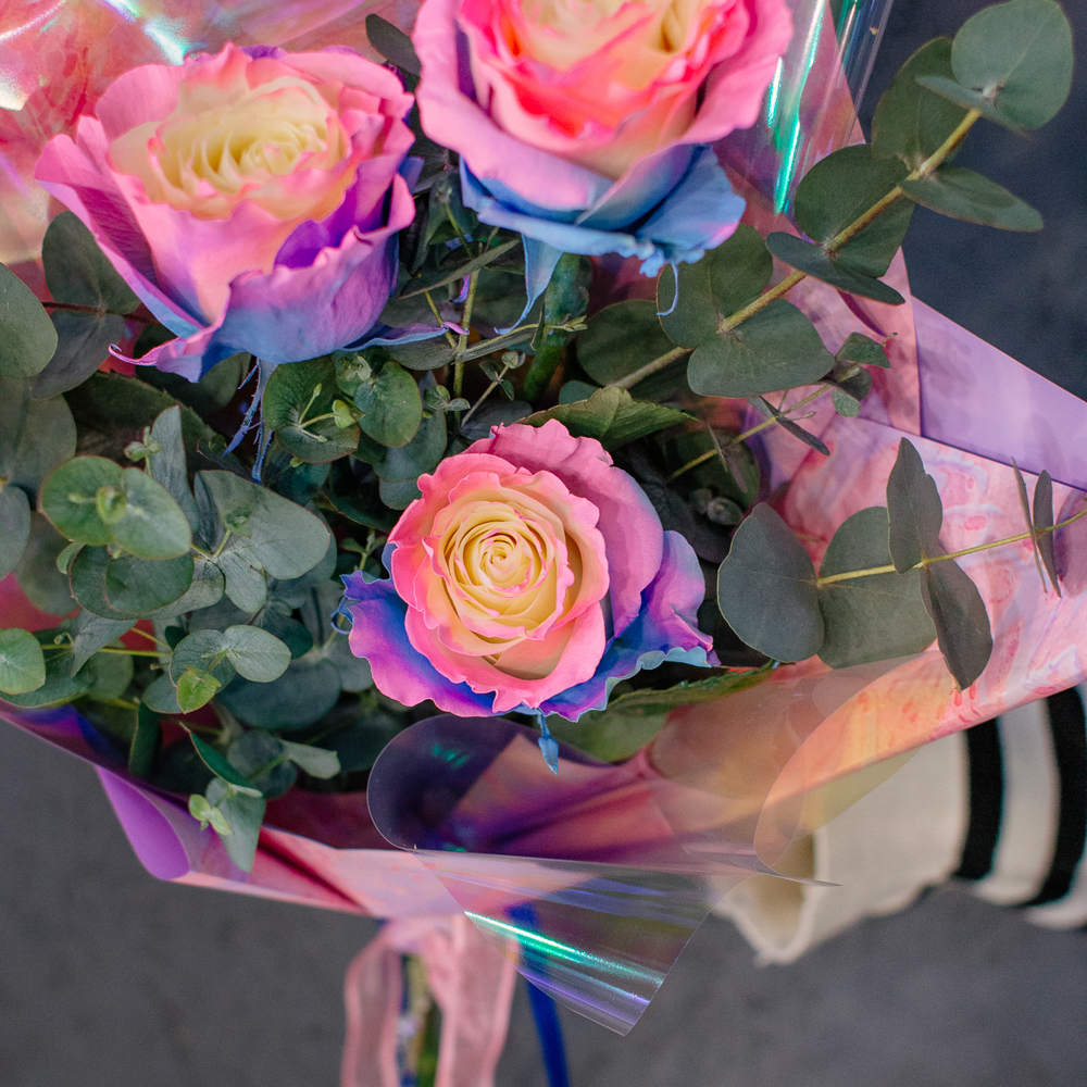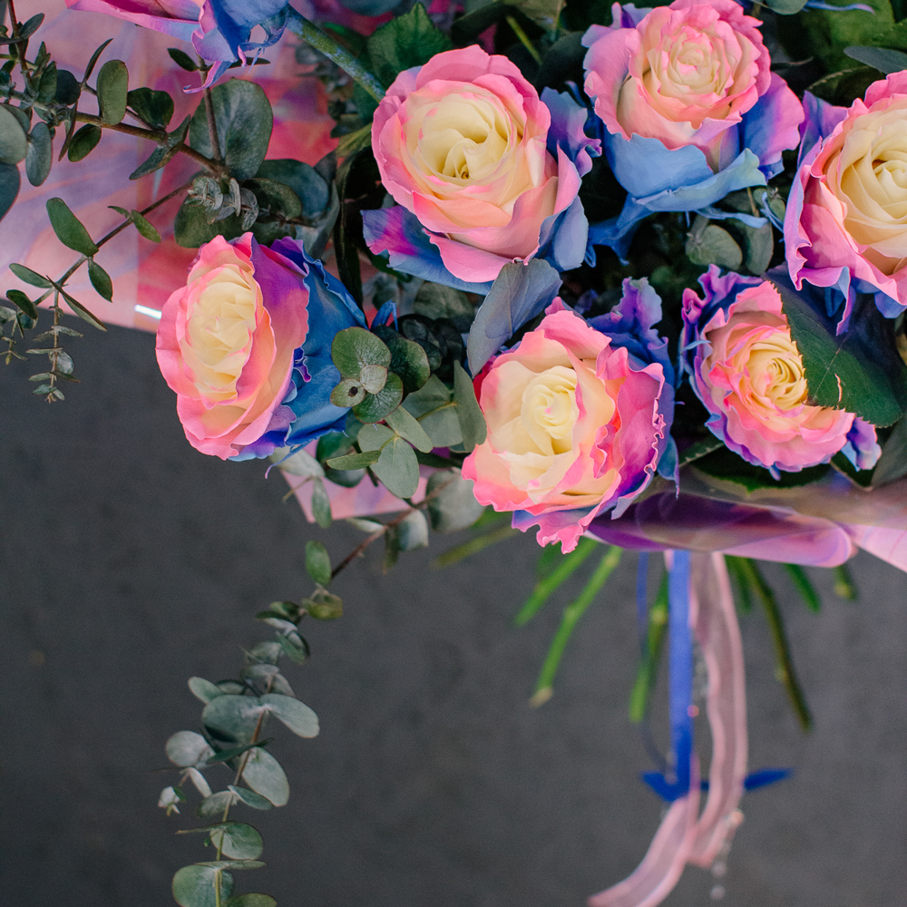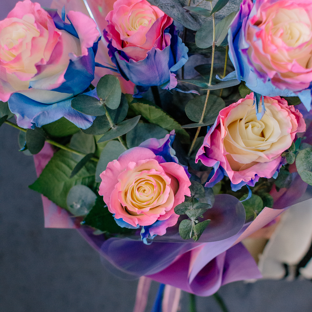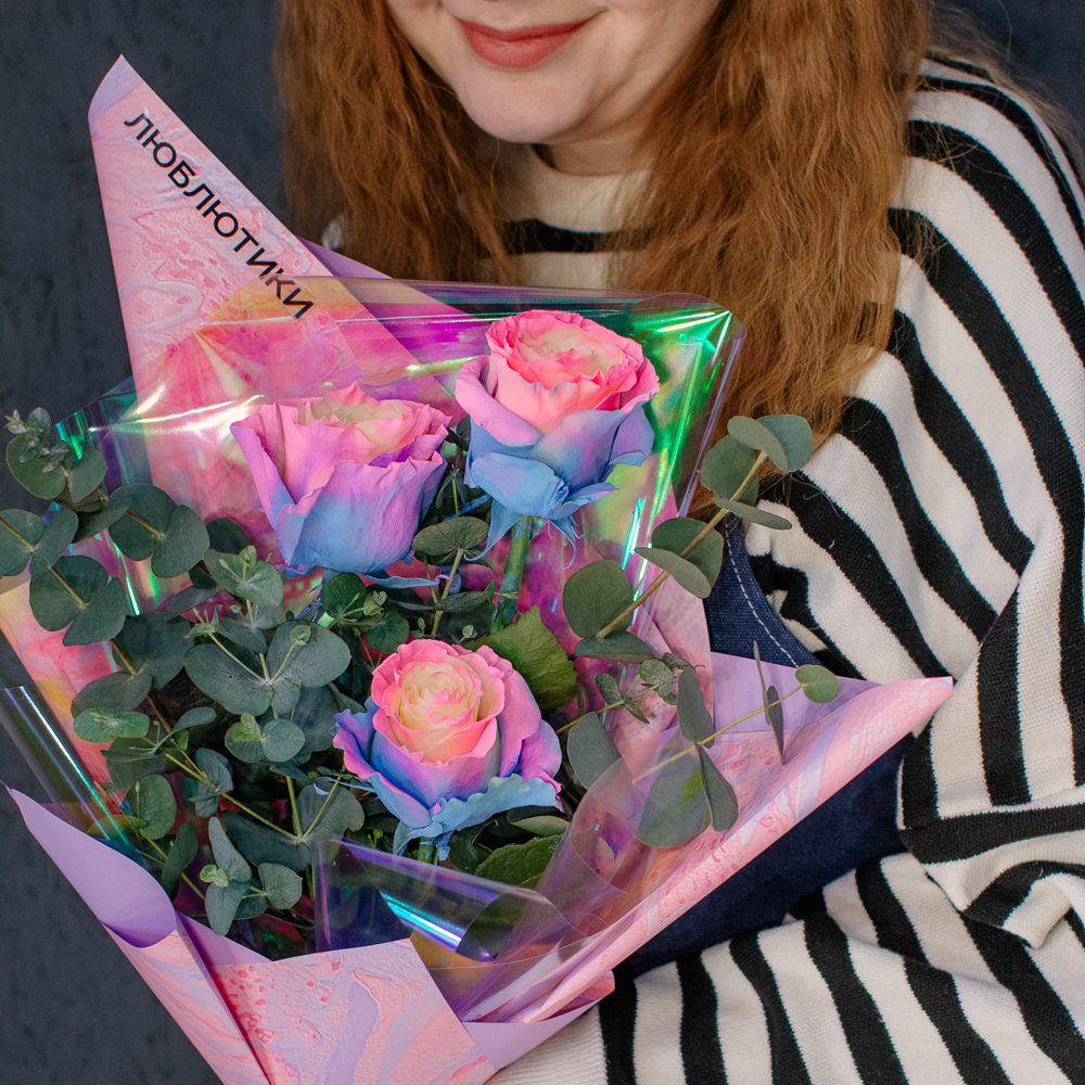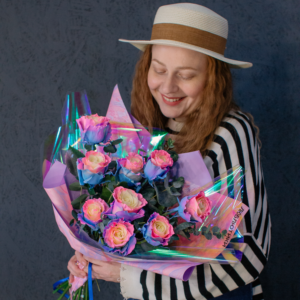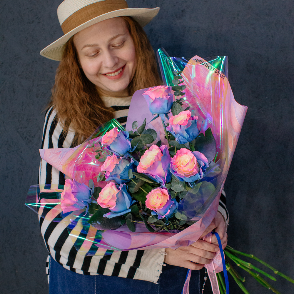 Перед вами букет, который дарит ощущение безмятежного счастья и летнего утра. Нежные розы сорта Барби с их уникальным розово-голубым оттенком, напоминающим рассветное небо, собраны в изящную композицию. Каждый бутон словно светится изнутри, даря тепло и радость.